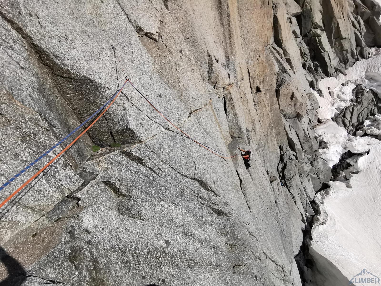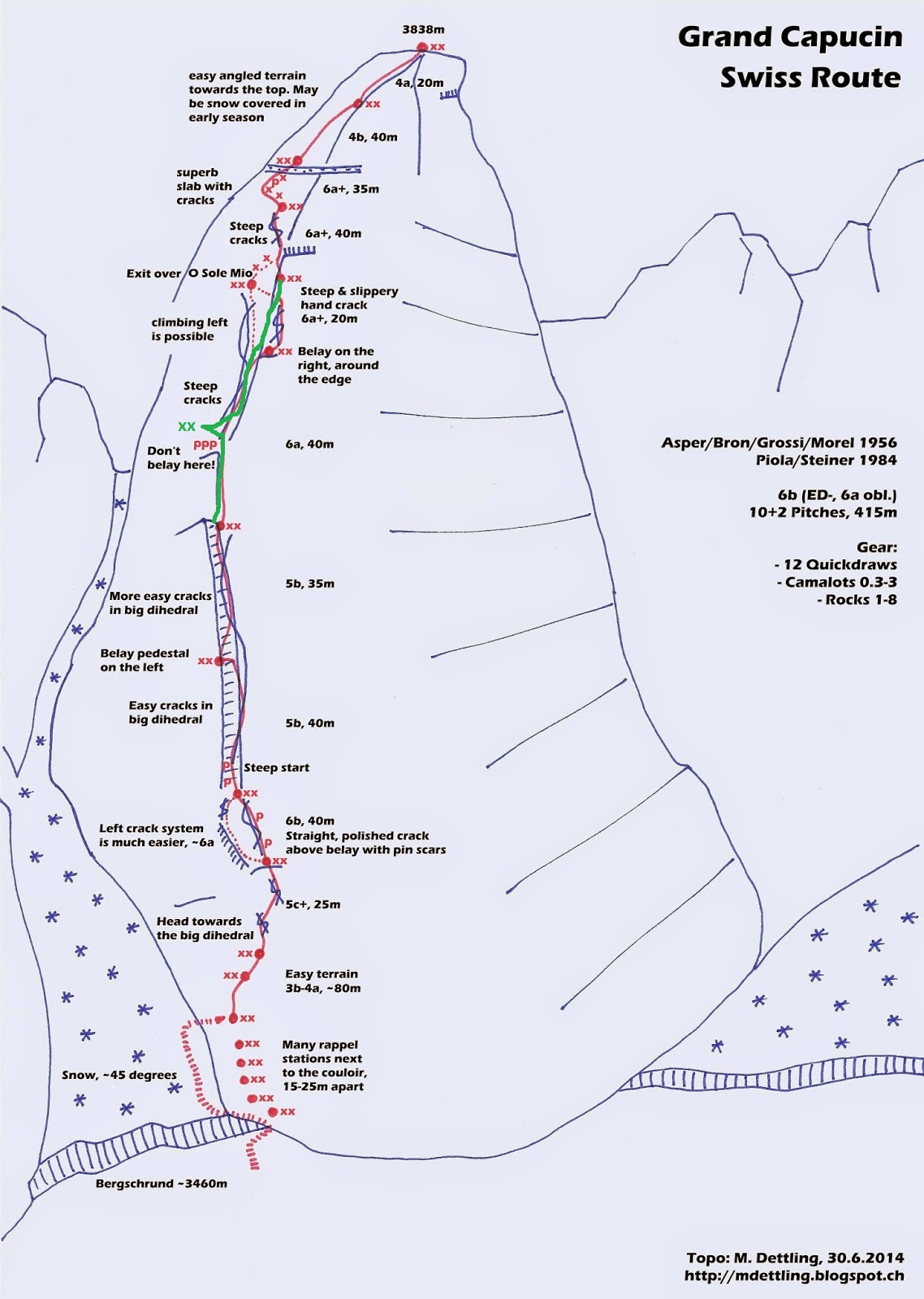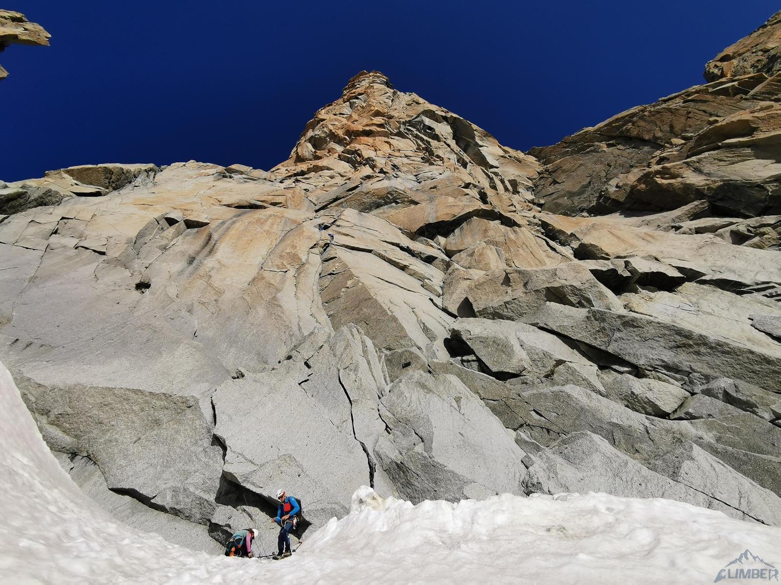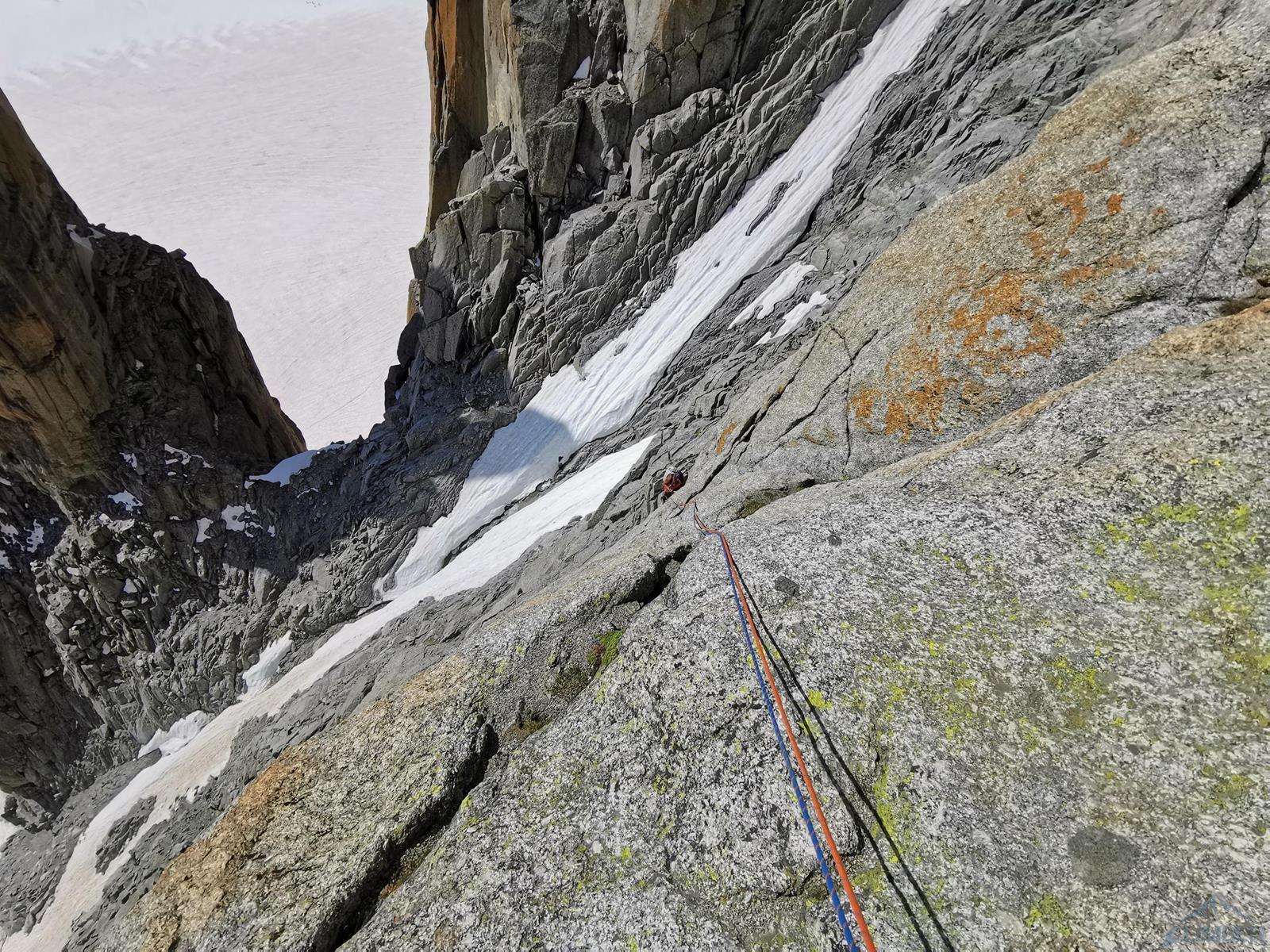 Na drogę wybieramy się dwa dni po wspinaniu na Małym Kapucynie (RELACJA) – ponownie wyjeżdżamy więc na Helbronner i po przejściu lodowca stajemy pod imponującym murem Grand Capa. Pod Drogę Szwajcarską dostać można się trawersując dolną częścią ściany lub podchodząc Kuluarem Aiguillettes – wielkość szczeliny pod nim, spadające kamienie oraz planowany powrót zjazdami sprawiają, że decydujemy się na pierwszą opcję. Raki, dziaby oraz zbędne rzeczy pozostawiamy na Tarasie Francesco – z powodu niskiego stanu lodowca tym razem trzeba się do niego wspiąć (ok. 5a) jakieś 15 metrów.