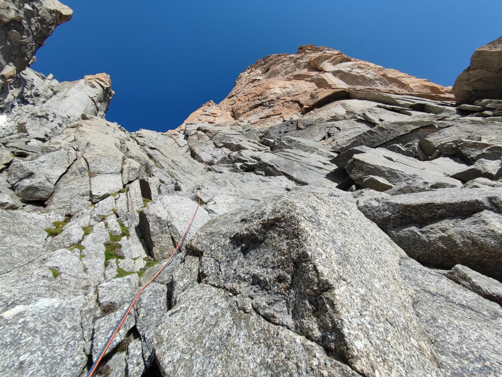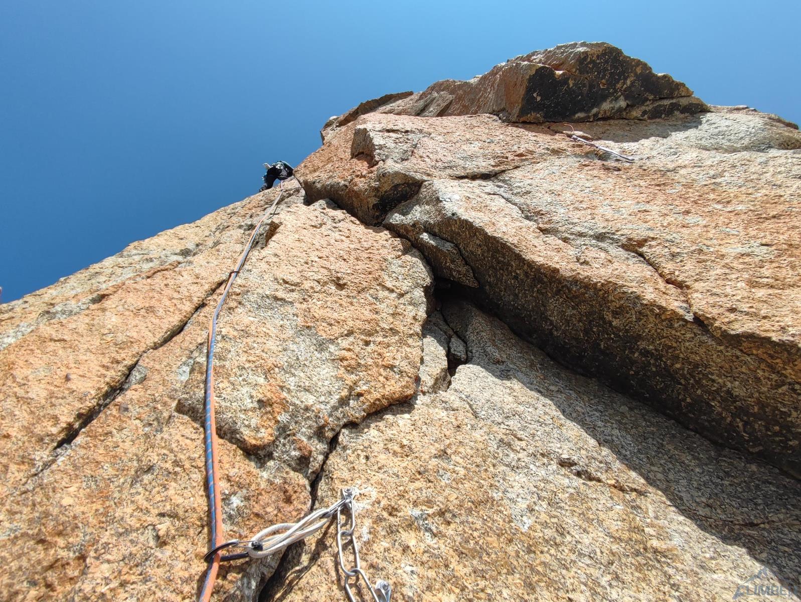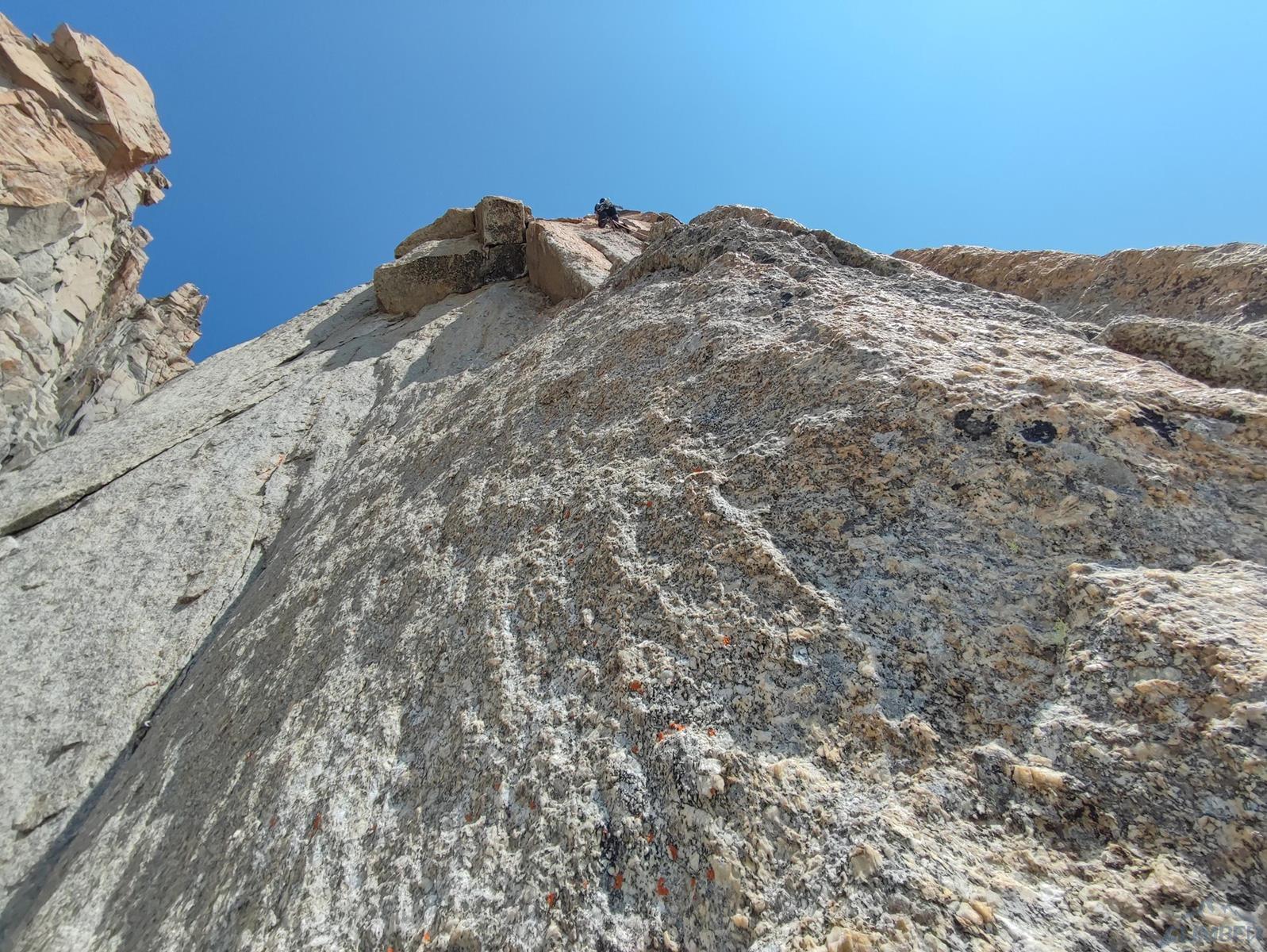 Ze stanowiska pod okap kontynuuje Droga Szwajcarska (widać pętlę) – jeżeli pójdziemy tam czeka nas odcinek za 6b i A0 (klasycznie ok. 7b), dlatego też popularniejszym i logiczniejszym wariantem jest kontynuowanie od tego miejsca linią O Sole Mio. Ruszamy do góry w lewo przepięknymi rysami (do 6a+), które zaprowadzą nas do kolejnego stanu. Stąd wzdłuż spitów stromą ścianką z krawądkami (6a+) i skośną rysą pod tarciową płytkę (6a+), po przejściu której wylądujemy na dużej zagruzowanej półce. Nad nami dwa ostatnie, łatwe (4b i 4a) wyciągi – łączymy je w jeden, brakujące metry do stanowiska pokonując na lotnej. Kierujemy się popękanymi płytami z odchyleniem w prawo, mijamy stan i przewijamy się za kant – kilka metrów wyżej wchodzimy na grań, która zaprowadzi nas na szczyt Kapucyna.