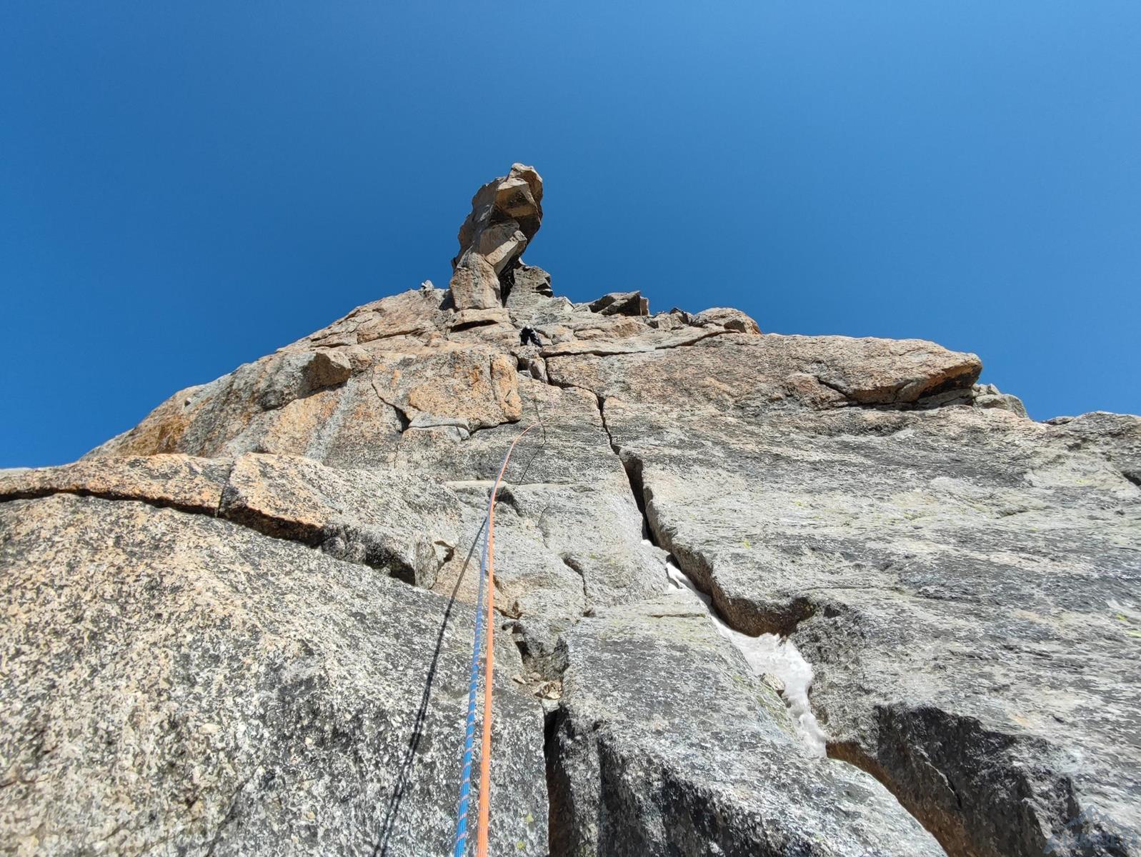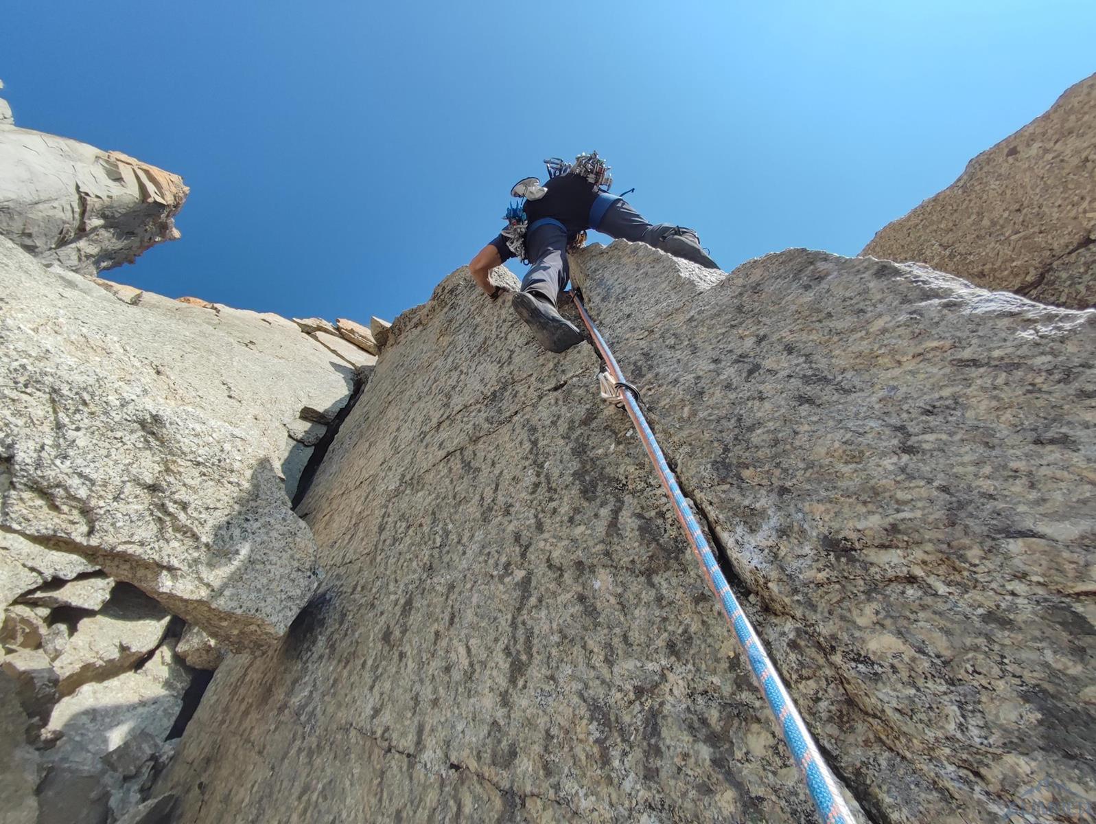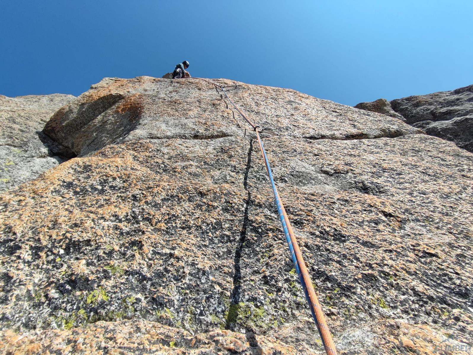 Ze stanowiska pod okap kontynuuje Droga Szwajcarska (widać pętlę) – jeżeli pójdziemy tam czeka nas odcinek za 6b i A0 (klasycznie ok. 7b), dlatego też popularniejszym i logiczniejszym wariantem jest kontynuowanie od tego miejsca linią O Sole Mio. Ruszamy do góry w lewo przepięknymi rysami (do 6a+), które zaprowadzą nas do kolejnego stanu. Stąd wzdłuż spitów stromą ścianką z krawądkami (6a+) i skośną rysą pod tarciową płytkę (6a+), po przejściu której wylądujemy na dużej zagruzowanej półce. Nad nami dwa ostatnie, łatwe (4b i 4a) wyciągi – łączymy je w jeden, brakujące metry do stanowiska pokonując na lotnej. Kierujemy się popękanymi płytami z odchyleniem w prawo, mijamy stan i przewijamy się za kant – kilka metrów wyżej wchodzimy na grań, która zaprowadzi nas na szczyt Kapucyna.