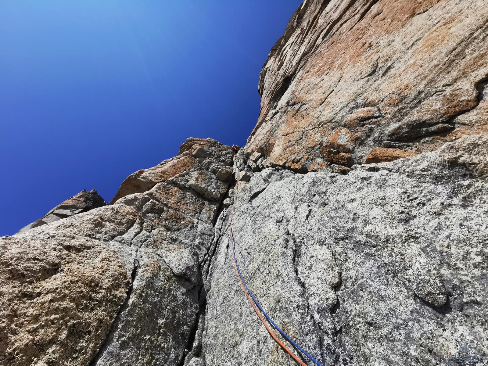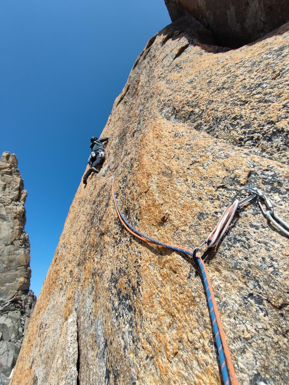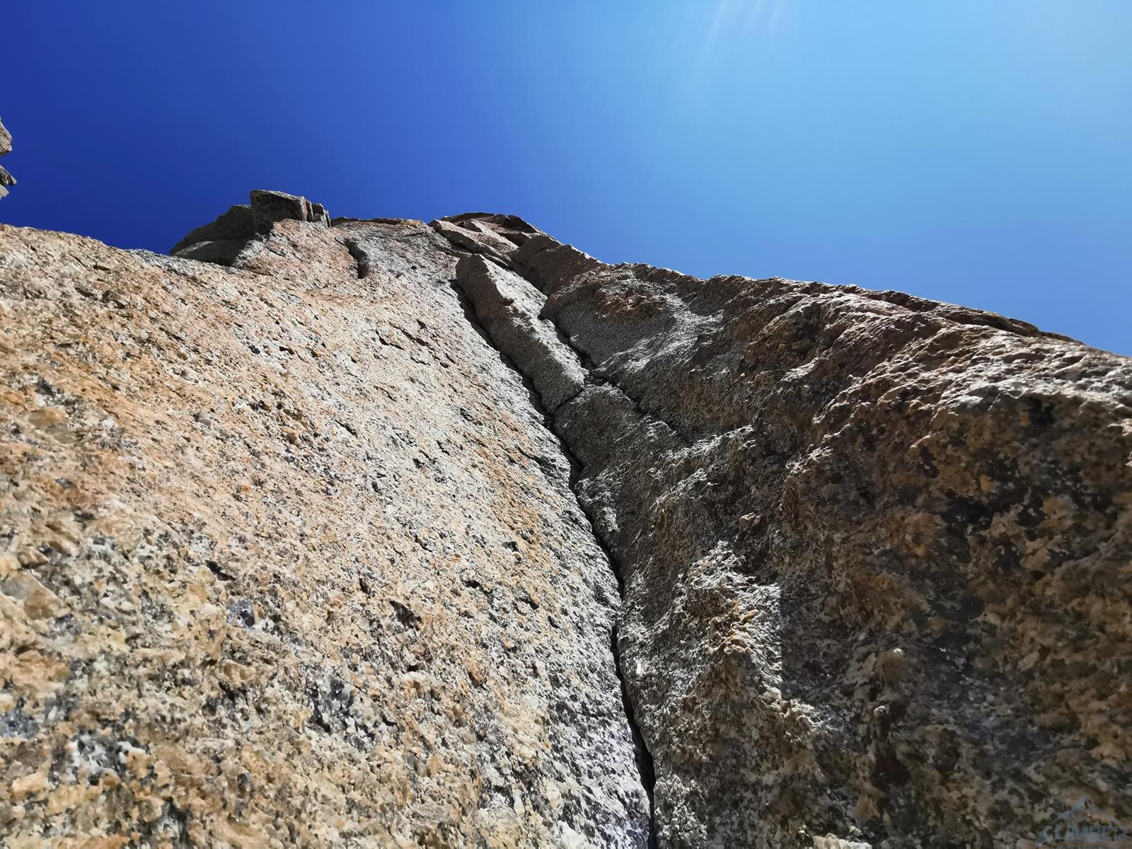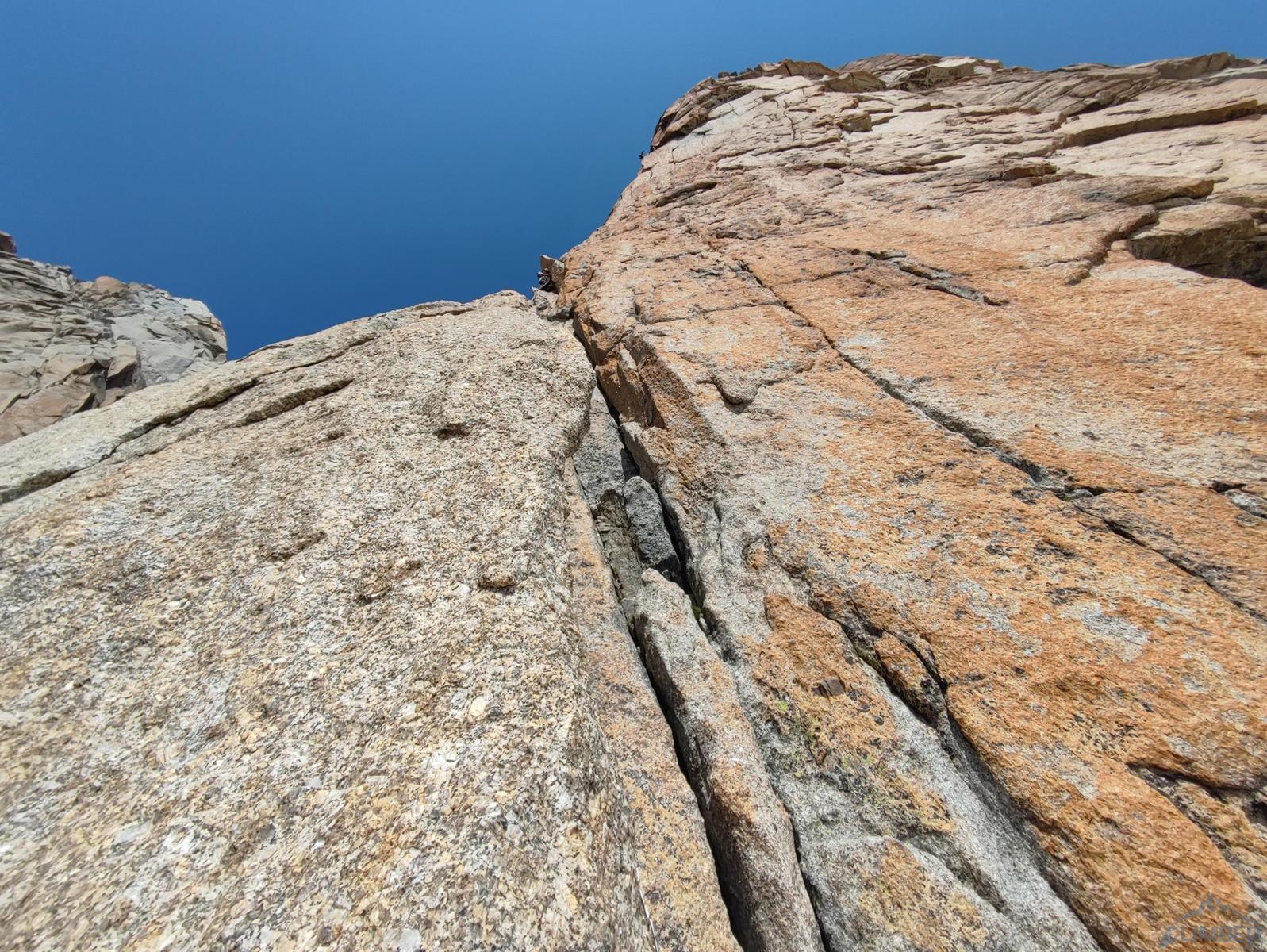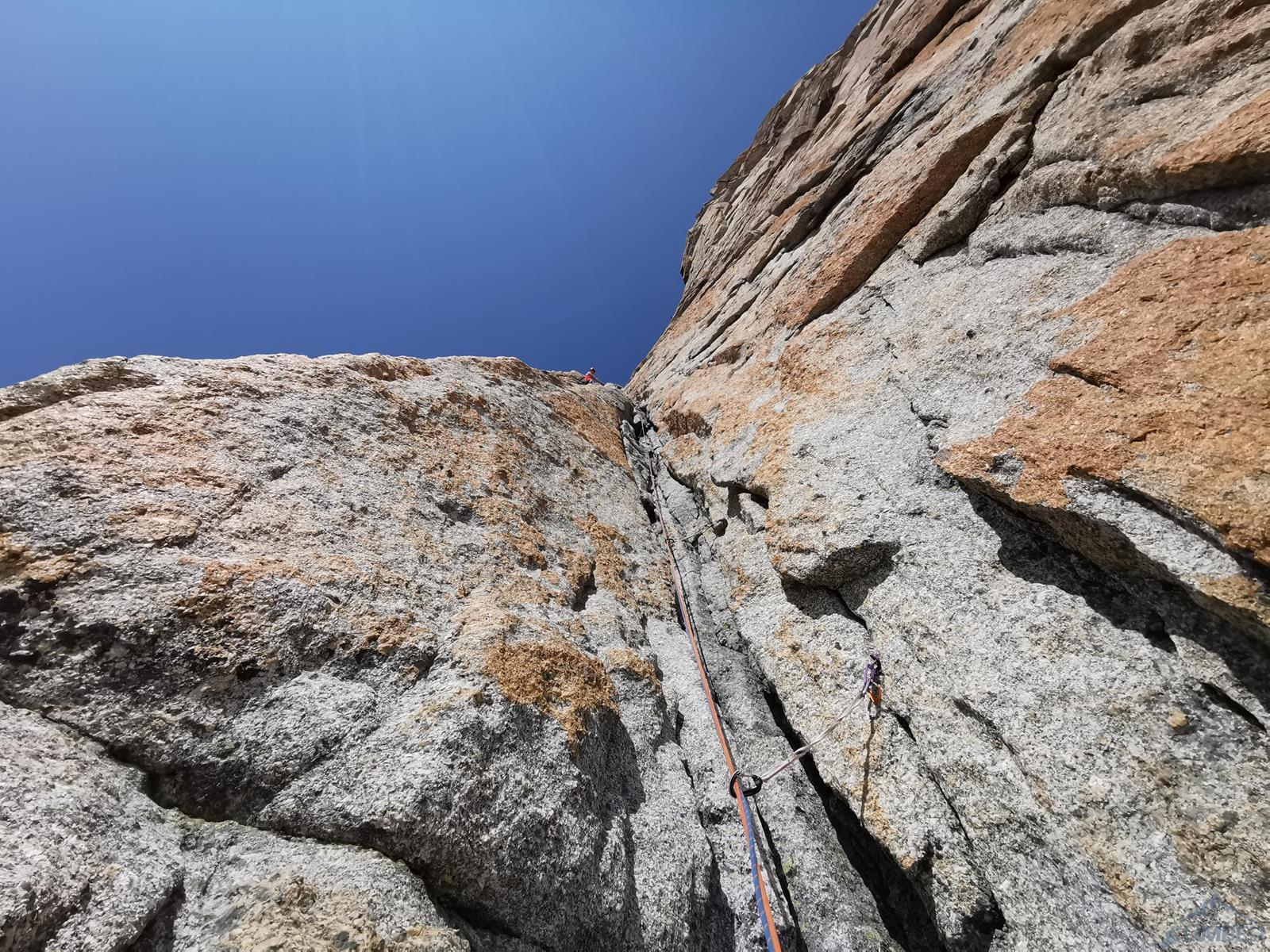 Na półce przy kolejnym łańcuchu Hiszpanie puszczają nas przodem – ruszam do góry łatwym zacięciem, po którym czeka trudniejsze miejsce (ok. 5c) z rysą w kancie. Oryginalnie wspinamy się dalej do góry z odchyleniem w prawo (5c, stanowisko za kantem), ja tymczasem po kilku metrach skręcam do stanu z Sole Mio na półce po lewej stronie – zgodnie z opisem Maćka Ciesielskiego (LINK). Robiąc tak wyjdzie nam ok. 40 metrów dość ciągowego rysowego wspinania 😊. Wracamy na kant i ruszamy do góry zacięciem, po którym czeka nas kluczowy odcinek, w tym dwie świetne rysy (6a+) – piękny ale dość wymagający wyciąg jeżeli idziemy prosto do stanowiska na lewo pod okapem.