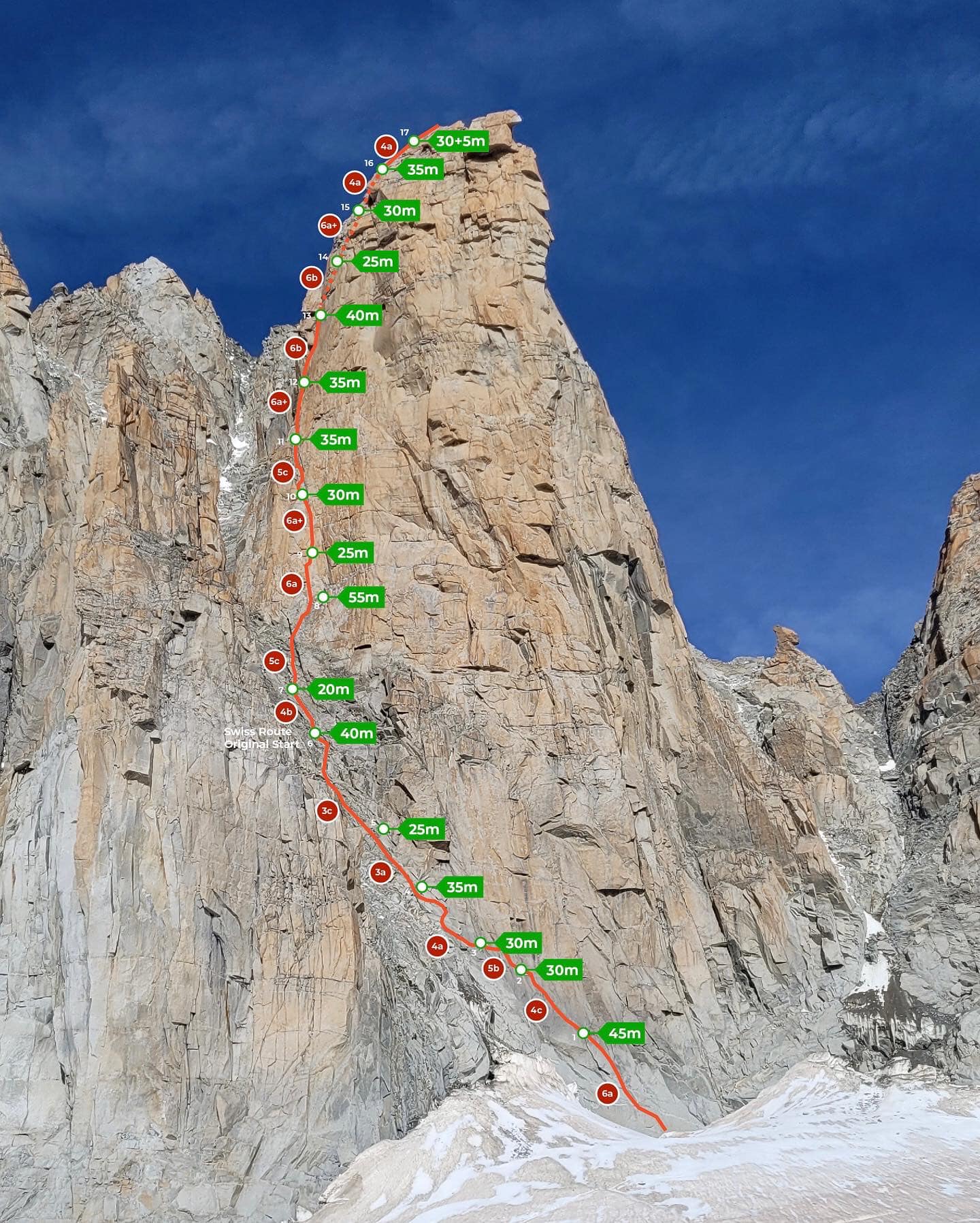 Pierwszy wyciąg Drogi Szwajcarskiej (ok. 5c+) zaczyna się wspomnianą rysą, po jej przejściu kierujemy się skośnie w prawo do wygodnego stanowiska na półce. Naszym oczom ukazuje się piękna pomarańczowa ścianka z cienką rysą prowadzącą wprost (6b) oraz szerszą rysą zwieńczoną okapikiem po lewej (6a) – wybieramy drugi, popularniejszy wariant. Po przejściu rysy przewijamy się do stanowiska pod zacięciami, przed nami dwa bardzo ładne i nietrudne (5c i 4c) wyciągi – prowadzenie na ten fragment przejmuje partnerka.