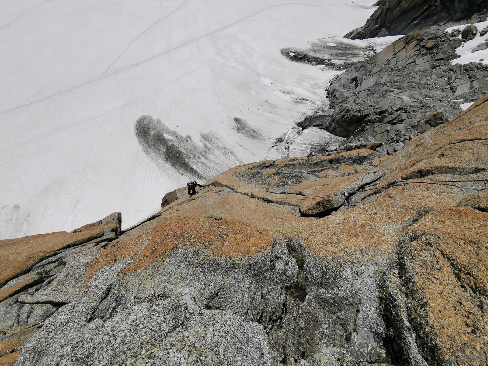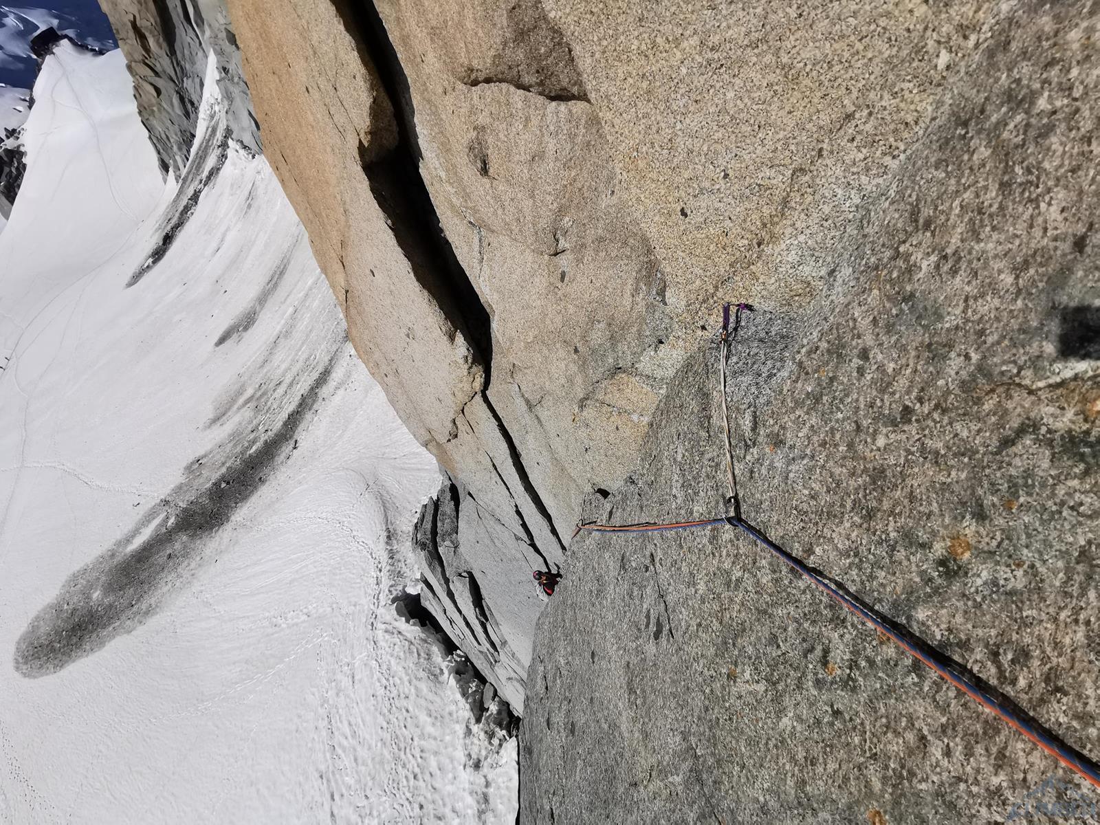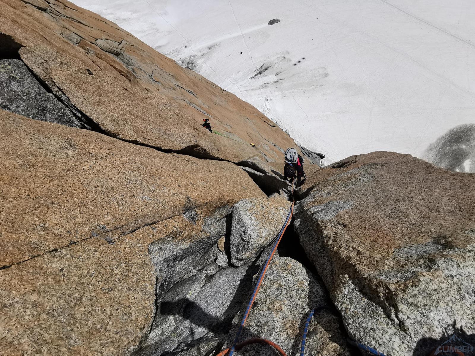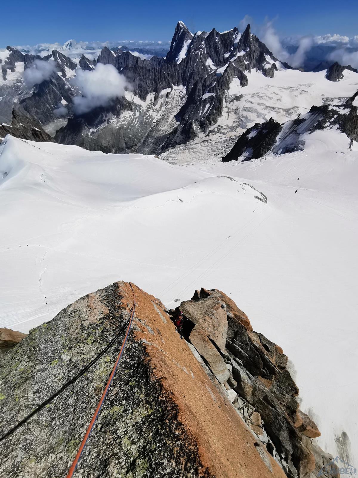 Dzień po naszym wspinaniu na Kapucynie (RELACJA) obóz KW BB w Courmayeur dobiega końca, opuszczamy camping i przenosimy się do Chamonix. Noc i poranek są deszczowe, gdy dzwonimy do Cosmiques okazuje się jednak, że na lodowcu Vallée Blanche jest piękna pogoda. Od razu wyjeżdżamy więc na Aiguille du Midi z planem przejścia dwóch świetnych linii w dwa dni. Napisać o pierwszej z nich, że to klasyk to jak nic nie napisać – droga Rébuffata jest bowiem jedną z najczęściej powtarzanych w całych Alpach. Jej dostępność, niesamowite usytuowanie oraz niewątpliwa uroda powodują, że przy ładnej pogodzie ustawiają się na niej kolejki, a stopień wyślizgania granitu sięgnął poziomu niespotykanego nigdzie indziej w górach 😊.