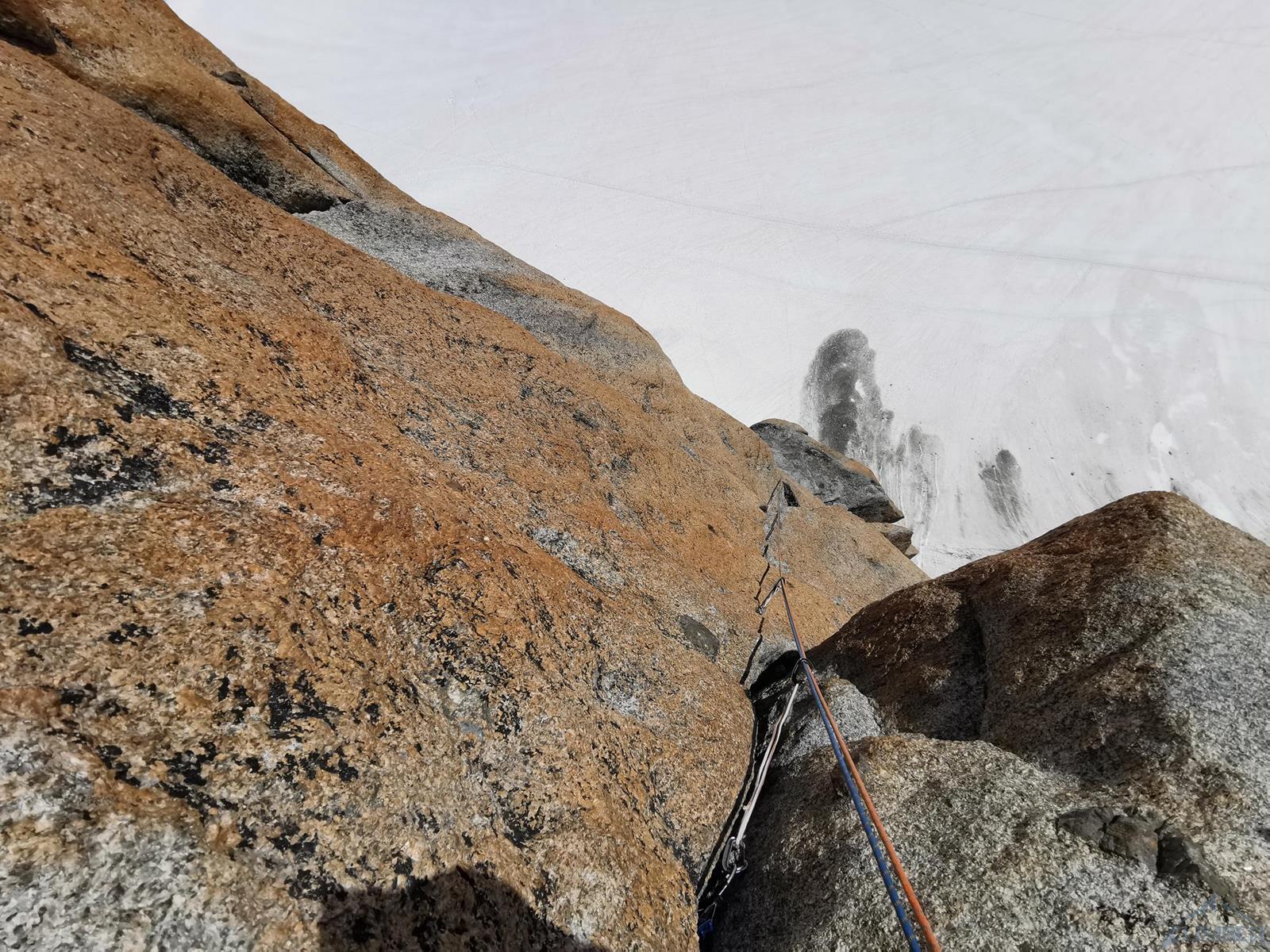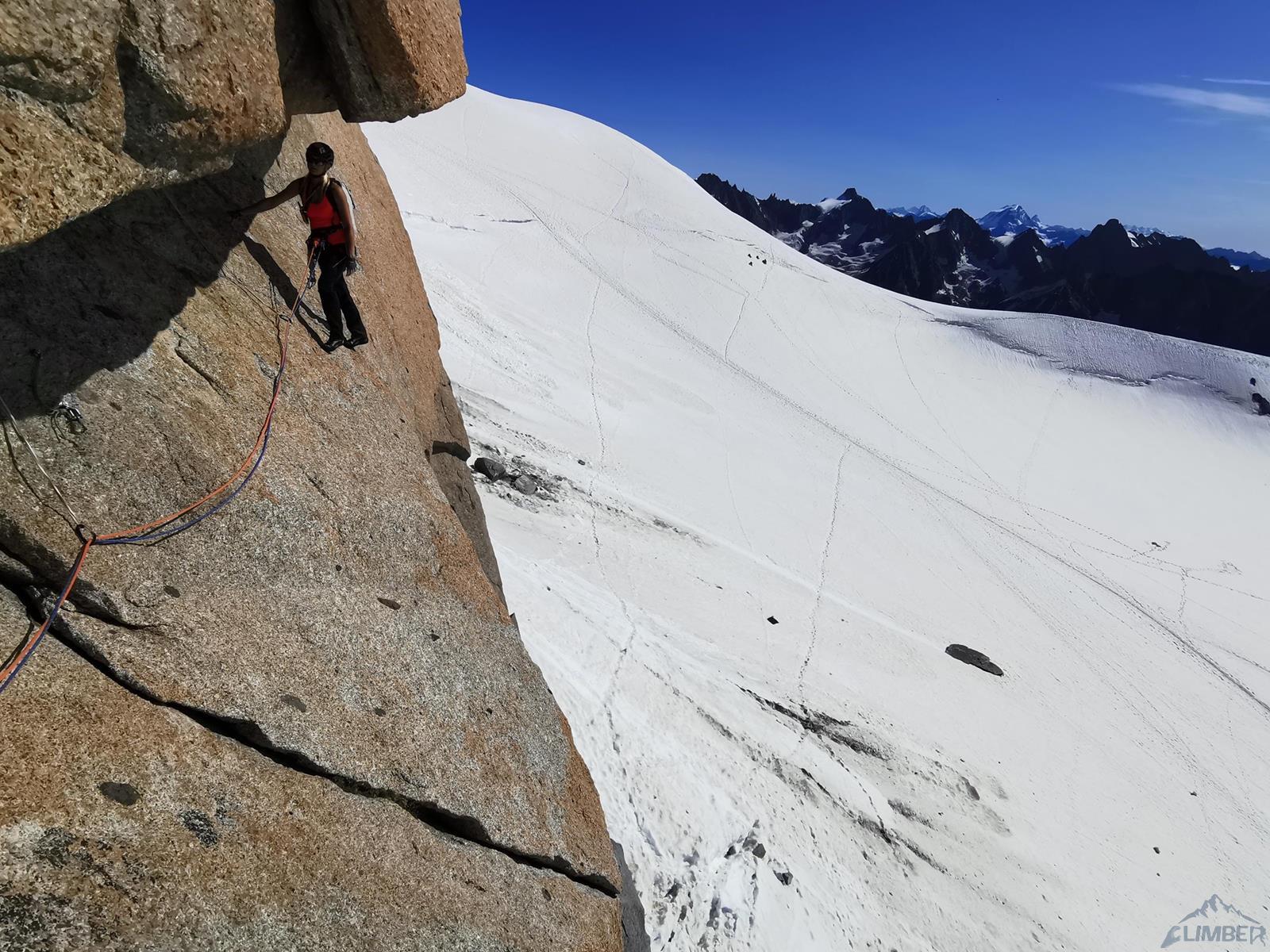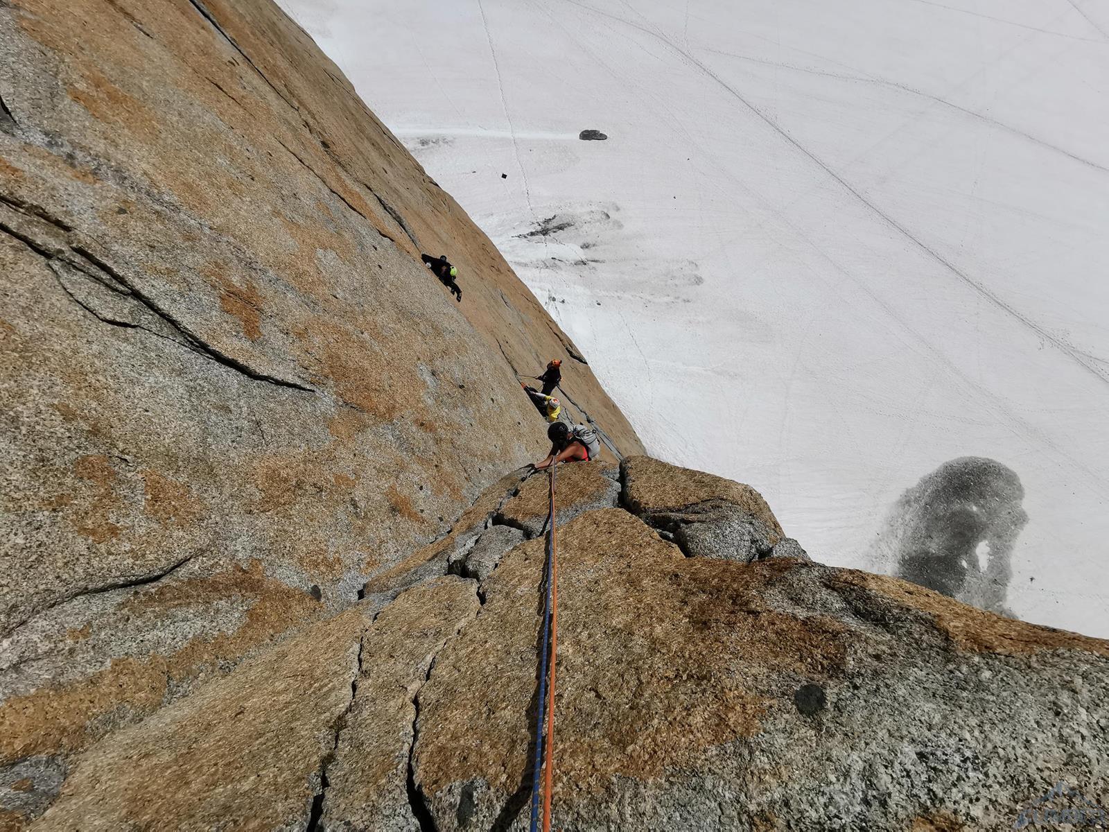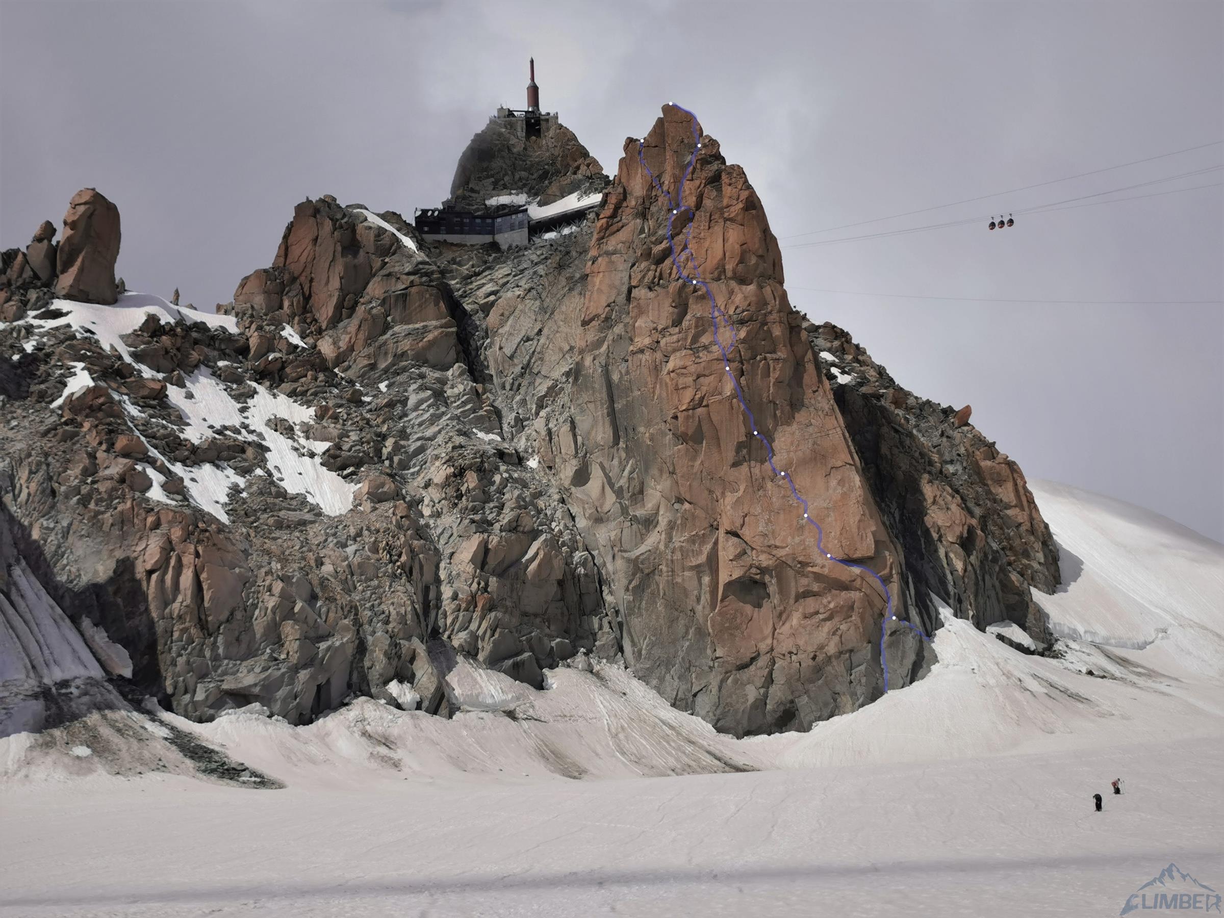 Dzień po naszym wspinaniu na Kapucynie (RELACJA) obóz KW BB w Courmayeur dobiega końca, opuszczamy camping i przenosimy się do Chamonix. Noc i poranek są deszczowe, gdy dzwonimy do Cosmiques okazuje się jednak, że na lodowcu Vallée Blanche jest piękna pogoda. Od razu wyjeżdżamy więc na Aiguille du Midi z planem przejścia dwóch świetnych linii w dwa dni. Napisać o pierwszej z nich, że to klasyk to jak nic nie napisać – droga Rébuffata jest bowiem jedną z najczęściej powtarzanych w całych Alpach. Jej dostępność, niesamowite usytuowanie oraz niewątpliwa uroda powodują, że przy ładnej pogodzie ustawiają się na niej kolejki, a stopień wyślizgania granitu sięgnął poziomu niespotykanego nigdzie indziej w górach 😊.