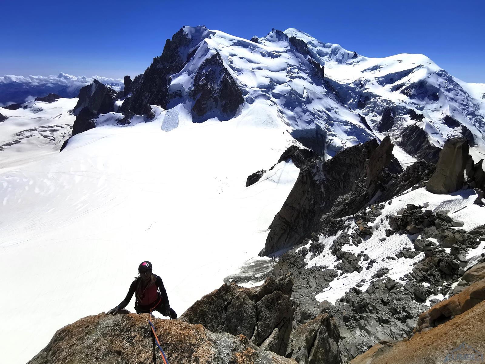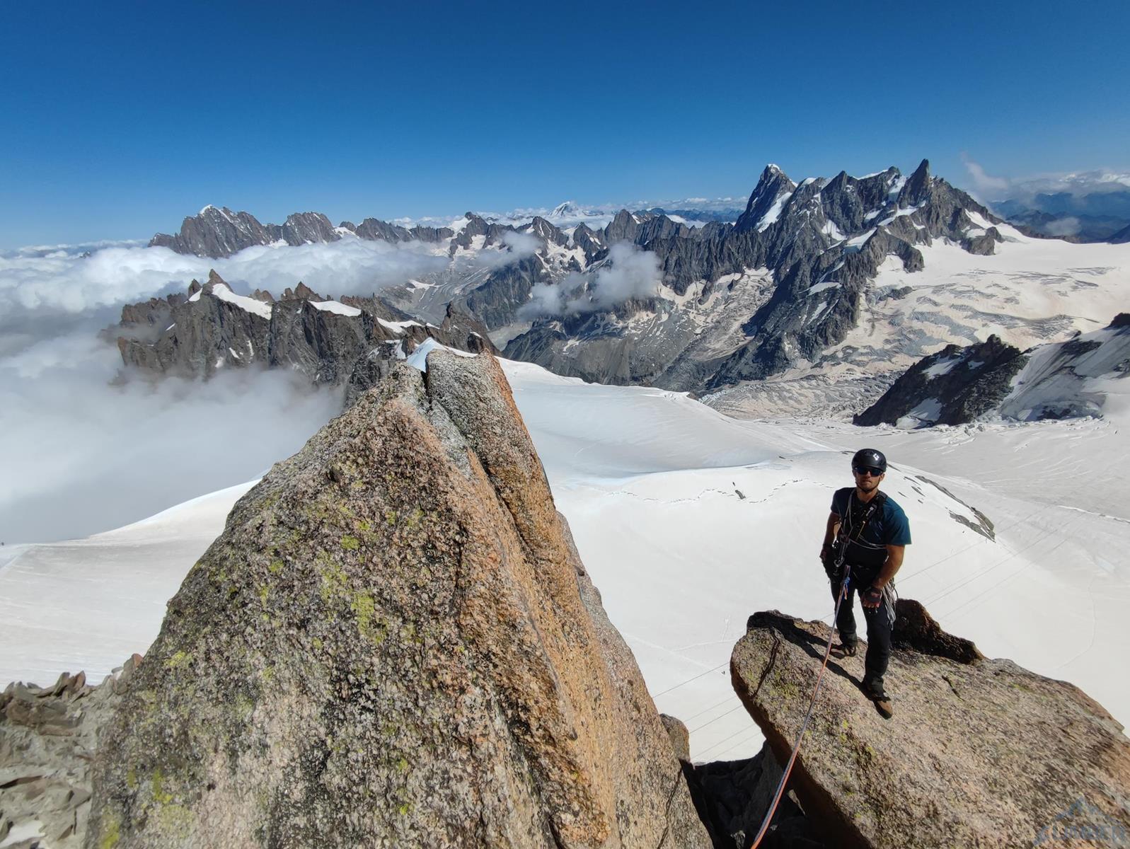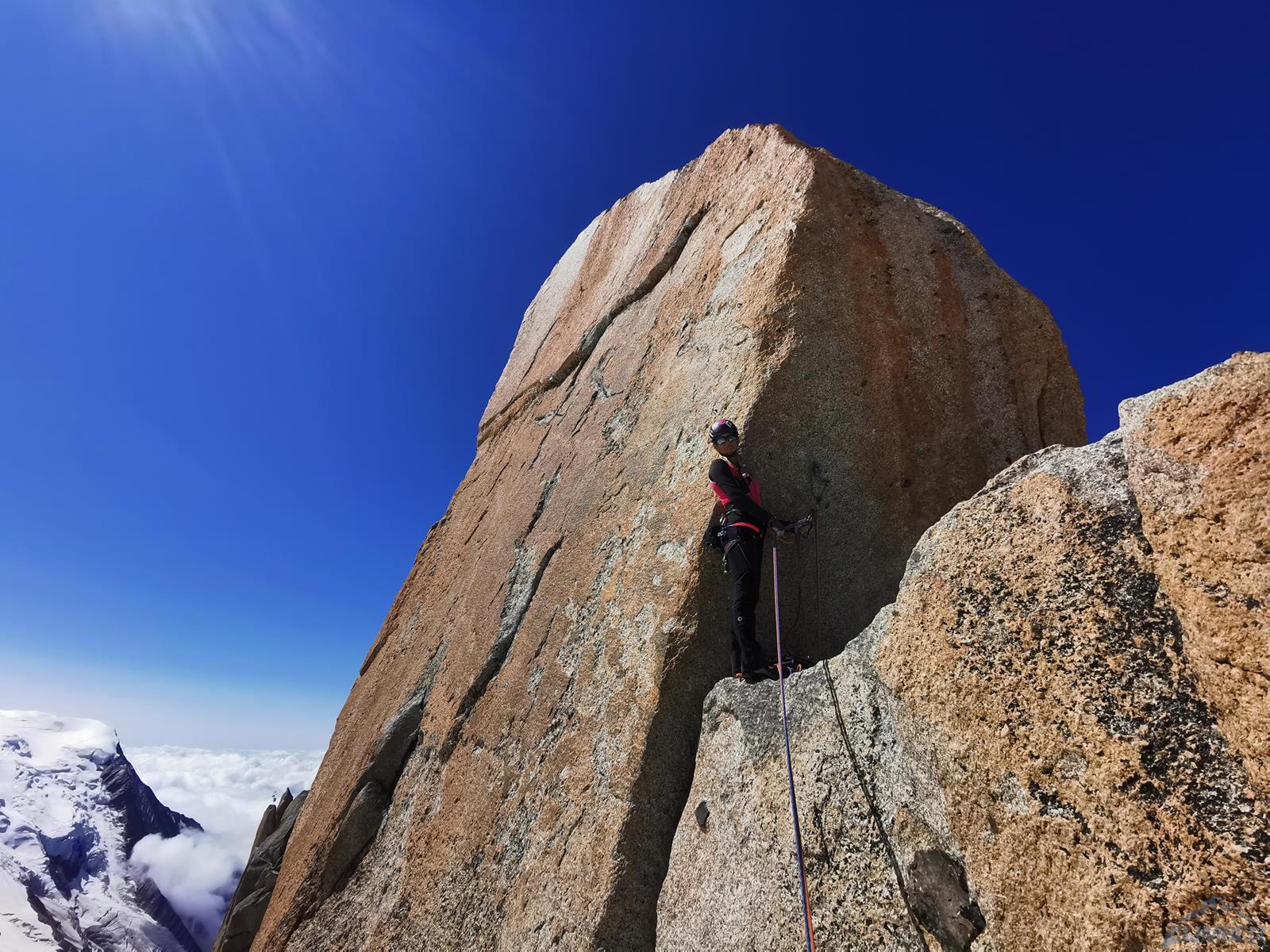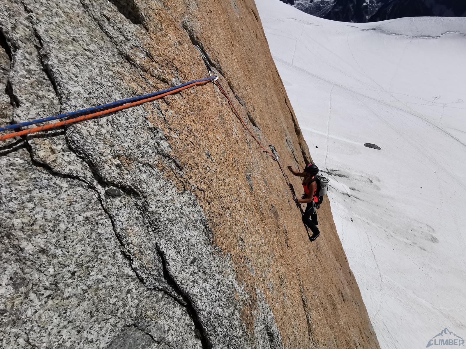 Dzień po naszym wspinaniu na Kapucynie (RELACJA) obóz KW BB w Courmayeur dobiega końca, opuszczamy camping i przenosimy się do Chamonix. Noc i poranek są deszczowe, gdy dzwonimy do Cosmiques okazuje się jednak, że na lodowcu Vallée Blanche jest piękna pogoda. Od razu wyjeżdżamy więc na Aiguille du Midi z planem przejścia dwóch świetnych linii w dwa dni. Napisać o pierwszej z nich, że to klasyk to jak nic nie napisać – droga Rébuffata jest bowiem jedną z najczęściej powtarzanych w całych Alpach. Jej dostępność, niesamowite usytuowanie oraz niewątpliwa uroda powodują, że przy ładnej pogodzie ustawiają się na niej kolejki, a stopień wyślizgania granitu sięgnął poziomu niespotykanego nigdzie indziej w górach 😊.