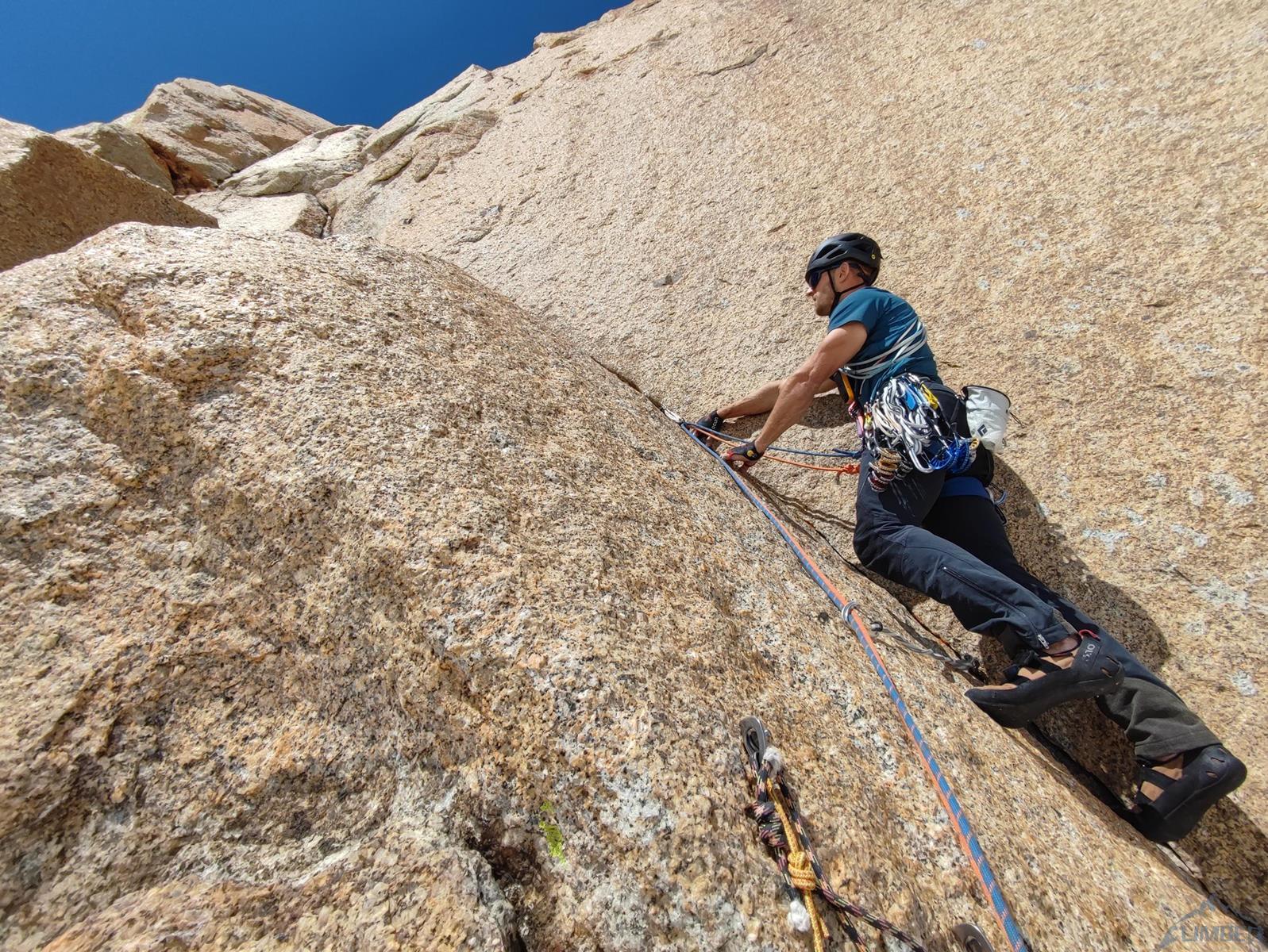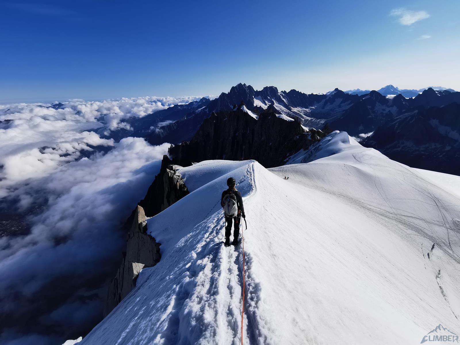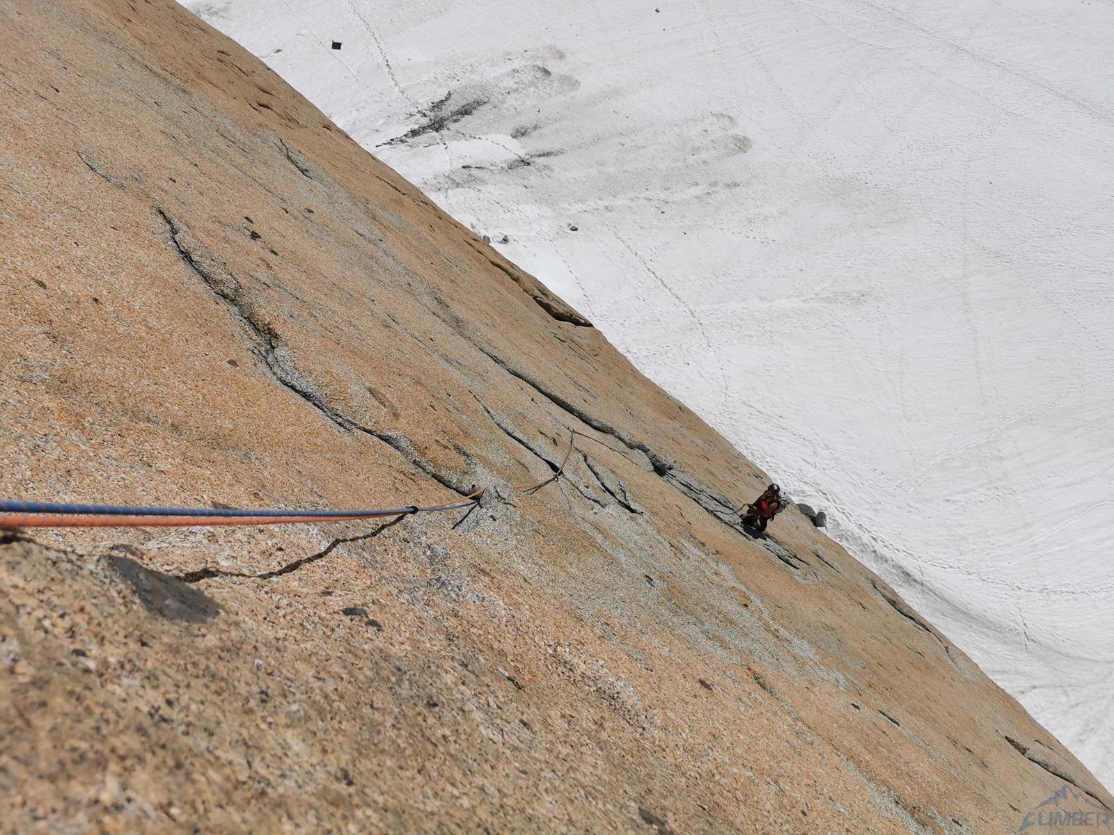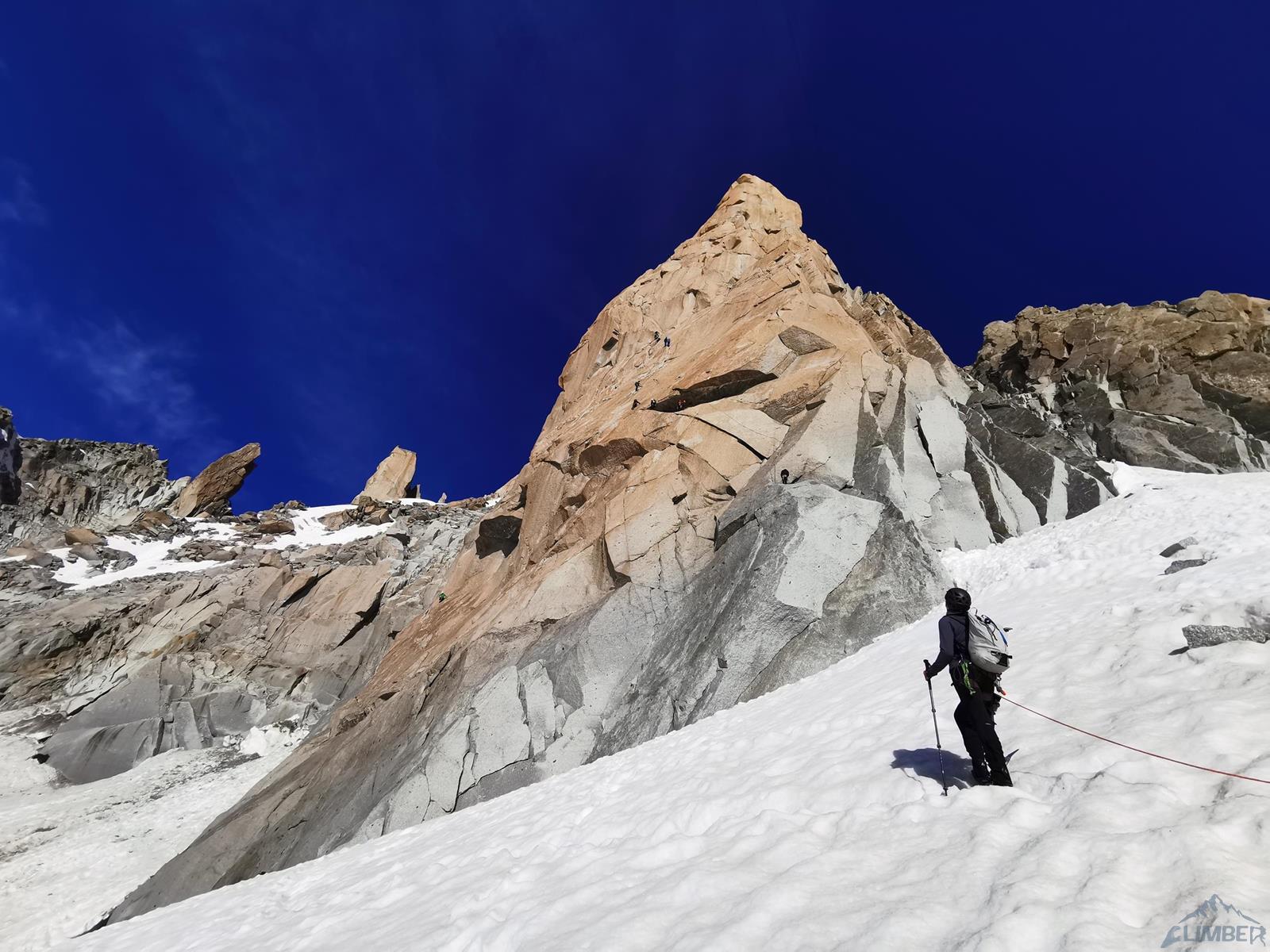 Dzień po naszym wspinaniu na Kapucynie (RELACJA) obóz KW BB w Courmayeur dobiega końca, opuszczamy camping i przenosimy się do Chamonix. Noc i poranek są deszczowe, gdy dzwonimy do Cosmiques okazuje się jednak, że na lodowcu Vallée Blanche jest piękna pogoda. Od razu wyjeżdżamy więc na Aiguille du Midi z planem przejścia dwóch świetnych linii w dwa dni. Napisać o pierwszej z nich, że to klasyk to jak nic nie napisać – droga Rébuffata jest bowiem jedną z najczęściej powtarzanych w całych Alpach. Jej dostępność, niesamowite usytuowanie oraz niewątpliwa uroda powodują, że przy ładnej pogodzie ustawiają się na niej kolejki, a stopień wyślizgania granitu sięgnął poziomu niespotykanego nigdzie indziej w górach 😊.