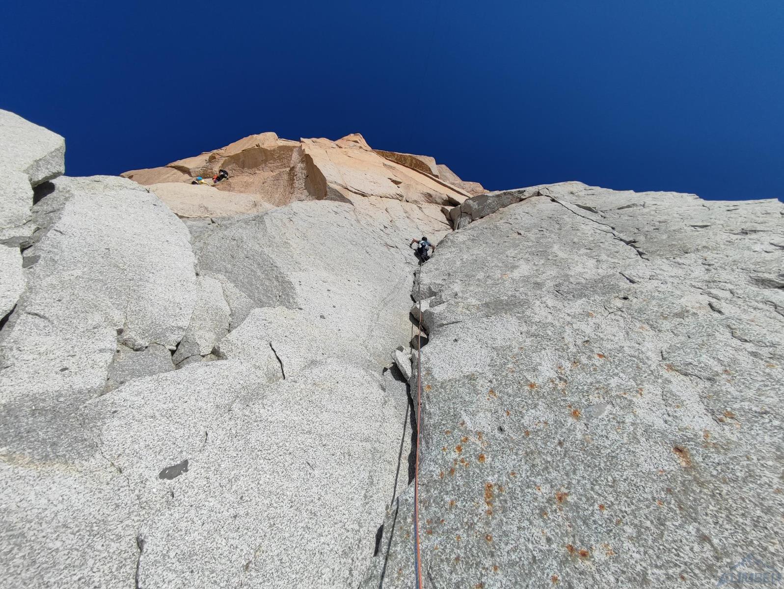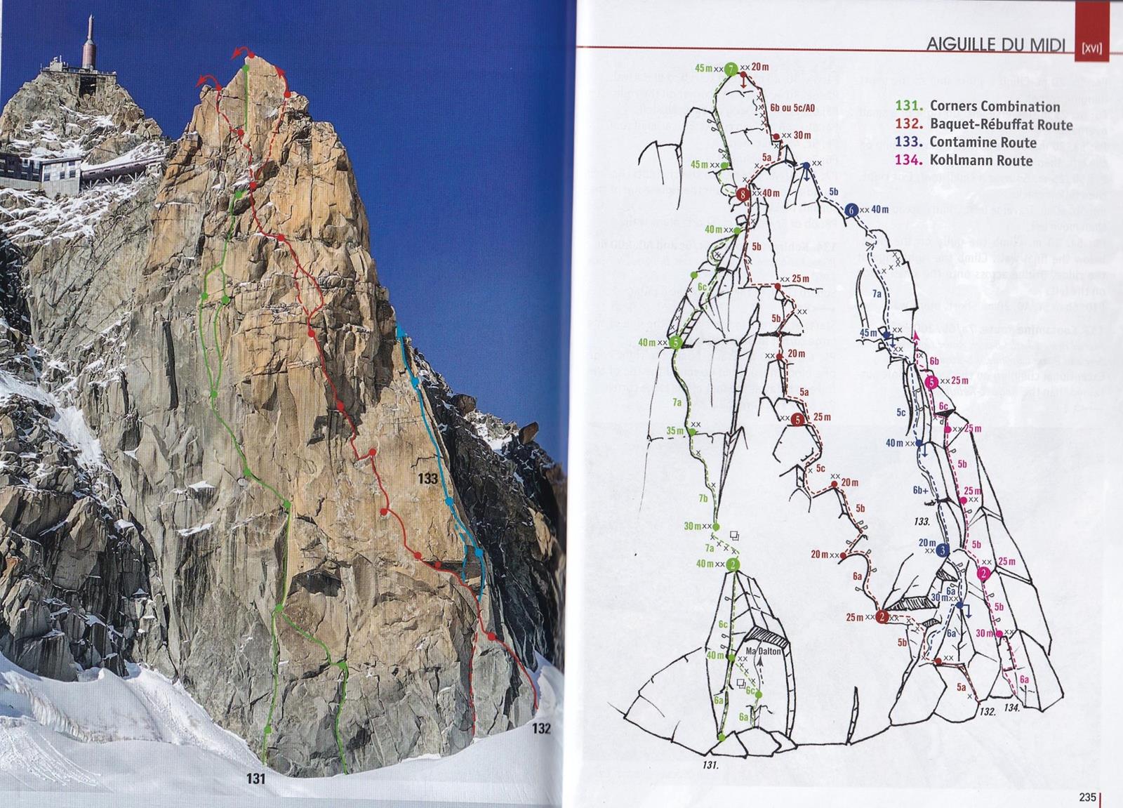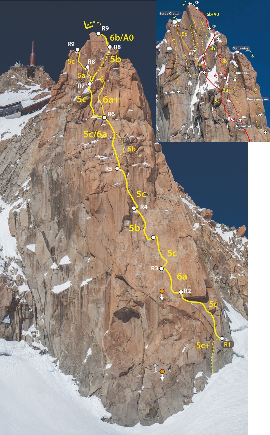 Z półki trawersujemy w lewo, pokonujemy odpęknięty blok (5c) i według schematu kontynuujemy kominami w lewo. Ja po kilku metrach idę wzdłuż rys skośnie w prawo – tym sposobem dochodzę do wariantu (6a+), który osiągnąć można również wprost ze stanowiska (patrz topo). Po przejściu rysy i ciekawego zacięcia przewijamy się w lewo na dużą półkę, gdzie jest opcjonalny stan. Stąd – jeżeli chcemy finiszować trudniejszym wariantem - trawersujemy w lewo przez żleb i wspinamy się ostrzem filara (5b) do stanowiska na przełączce (łatwiejszy wariant końcowy ucieka kominami w lewo). Ostatni wyciąg jest pięknie usytuowany i ubezpieczony spitami – zaczynamy płytką po lewej stronie kantu, gdzie czeka nas kilka trudniejszych ruchów (6b/6b+), po czym przewijamy się w prawo i dobrze urzeźbioną płytką docieramy na szczyt Midi.