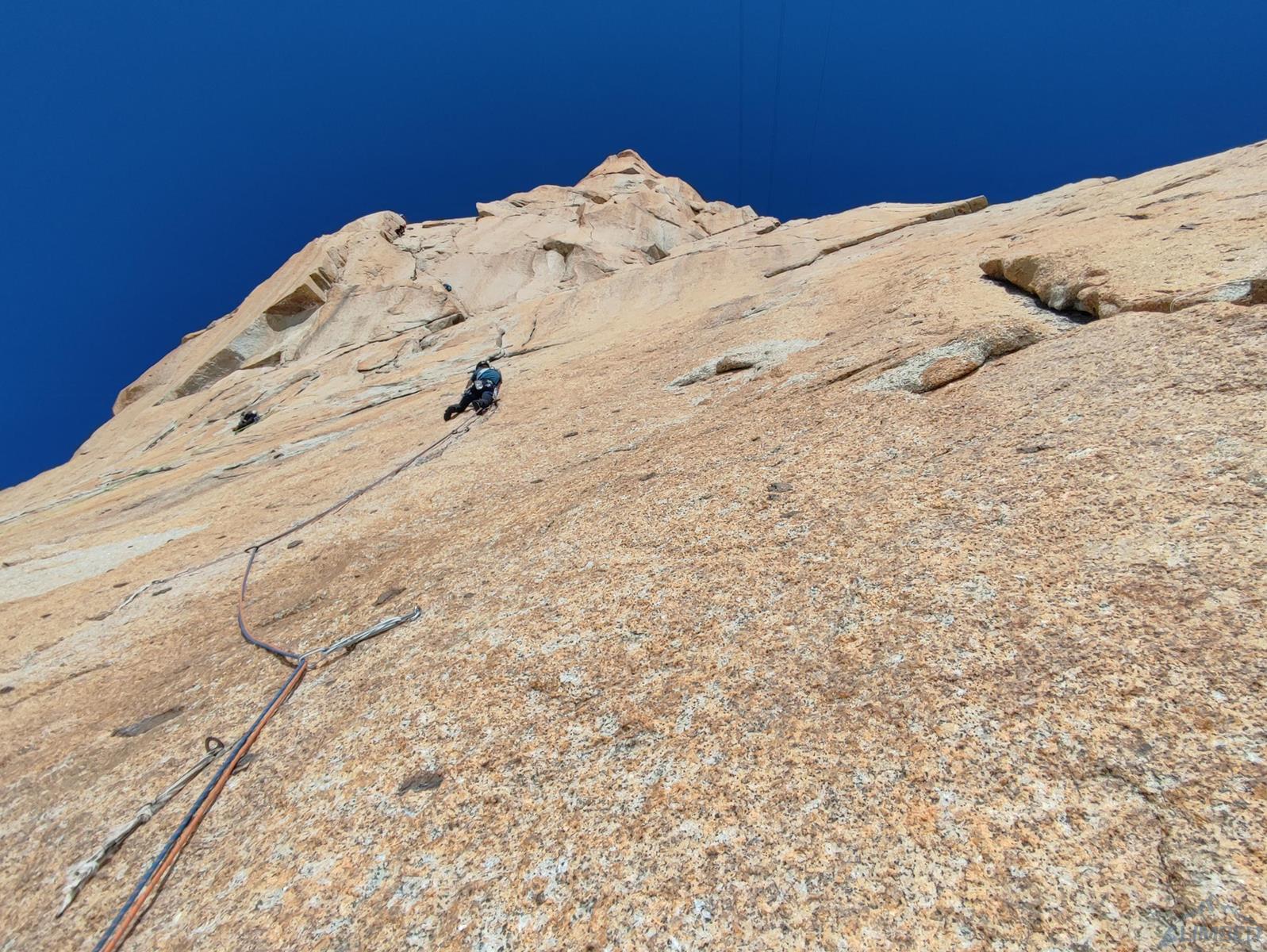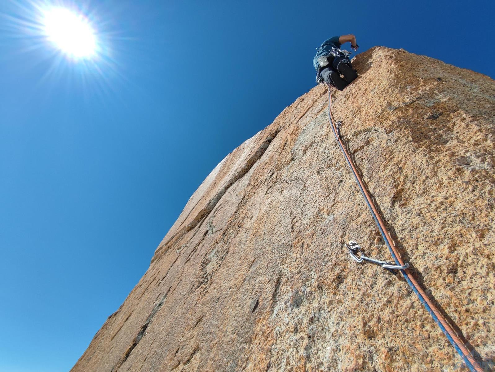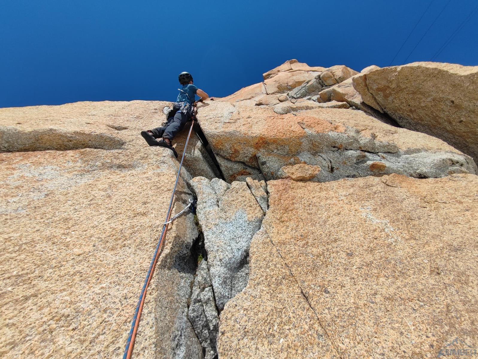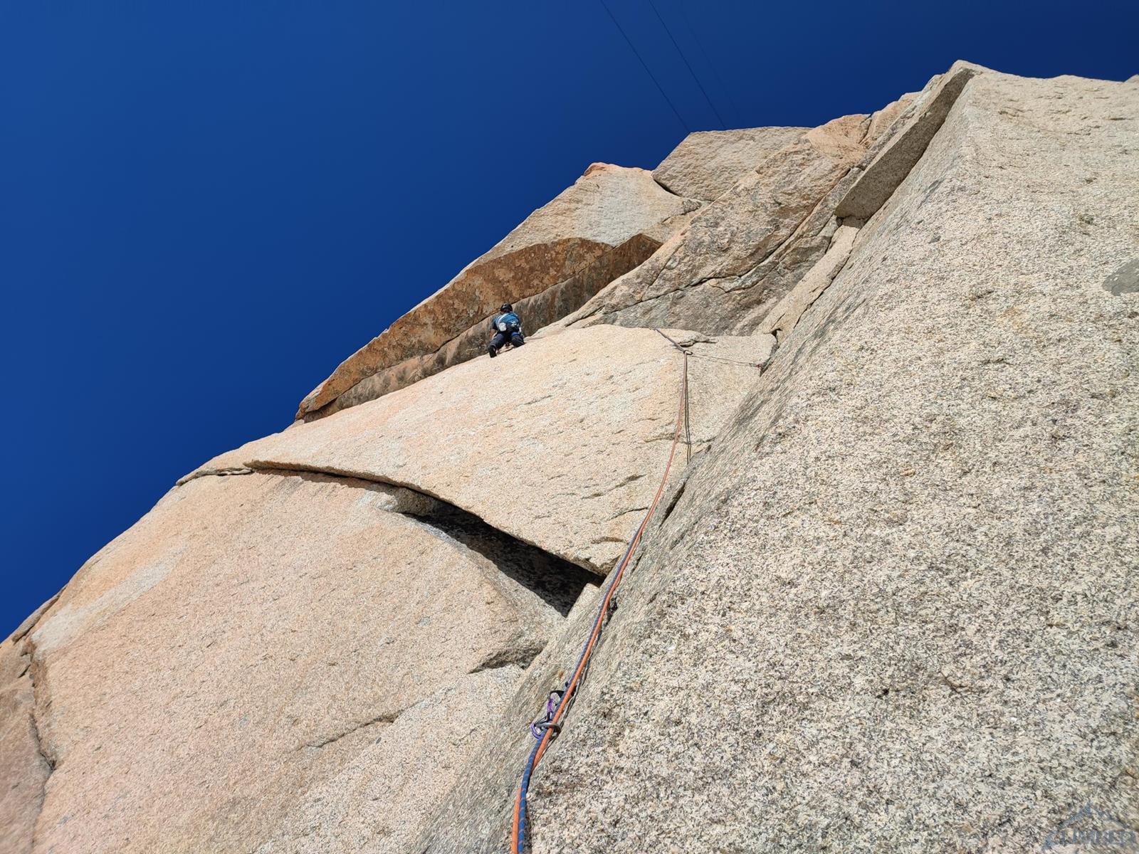 Z półki trawersujemy w lewo, pokonujemy odpęknięty blok (5c) i według schematu kontynuujemy kominami w lewo. Ja po kilku metrach idę wzdłuż rys skośnie w prawo – tym sposobem dochodzę do wariantu (6a+), który osiągnąć można również wprost ze stanowiska (patrz topo). Po przejściu rysy i ciekawego zacięcia przewijamy się w lewo na dużą półkę, gdzie jest opcjonalny stan. Stąd – jeżeli chcemy finiszować trudniejszym wariantem - trawersujemy w lewo przez żleb i wspinamy się ostrzem filara (5b) do stanowiska na przełączce (łatwiejszy wariant końcowy ucieka kominami w lewo). Ostatni wyciąg jest pięknie usytuowany i ubezpieczony spitami – zaczynamy płytką po lewej stronie kantu, gdzie czeka nas kilka trudniejszych ruchów (6b/6b+), po czym przewijamy się w prawo i dobrze urzeźbioną płytką docieramy na szczyt Midi.
