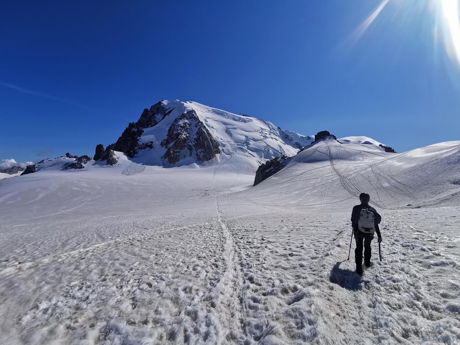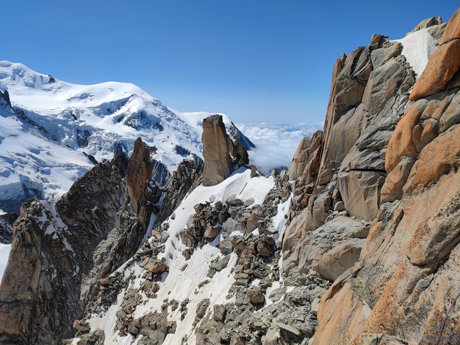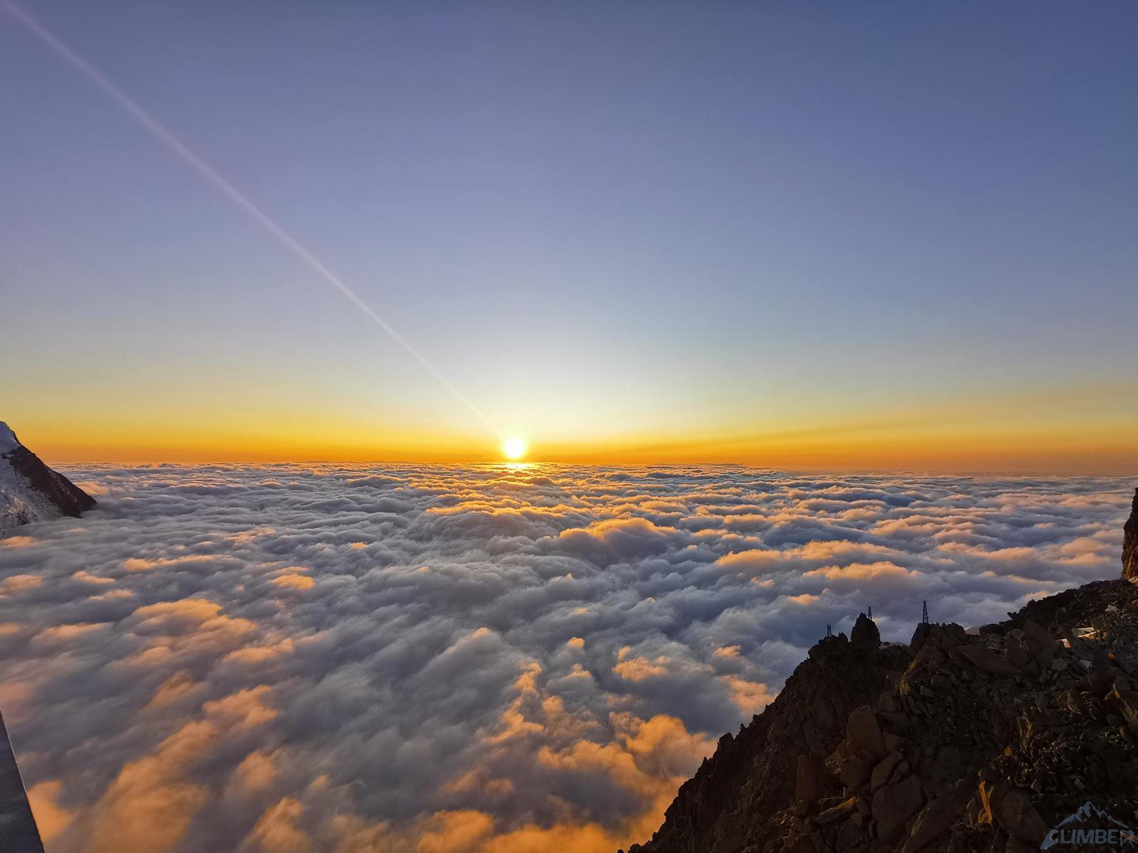 Jeżeli zabraliśmy ze sobą cały sprzęt oraz udajemy się na kolejkę – zjeżdżamy ze szczytu na taras po drugiej stronie, jeżeli wracamy na lodowiec – czekają nas zjazdy ścianą. Zaczynamy od powrotu na przełączkę, potem dość intuicyjnie w dół i z kolejnego łańcucha już linią drogi, ostatni zjazd ze stanu na lewo od okapu skośnie w prawo. Idzie sprawnie, dzięki czemu w Cosmiques meldujemy się sporo przed zachodem Słońca i podziwiamy świat tonący poniżej w chmurach.