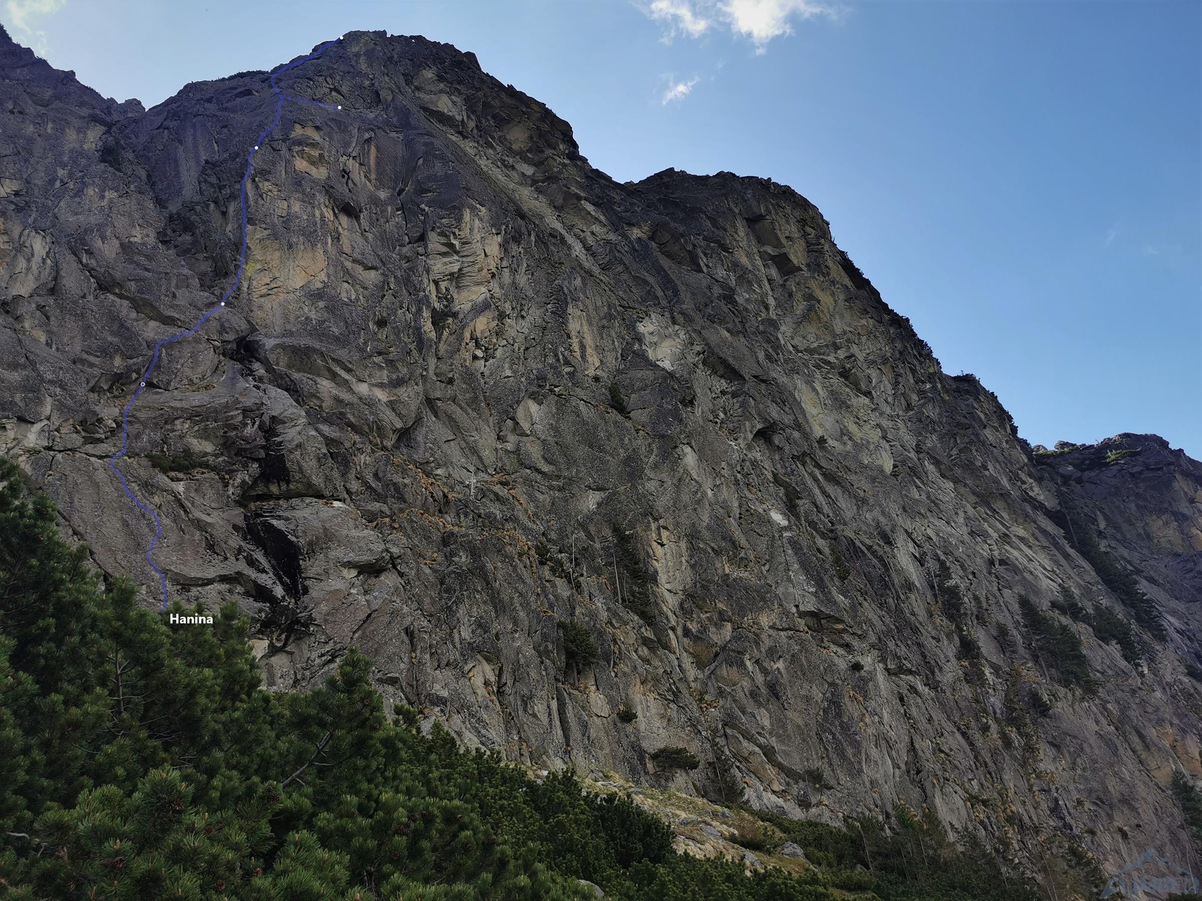Hanina to zaledwie 80-metrowa linia z 2016 roku, prowadząca płytami i kantem na lewo od projektu AKL i drogi Foxuv sen, którą to warto kontynuować wspinanie. Na pierwszym wyciągu zaczynamy wzdłuż dwóch wklejanych ringów (czujne miejsce za ok. VII), po czym odbijamy do góry w kierunku spita i dalej do łatwiejszego już zacięcia. Pierwszy ring jest dość wysoko, przydaje się więc własna asekuracja, kolejne ringi od trzeciego to nie nasza droga a krótka linia za ok. VIII! Po przejściu łatwego terenu warto założyć pośredni stan (ja zrobiłem to korzystając ze spita na ściance) – mamy już za sobą 30 metrów wspinania zakosami, a przed nami kolejny trawers i trudności. Pokonujemy komin po lewej stronie i nad nim wspinamy się poziomo w prawo – tutaj czeka bardzo ciekawy bulder (VII+) w gładkiej płycie 😉. Stanowisko jest na półce po wyjściu w łatwy teren, w miejscu przecięcia się naszej drogi z Polskim Kominem.