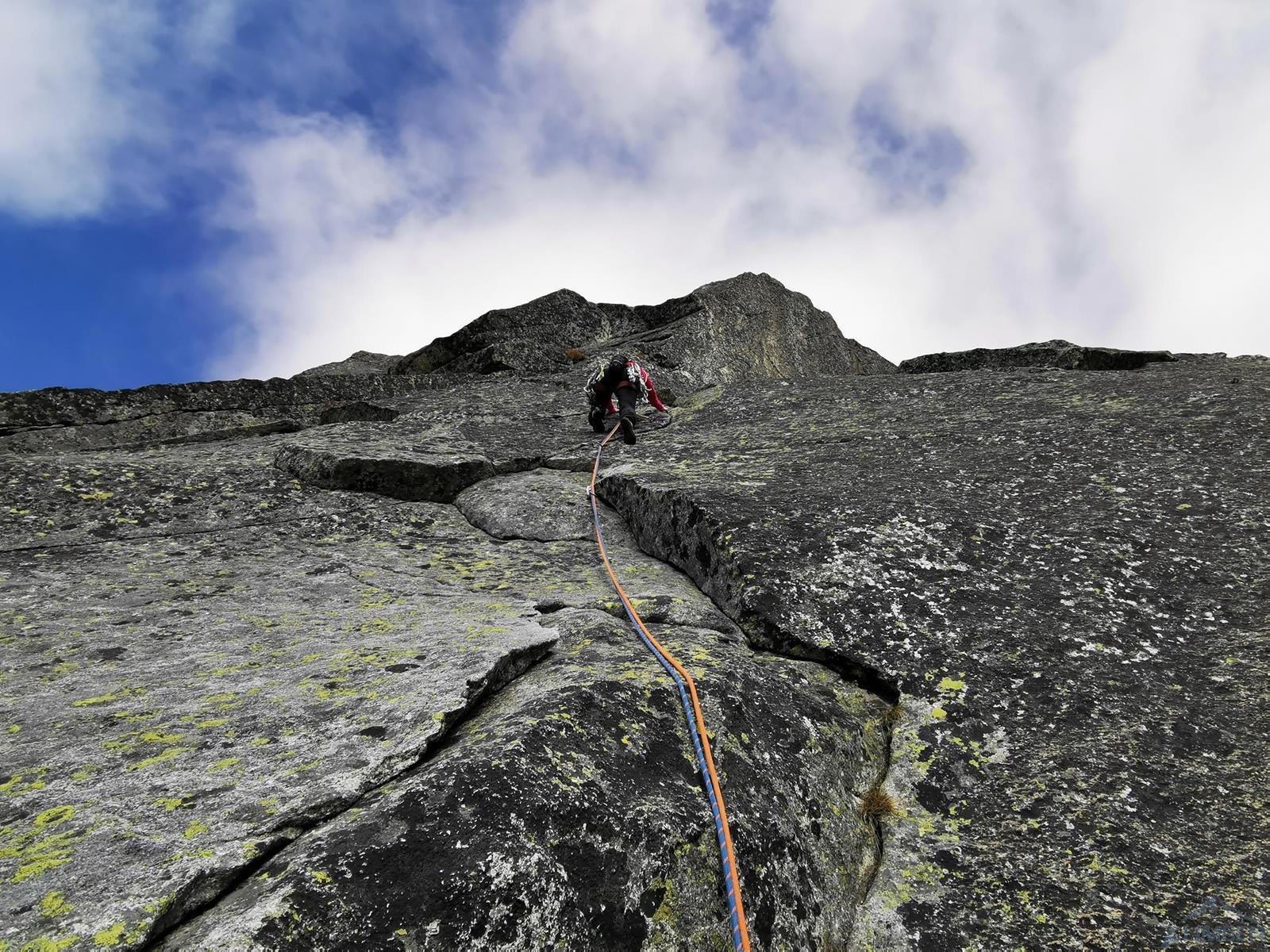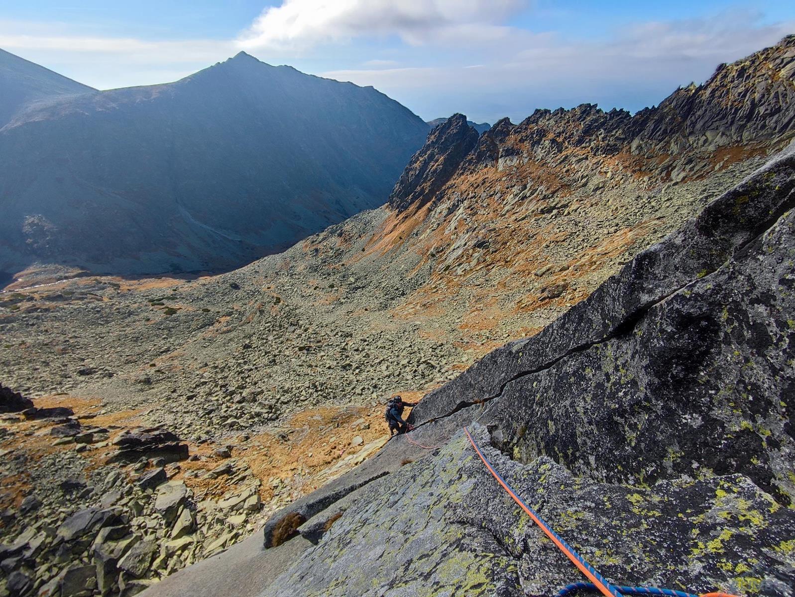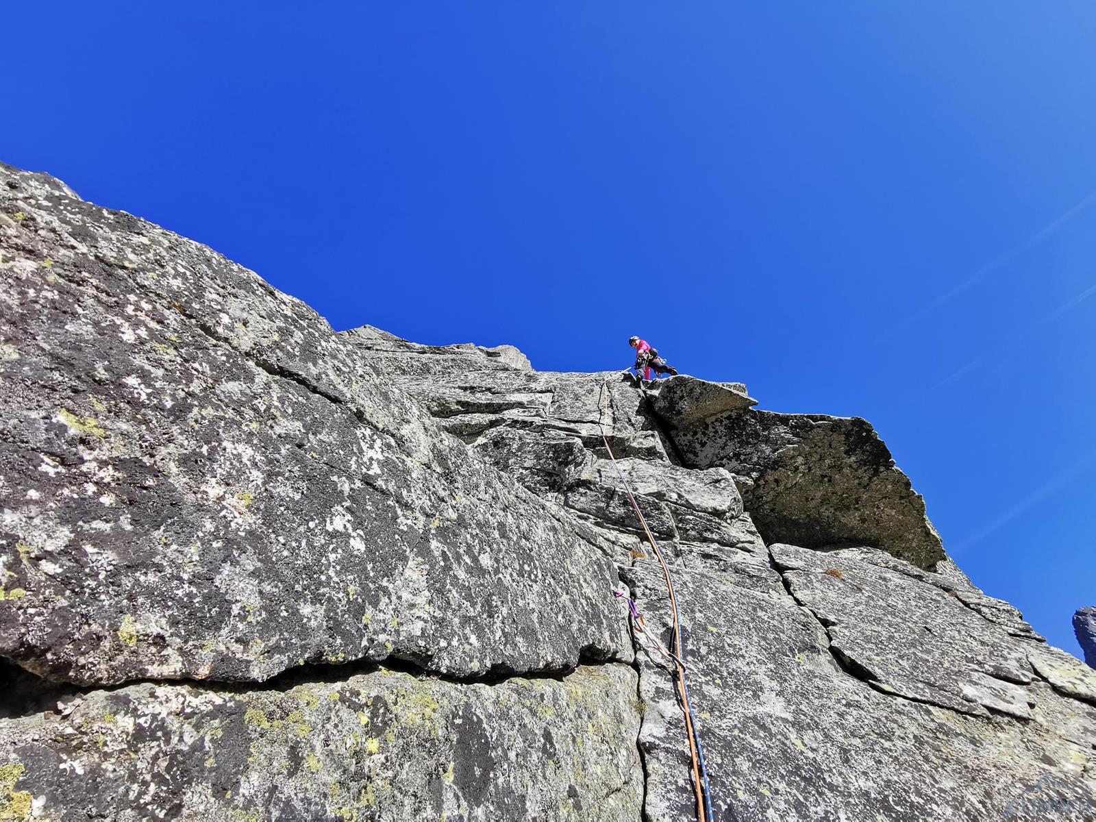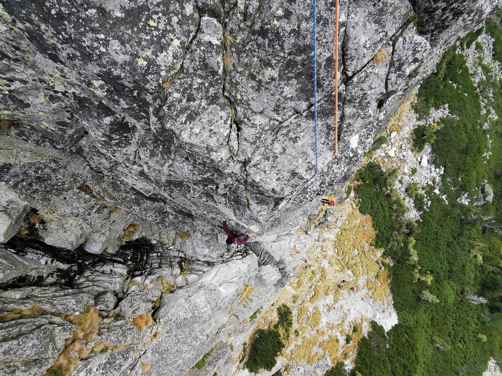 Niedziela zaczyna się bardzo obiecująco – po noclegu w schronisku nad Popradzkim Stawem ruszamy do Doliny Złomisk i dalej pod Szarpane Turnie. Plan zakłada rozgrzewkę na pięknej drodze Plška (VI-) – wracam na nią po latach (RELACJA) by towarzyszyć Ani, a następnie przejście którejś z trudniejszych dróg na ścianie zachodniej. Pierwszy wyciąg naszego klasyka ma nie do końca jasny przebieg – robiłem go już trzy razy i za każdym razem trochę inaczej 😊. Jeżeli zaczniemy u samej podstawy ściany, do stanowiskowego spita pod pierwszymi trudnościami będziemy mieć do przejścia ok. 70 metrów, asekurant może jednak bez problemu podejść. Druga opcja to start z wyższego trawnika po prawej stronie. Kierujemy się płytami i zacięciami do góry, w zależności od wariantu czekają nas trudności od IV do ok. V+, ważne by dojść do wspomnianego już spita pod okapem. Po przejściu pierwszego odcinka oddaję prowadzenie partnerce, która od dawna ostrzyła sobie zęby na kluczowe wyciągi tej pięknej drogi.