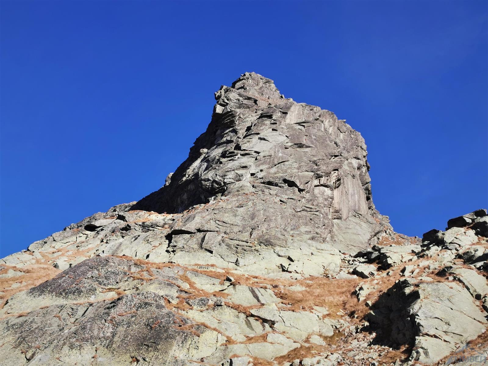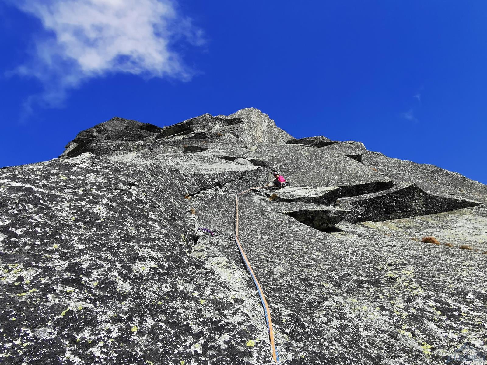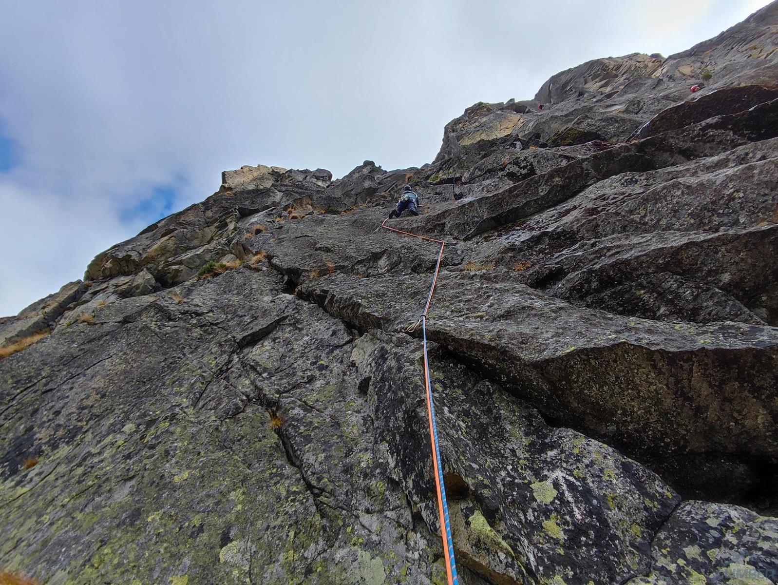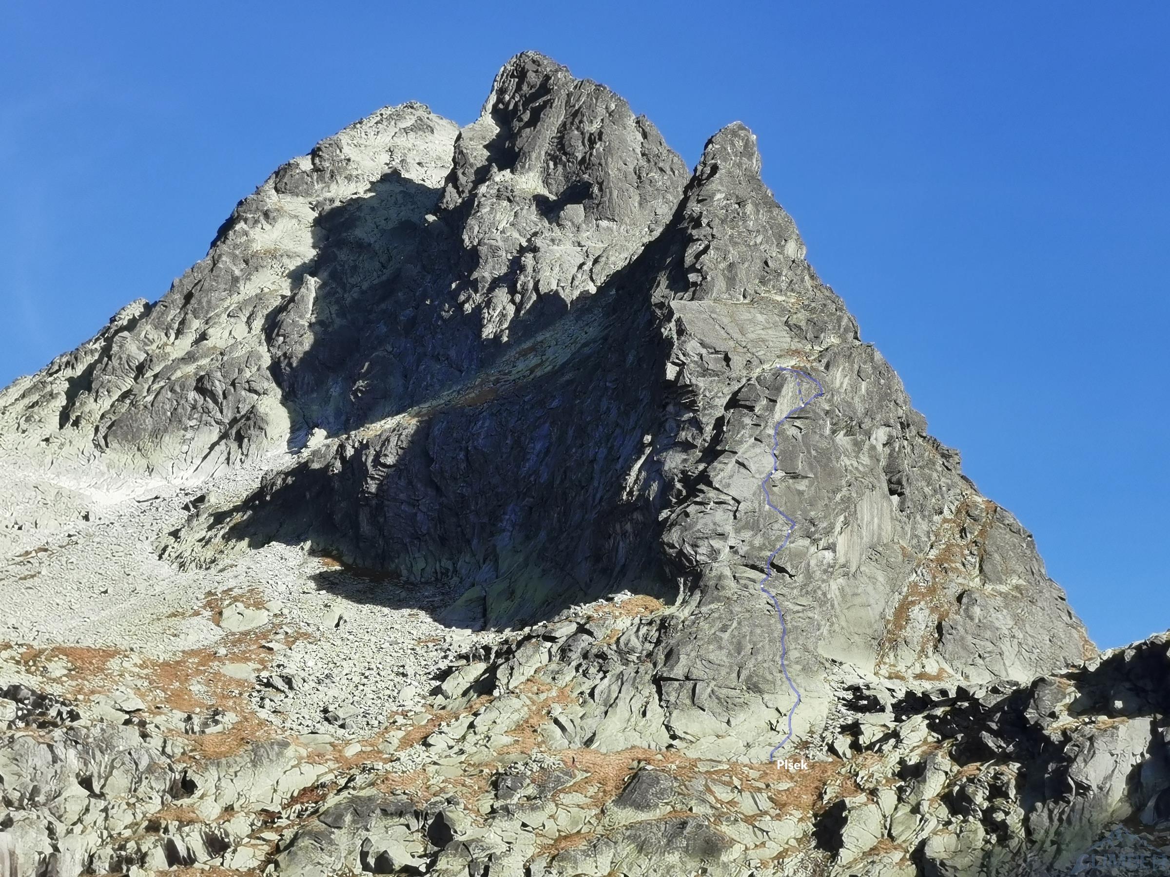 Niedziela zaczyna się bardzo obiecująco – po noclegu w schronisku nad Popradzkim Stawem ruszamy do Doliny Złomisk i dalej pod Szarpane Turnie. Plan zakłada rozgrzewkę na pięknej drodze Plška (VI-) – wracam na nią po latach (RELACJA) by towarzyszyć Ani, a następnie przejście którejś z trudniejszych dróg na ścianie zachodniej. Pierwszy wyciąg naszego klasyka ma nie do końca jasny przebieg – robiłem go już trzy razy i za każdym razem trochę inaczej 😊. Jeżeli zaczniemy u samej podstawy ściany, do stanowiskowego spita pod pierwszymi trudnościami będziemy mieć do przejścia ok. 70 metrów, asekurant może jednak bez problemu podejść. Druga opcja to start z wyższego trawnika po prawej stronie. Kierujemy się płytami i zacięciami do góry, w zależności od wariantu czekają nas trudności od IV do ok. V+, ważne by dojść do wspomnianego już spita pod okapem. Po przejściu pierwszego odcinka oddaję prowadzenie partnerce, która od dawna ostrzyła sobie zęby na kluczowe wyciągi tej pięknej drogi.