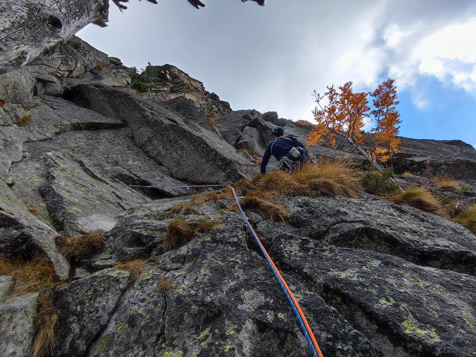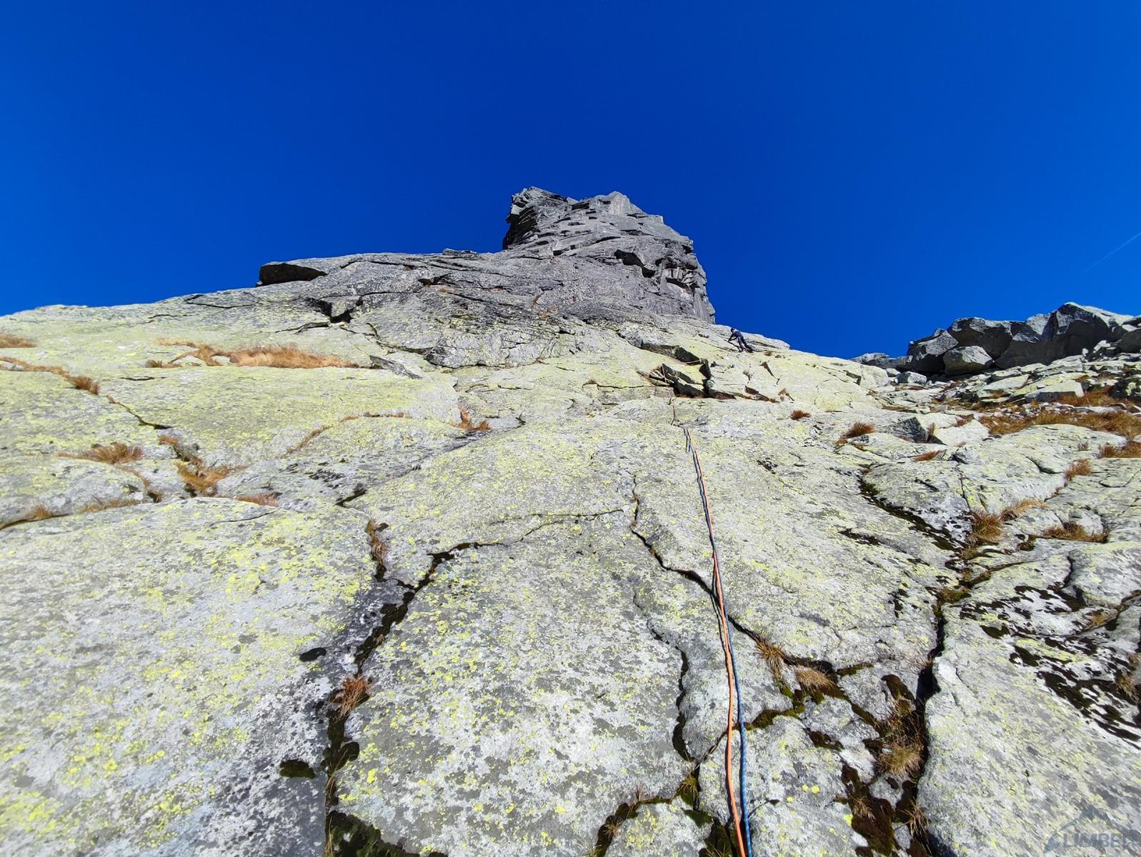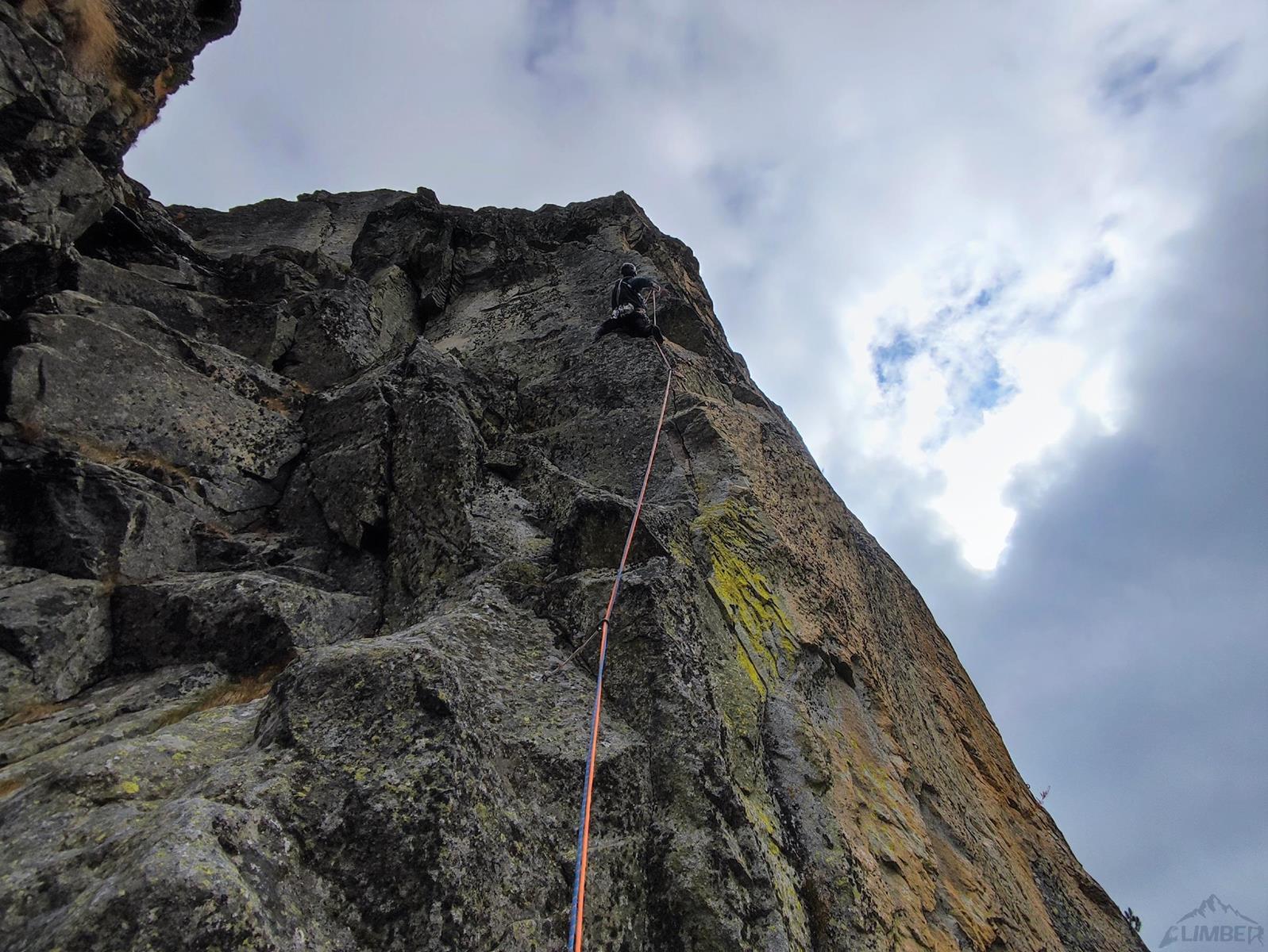 Wymarznięci chowamy się za skałami i czekamy na rozwój sytuacji – niestety po godzinie porzucamy nadzieję na przejście nawet którejś z łatwiejszych dróg i schodzimy do Pleasa. Jak już wspomniałem na wstępie, nie odpuszczamy jednak i próbujemy podziałać jeszcze na Osterwie – wchodzimy w drogę Stredom steny/Ľavá veža (VI+). Pierwszy wyciąg (V) to delikatne balansowanie pomiędzy kruchymi skałami i bujną roślinnością, liczymy na lepsze wspinanie wyżej. Już stojąc na stanowisku pod drugim wyciągiem widzimy, że nie jest jednak dobrze, a gdy pochodzę pod kluczowy odcinek – ten okazuje się zarośnięty gęstymi kępami trawy. Na dodatek dalej wygląda to jeszcze gorzej – zieleń mocno opanowała zacięcia i płyty na kolejnych wyciągach. Odpuszczamy i zjeżdżamy pod ścianę – tym razem drogi zdecydowanie więc nie polecam 😊.