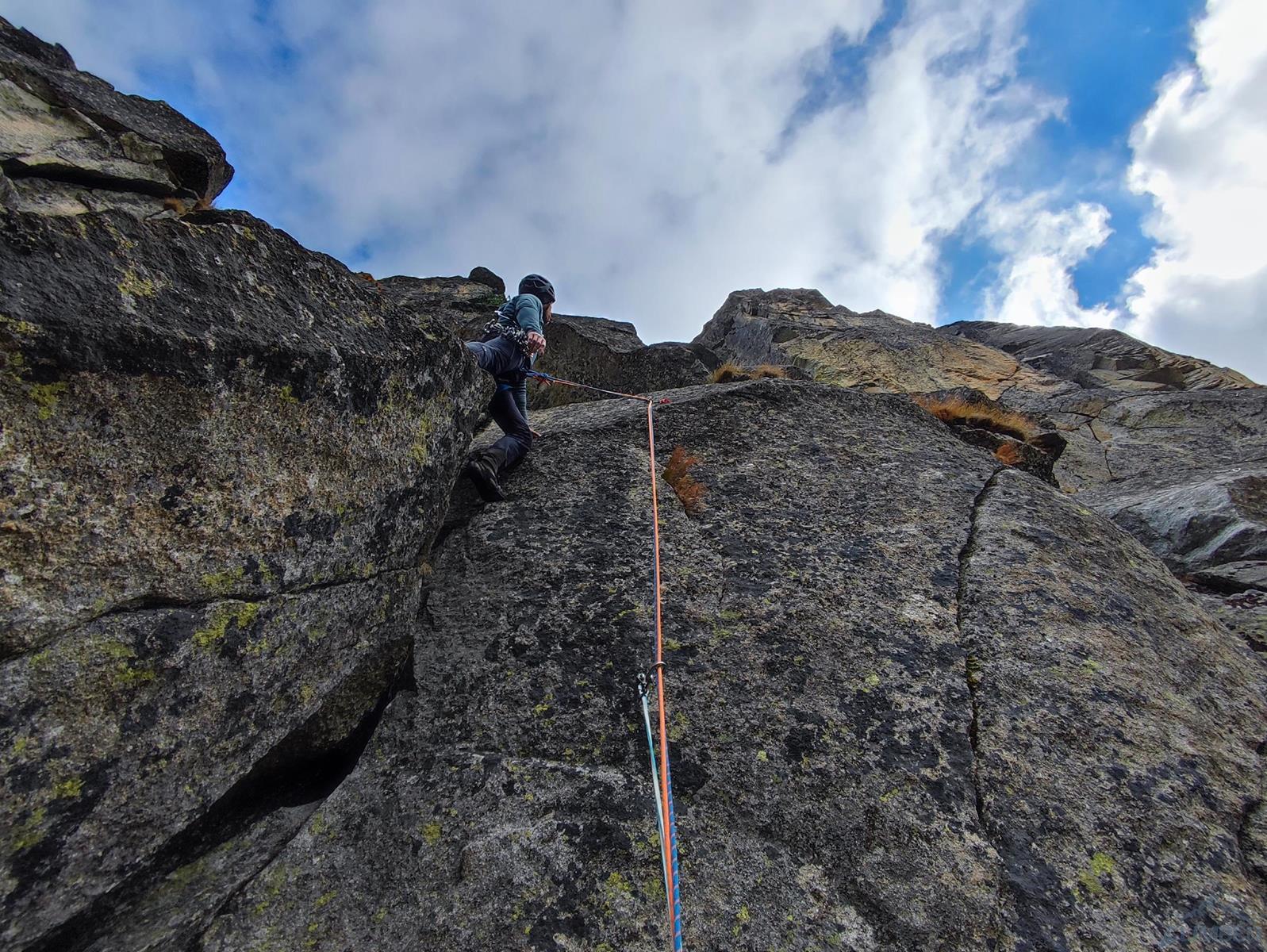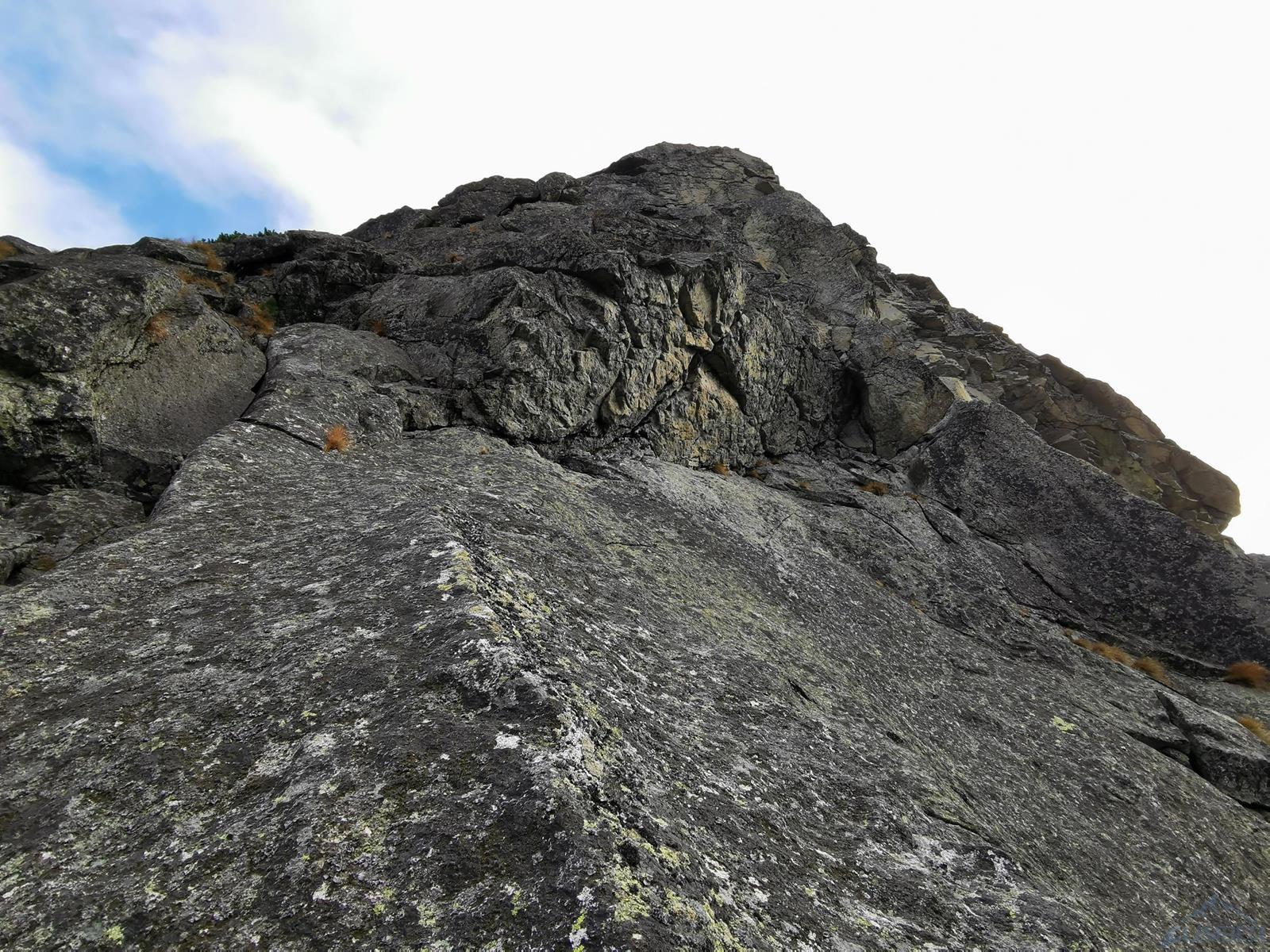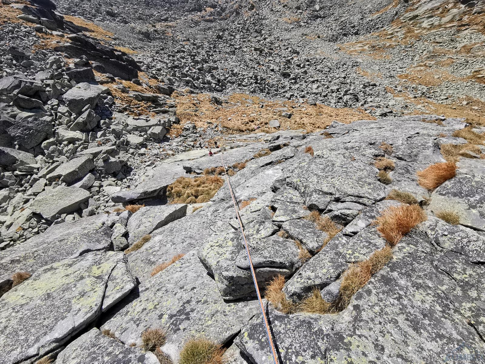 Wymarznięci chowamy się za skałami i czekamy na rozwój sytuacji – niestety po godzinie porzucamy nadzieję na przejście nawet którejś z łatwiejszych dróg i schodzimy do Pleasa. Jak już wspomniałem na wstępie, nie odpuszczamy jednak i próbujemy podziałać jeszcze na Osterwie – wchodzimy w drogę Stredom steny/Ľavá veža (VI+). Pierwszy wyciąg (V) to delikatne balansowanie pomiędzy kruchymi skałami i bujną roślinnością, liczymy na lepsze wspinanie wyżej. Już stojąc na stanowisku pod drugim wyciągiem widzimy, że nie jest jednak dobrze, a gdy pochodzę pod kluczowy odcinek – ten okazuje się zarośnięty gęstymi kępami trawy. Na dodatek dalej wygląda to jeszcze gorzej – zieleń mocno opanowała zacięcia i płyty na kolejnych wyciągach. Odpuszczamy i zjeżdżamy pod ścianę – tym razem drogi zdecydowanie więc nie polecam 😊.