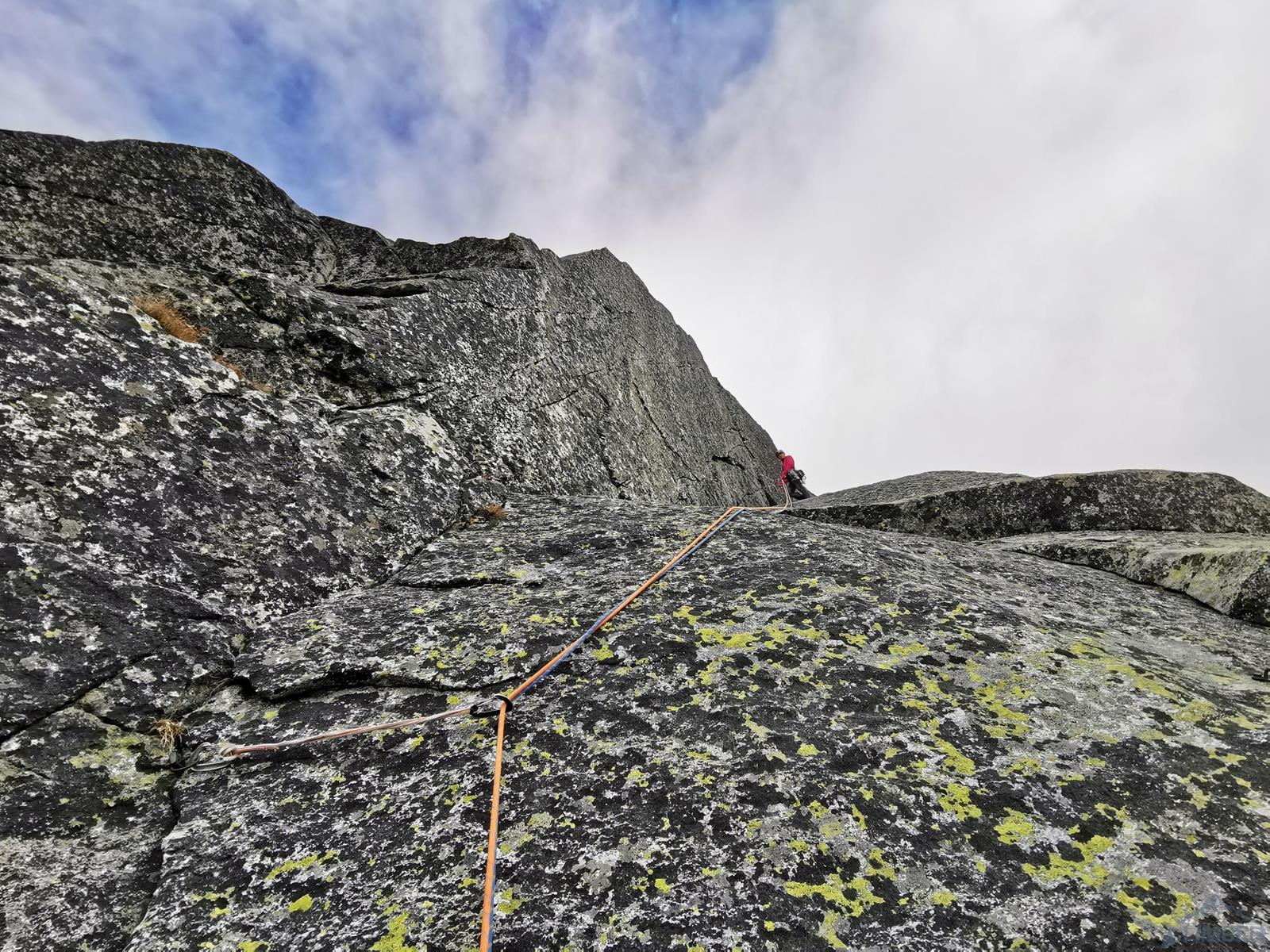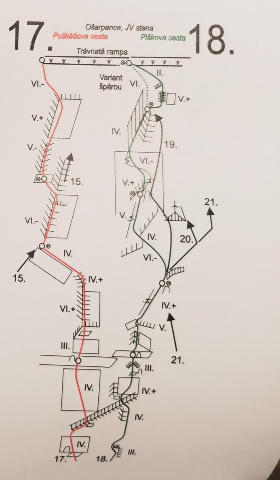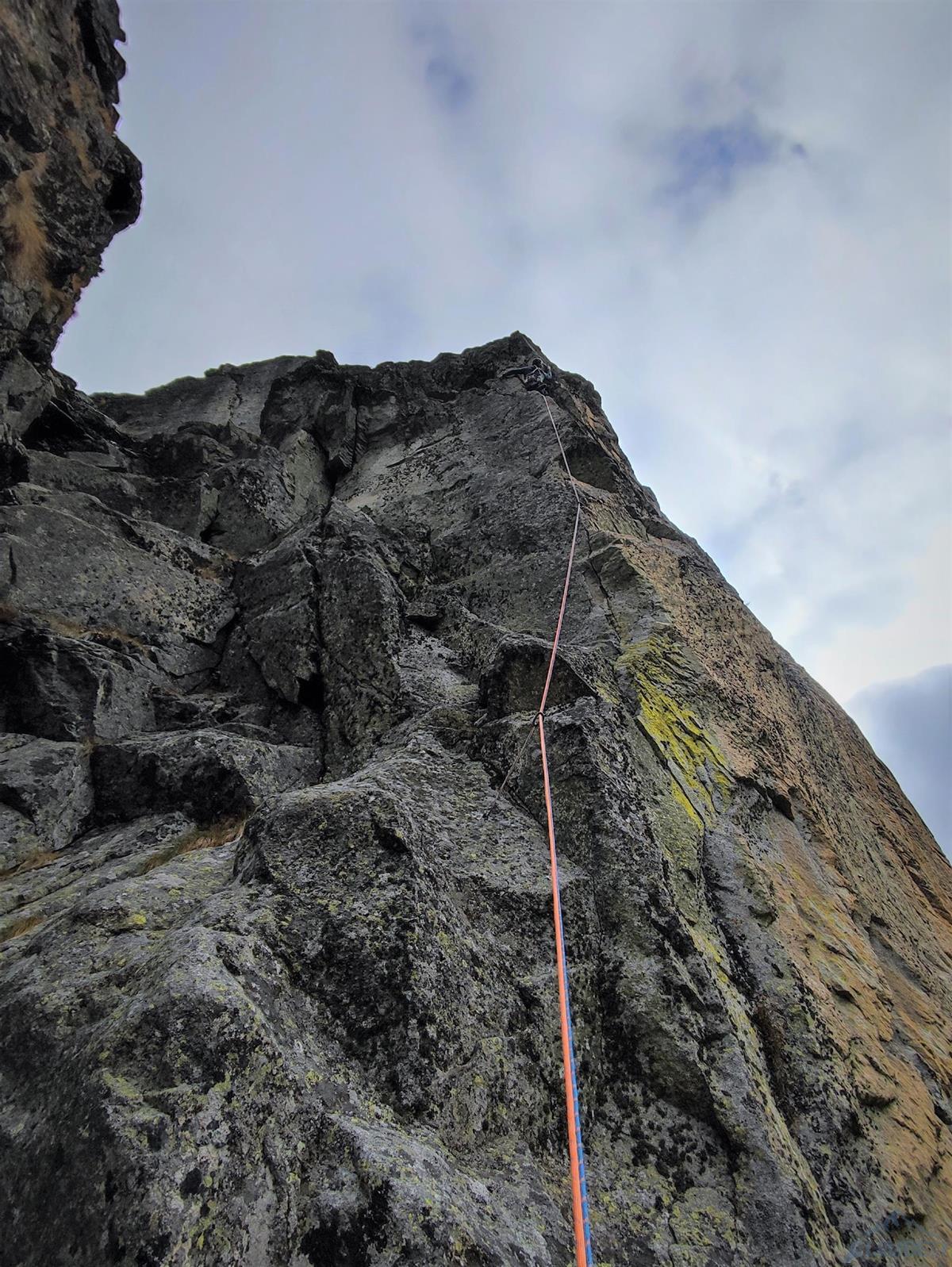 Ze stanowiska wspinamy się wprost do góry i mijamy przewieszenie po lewej stronie (V, haki), dopiero nad nim przechodząc do rysy. Już po ok. 15 metrach dojdziemy do stanowiska (spit), z którego rozchodzą się cztery drogi – poza naszą są to Staré časy (VI-), Magické oko (VII, RELACJA), i Bravo Mozart (VII+). Trzeci wyciąg Plška zaczyna się tarciowym trawersem (VI-) do pięknej poziomej rysy – po jej przejściu kierujemy się do góry wzdłuż pęknięć (V) do stanowiska. Wyżej czekają kolejne piękne rysy (VI-), z których wydostajemy się do łatwiejszego (IV) zacięcia, nad którym zlokalizowany jest kolejny stan. Ania szybko i sprawnie przechodzi trudności, im wyżej jednak jesteśmy, tym pogoda psuje się coraz bardziej – chmury coraz bardziej gęstnieją, a wiatr zaczyna wściekle uderzać po ścianie. Ostatni wyciąg robimy już przy bardzo niskiej odczuwalnej temperaturze – wracam na prowadzenie by przejść niebanalny kominek wyjściowy (V+), można rozważyć wariant wprost (VI) rysą – ta jest jednak często mokra i dość wypychająca (robiłem przy okazji przejścia Magicznego Oka). Stanowisko znajdziemy po wyjściu w łatwy teren na lewo, do zjazdówki nad Kominem Komarnickiego schodzimy później kilkanaście metrów dalej – do podstawy zachodniej ściany mamy równe 60 metrów.