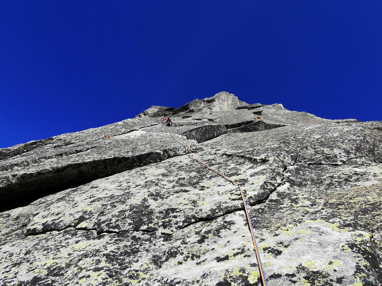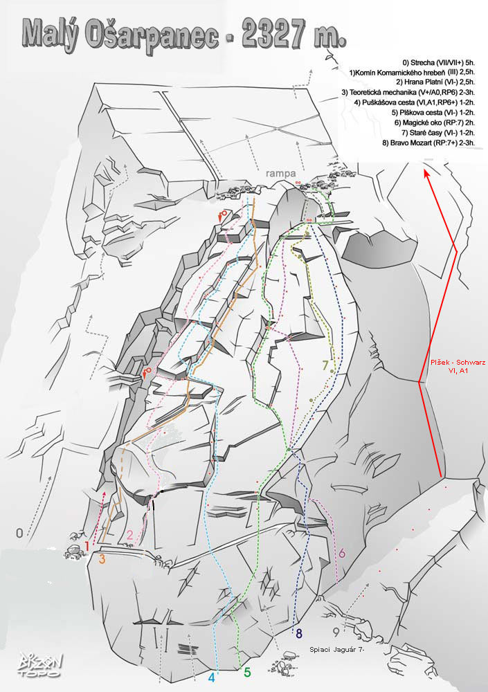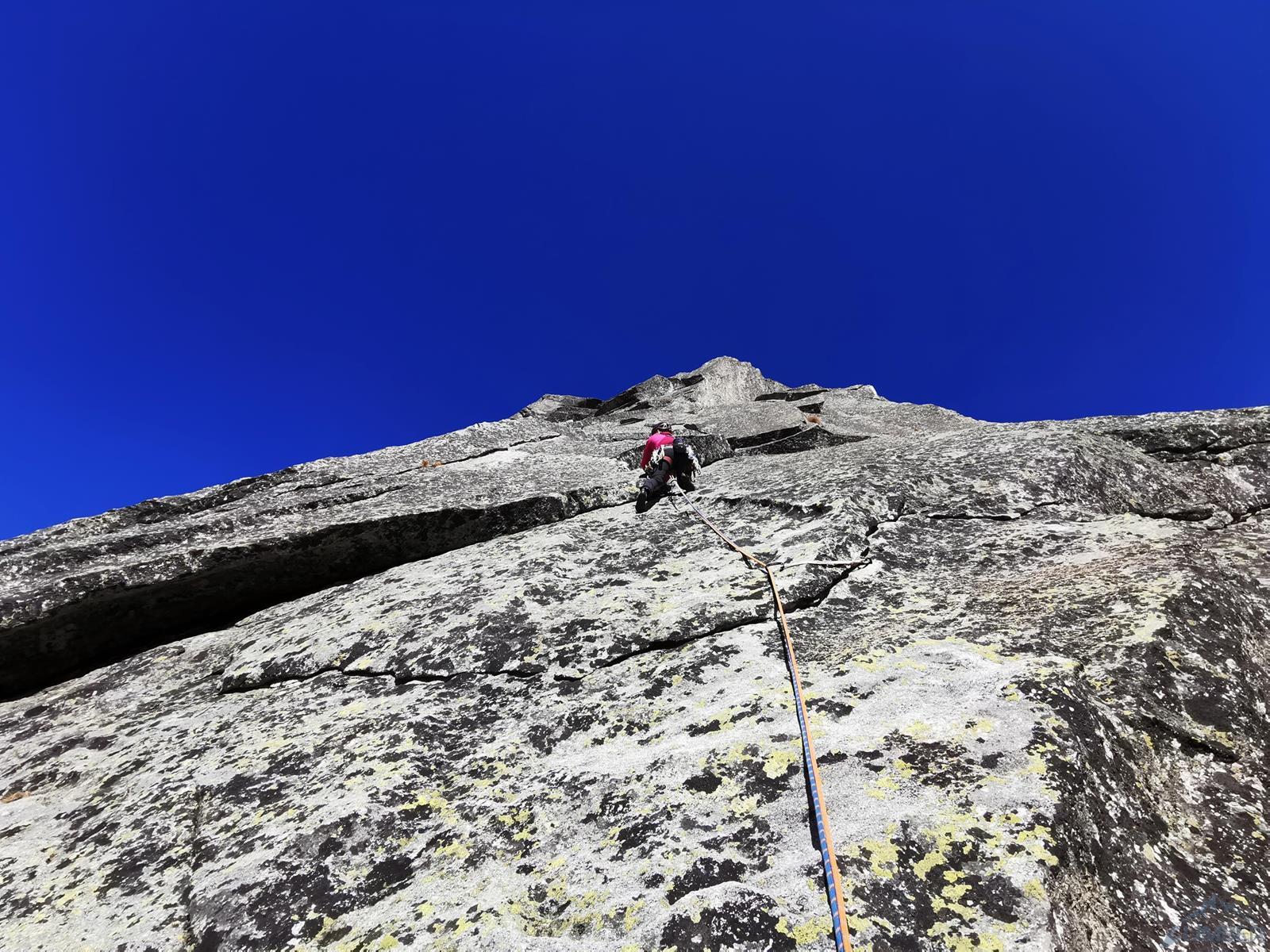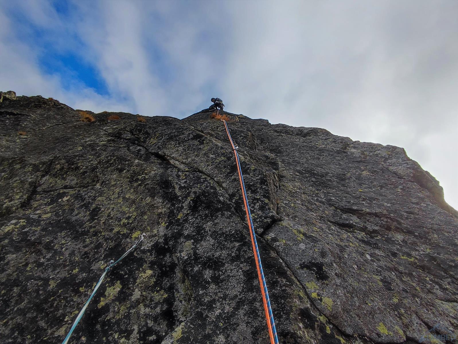 Ze stanowiska wspinamy się wprost do góry i mijamy przewieszenie po lewej stronie (V, haki), dopiero nad nim przechodząc do rysy. Już po ok. 15 metrach dojdziemy do stanowiska (spit), z którego rozchodzą się cztery drogi – poza naszą są to Staré časy (VI-), Magické oko (VII, RELACJA), i Bravo Mozart (VII+). Trzeci wyciąg Plška zaczyna się tarciowym trawersem (VI-) do pięknej poziomej rysy – po jej przejściu kierujemy się do góry wzdłuż pęknięć (V) do stanowiska. Wyżej czekają kolejne piękne rysy (VI-), z których wydostajemy się do łatwiejszego (IV) zacięcia, nad którym zlokalizowany jest kolejny stan. Ania szybko i sprawnie przechodzi trudności, im wyżej jednak jesteśmy, tym pogoda psuje się coraz bardziej – chmury coraz bardziej gęstnieją, a wiatr zaczyna wściekle uderzać po ścianie. Ostatni wyciąg robimy już przy bardzo niskiej odczuwalnej temperaturze – wracam na prowadzenie by przejść niebanalny kominek wyjściowy (V+), można rozważyć wariant wprost (VI) rysą – ta jest jednak często mokra i dość wypychająca (robiłem przy okazji przejścia Magicznego Oka). Stanowisko znajdziemy po wyjściu w łatwy teren na lewo, do zjazdówki nad Kominem Komarnickiego schodzimy później kilkanaście metrów dalej – do podstawy zachodniej ściany mamy równe 60 metrów.