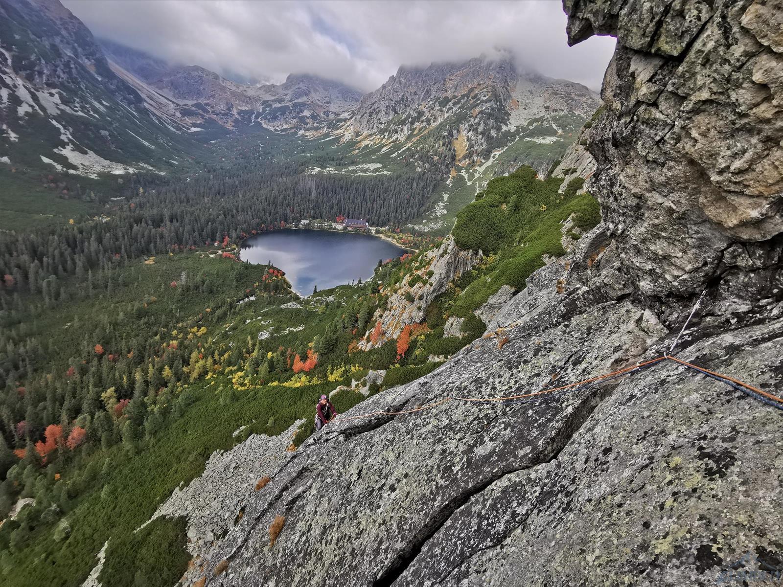 Weekend nad Popradzkim Stawem – mimo wcześniejszych dobrych prognoz pogoda nie pozwala niestety na realizację planów. W sobotę jest pochmurnie i zimno, kierujemy się pod Galerię Osterwy – tutaj udaje zrobić się jedynie krótką Haninę (VII+) z końcówką Foxuv sen (VII-). Niedziela wita nas piękną pogodą, gdy jednak rozgrzewamy się na znanej mi już drodze Plška (VI-) na Szarpanej, pojawiają się chmury i mocny wiatr. Temperatura odczuwalna spada poniżej zera i choć drogę kończymy, o działaniu na zachodniej ścianie możemy zapomnieć. Czując niedosyt zbiegamy do Plesa i podchodzimy pod Osterwę. Próbujemy Stredom steny (VI+) – niestety zaliczam odwrót spod trudności na kluczowym wyciągu, który jest kompletnie zarośnięty.