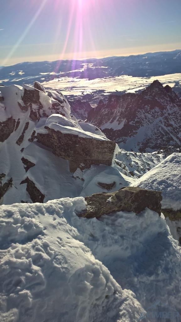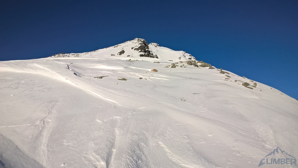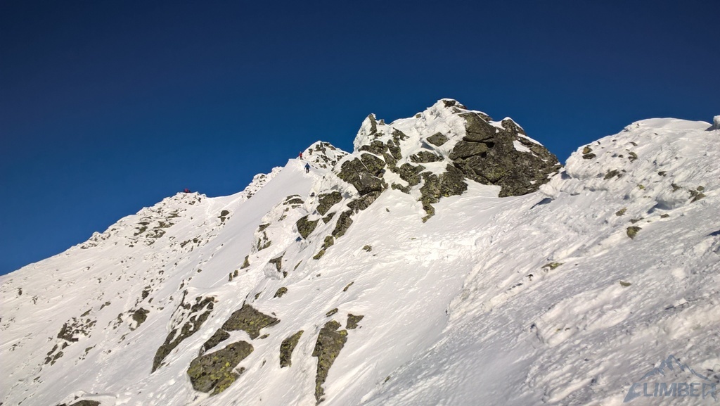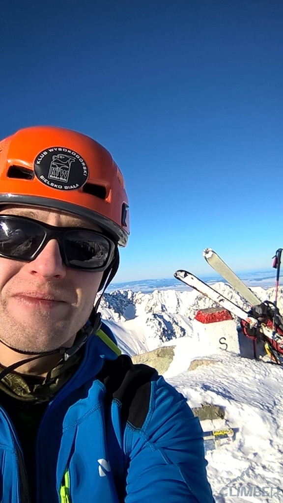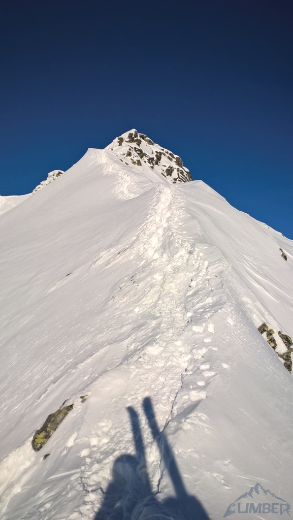 Narty ściągam tylko na chwilę by pokonać próg wyprowadzający do Kotlinki Pod Wagą. Na samej Przełęczy okazuje się, że na fokach da się dojść aż pod grań szczytową, dokładam więc tylko harszle i gnam do góry. Na wierzchołek docieram ściśle granią, z nartami już na plecach. Delektuję się niespotykaną za często samotnością na najwyższym szczycie naszego kraju :) Od strony polskiej śladów brak, widać przy trójce lawinowej nikt nie ryzykował podejścia od Czarnego Stawu.