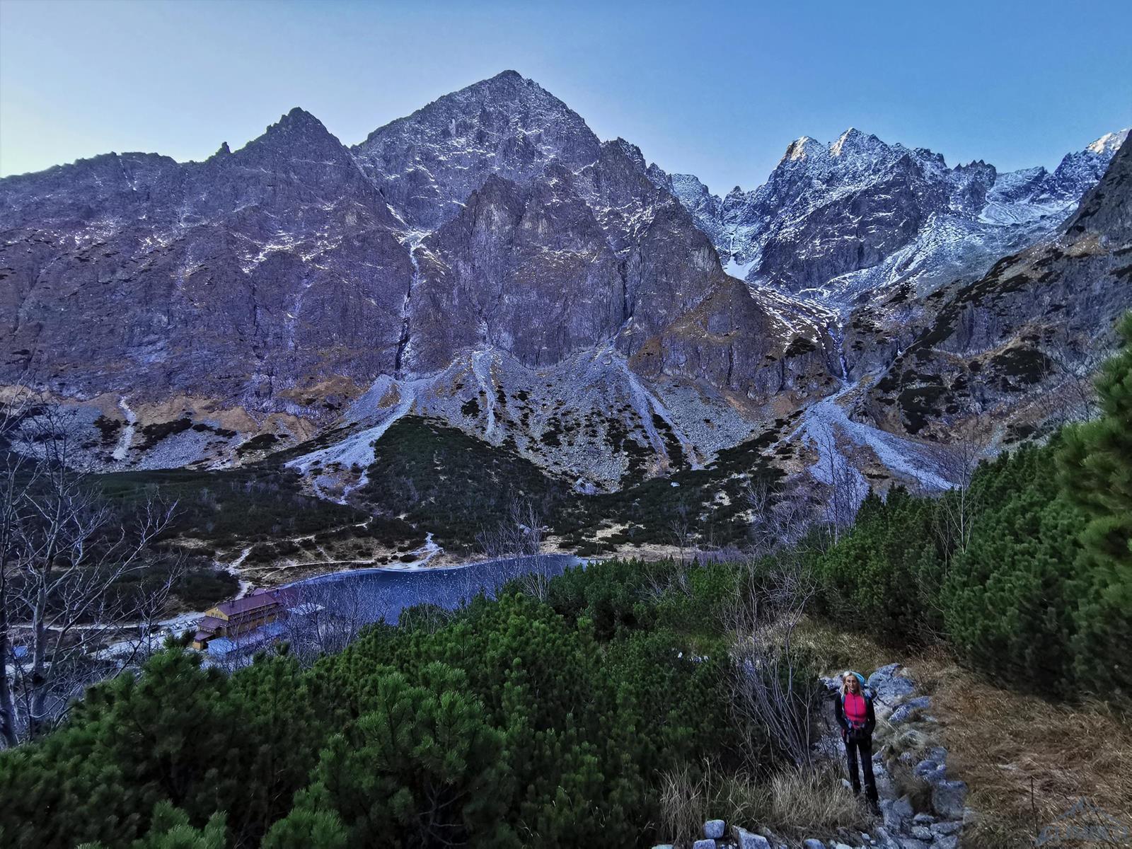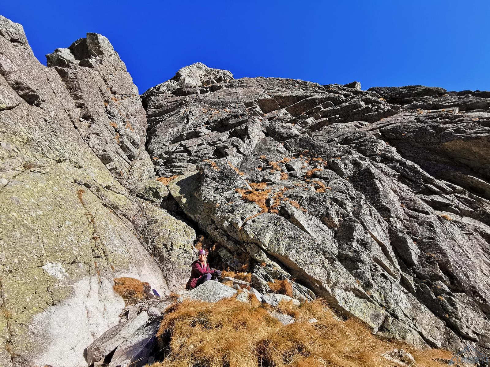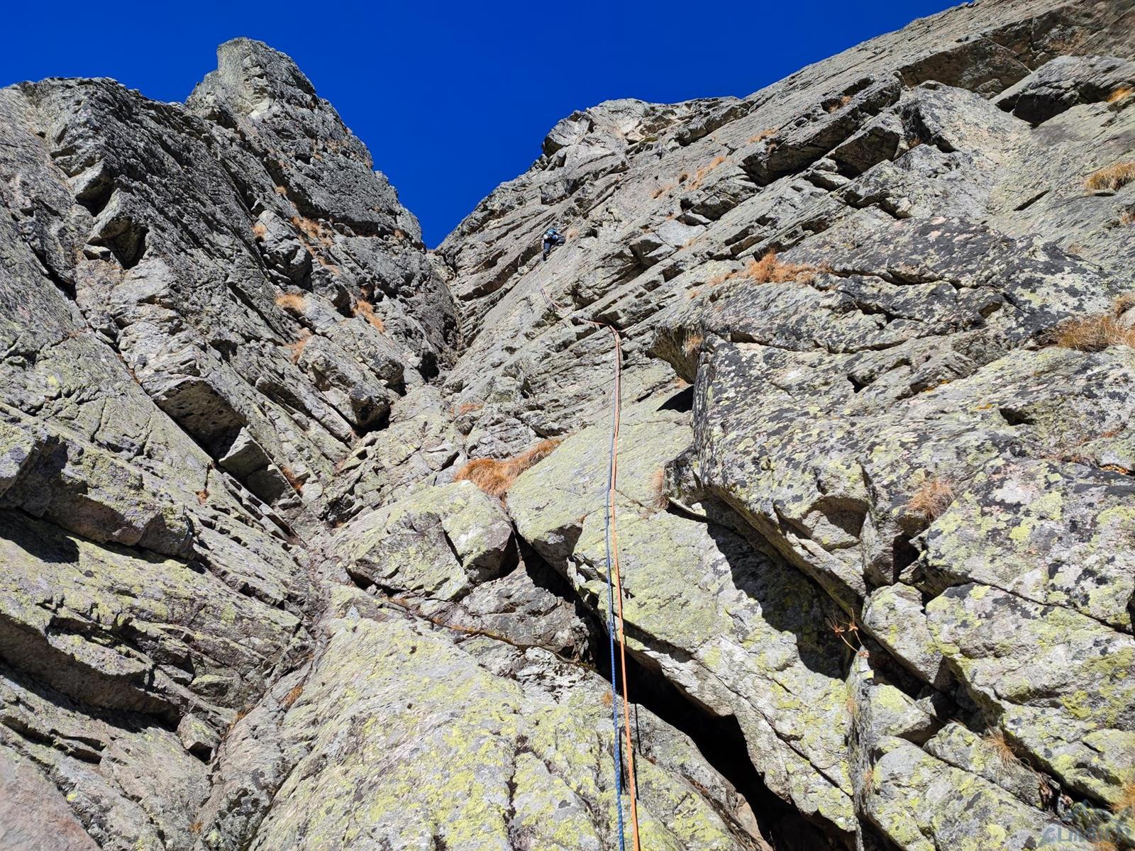Dzięki niskiemu położeniu i południowej wystawie na Rzeżuchowych Turniach wspinać można się zarówno wczesną wiosną, jak i późną jesienią – nawet przy ujemnych w cieniu temperaturach. W listopadowy poranek podchodzimy do opustoszałego schroniska nad zamarzniętym już Zielonym Stawem Kieżmarskim, skąd pod ścianę jest zaledwie pół godziny. Ania obiera za cel piękną płytę na drodze Korsvoldov tanec (VII), którą robiłem kilka lat temu i gorąco polecam (RELACJA). Plan dla mnie to z kolei poprowadzenie wytyczonego w 2019 Fantomasa (VIII). Pierwszą drogę niestety odpuszczamy – rano wieje i jest zbyt zimno na krawądki, po zjeździe spod trudności przenosimy się na łatwiejszego klasyka, również już mi znanego – Známkę monzunu (V+).