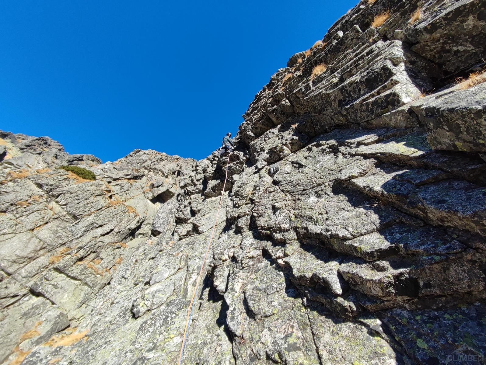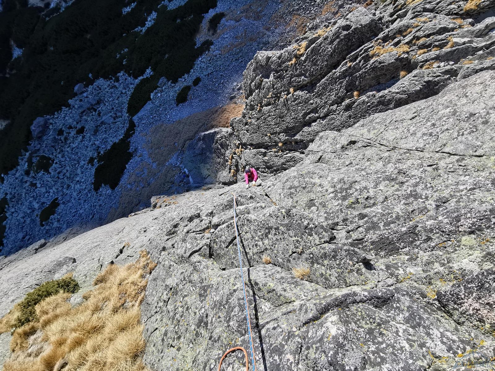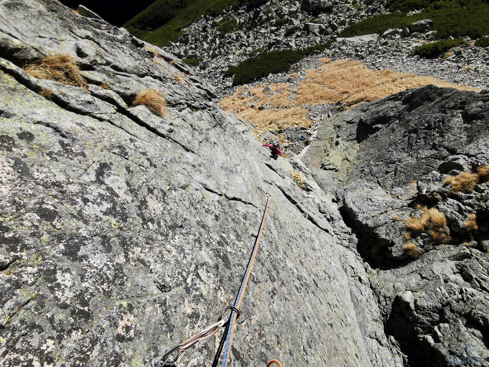 Na drugim wciągu (V) przechodzimy w lewo i wspinamy się płytami wypatrując pierwszego spita, po dojściu do kolejnego skręcamy w prawo, przechodzimy uklamiony okapik. Nad nim trawersujemy mocno w lewo (trzeci spit) aż do stanowiska. Trzeci odcinek (V-) zaczyna się świetnie urzeźbioną ścianką po lewej, z której wchodzimy do podciętego zacięcia (hak). Po wyjściu w łatwy teren przechodzimy na żebro, którym kontynuujemy aż do finalnego stanowiska z taśmami i mailonami. Stąd czeka nas ok. 20 metrów zjazdu/zejścia granią do łańcucha i dwa dłuższe zjazdy - Korsvoldovem lub Fantomasem. Známkę robiłem dodatkowo w 2014 roku, po innym klasyku, drodze Cez Knihu - relacja TUTAJ.