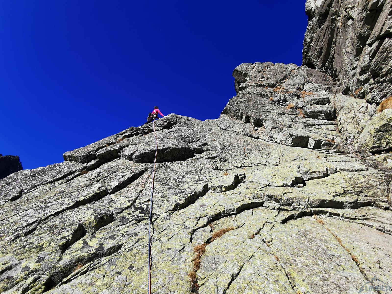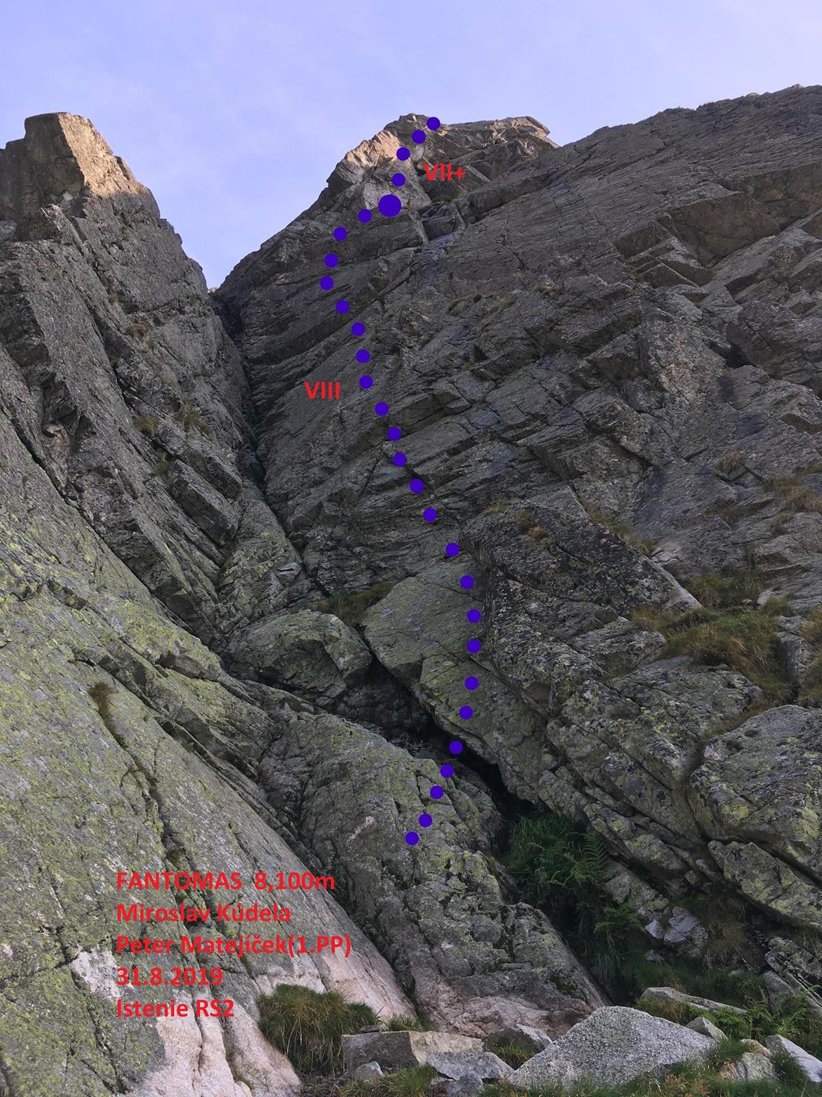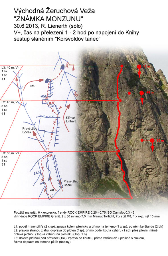 Na drugim wciągu (V) przechodzimy w lewo i wspinamy się płytami wypatrując pierwszego spita, po dojściu do kolejnego skręcamy w prawo, przechodzimy uklamiony okapik. Nad nim trawersujemy mocno w lewo (trzeci spit) aż do stanowiska. Trzeci odcinek (V-) zaczyna się świetnie urzeźbioną ścianką po lewej, z której wchodzimy do podciętego zacięcia (hak). Po wyjściu w łatwy teren przechodzimy na żebro, którym kontynuujemy aż do finalnego stanowiska z taśmami i mailonami. Stąd czeka nas ok. 20 metrów zjazdu/zejścia granią do łańcucha i dwa dłuższe zjazdy - Korsvoldovem lub Fantomasem. Známkę robiłem dodatkowo w 2014 roku, po innym klasyku, drodze Cez Knihu - relacja TUTAJ.