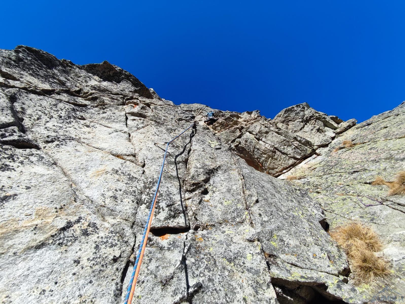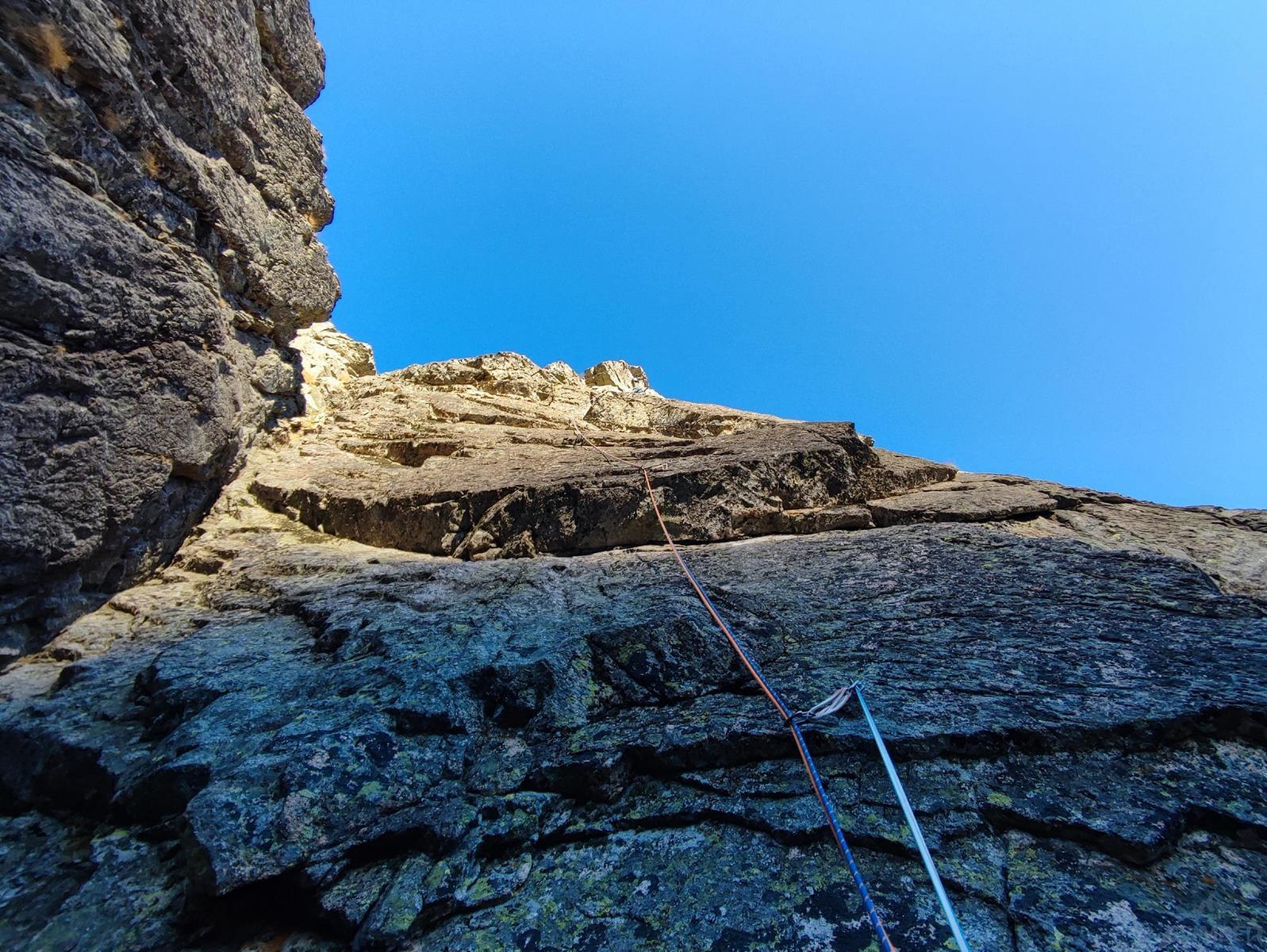 Chwilę odpoczywamy i ruszamy na drugą drogę, późno-jesienne Słońce już przed 14-tą schowa się za Durny, nie mam więc dodatkowego czasu na patentowanie – czyli albo szybkie przejście albo wycof 😊. Oryginalnie pierwszy wyciąg ma prawie 60 metrów, podobnie jak kolega który robił ją w tym roku, postanawiam więc rozbić go na dwie części. Początkowy odcinek to bardzo ładne płytowe wspinanie za ok. VI/VII (spity odległe ale bezpiecznie), stanowisko (spit + kość) robię na małej półeczce pod poziomym okapikiem, gdzie czekają główne trudności. Crux to krótki i dość ewidentny bulder, wg mnie raczej VII+/VIII- niż VIII – za pierwszym razem nie trafiam co prawda do chwytu, za drugim całość idzie jednak sprawnie. Po wyjściu nad okapik mamy trochę stresującą wpinkę (można coś dołożyć) i jeden techniczny fragment, po czym zacięciem wydostajemy się w łatwy teren i podchodzimy do stanowiska.