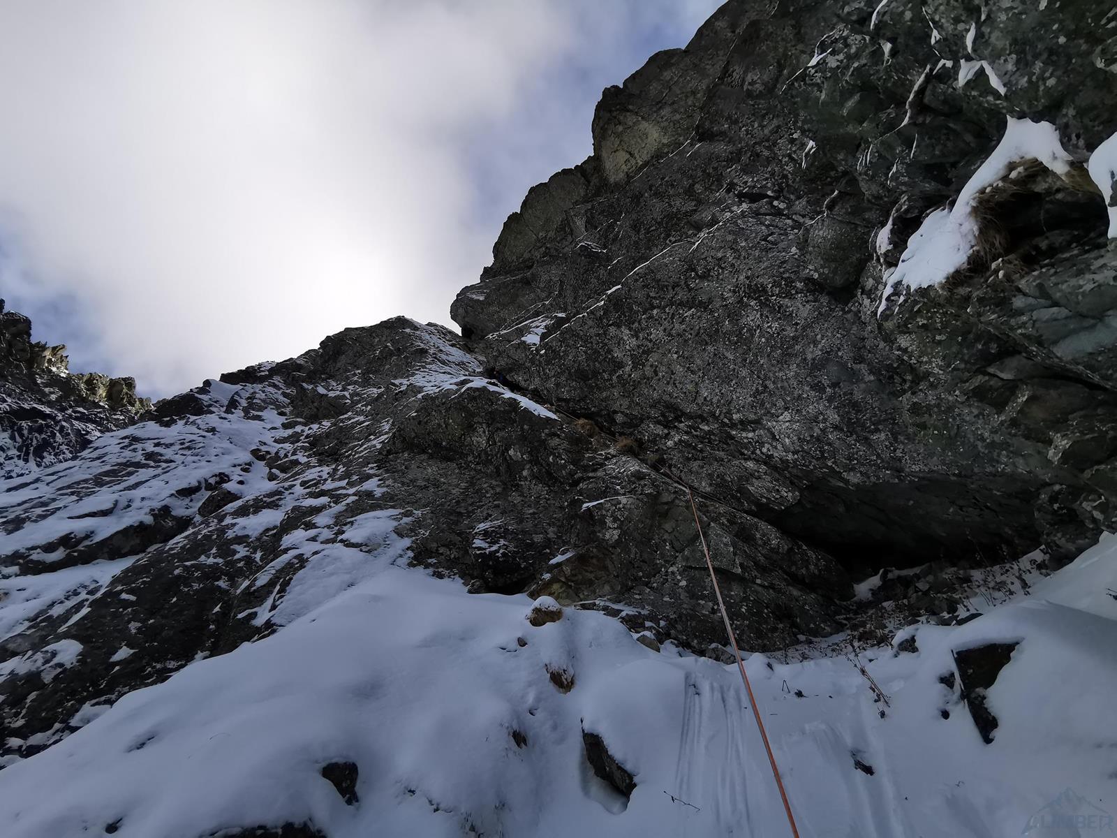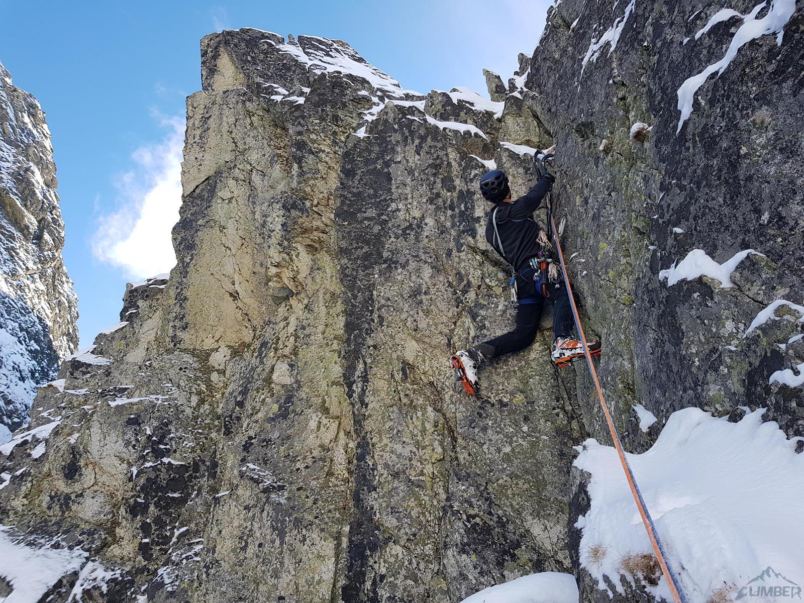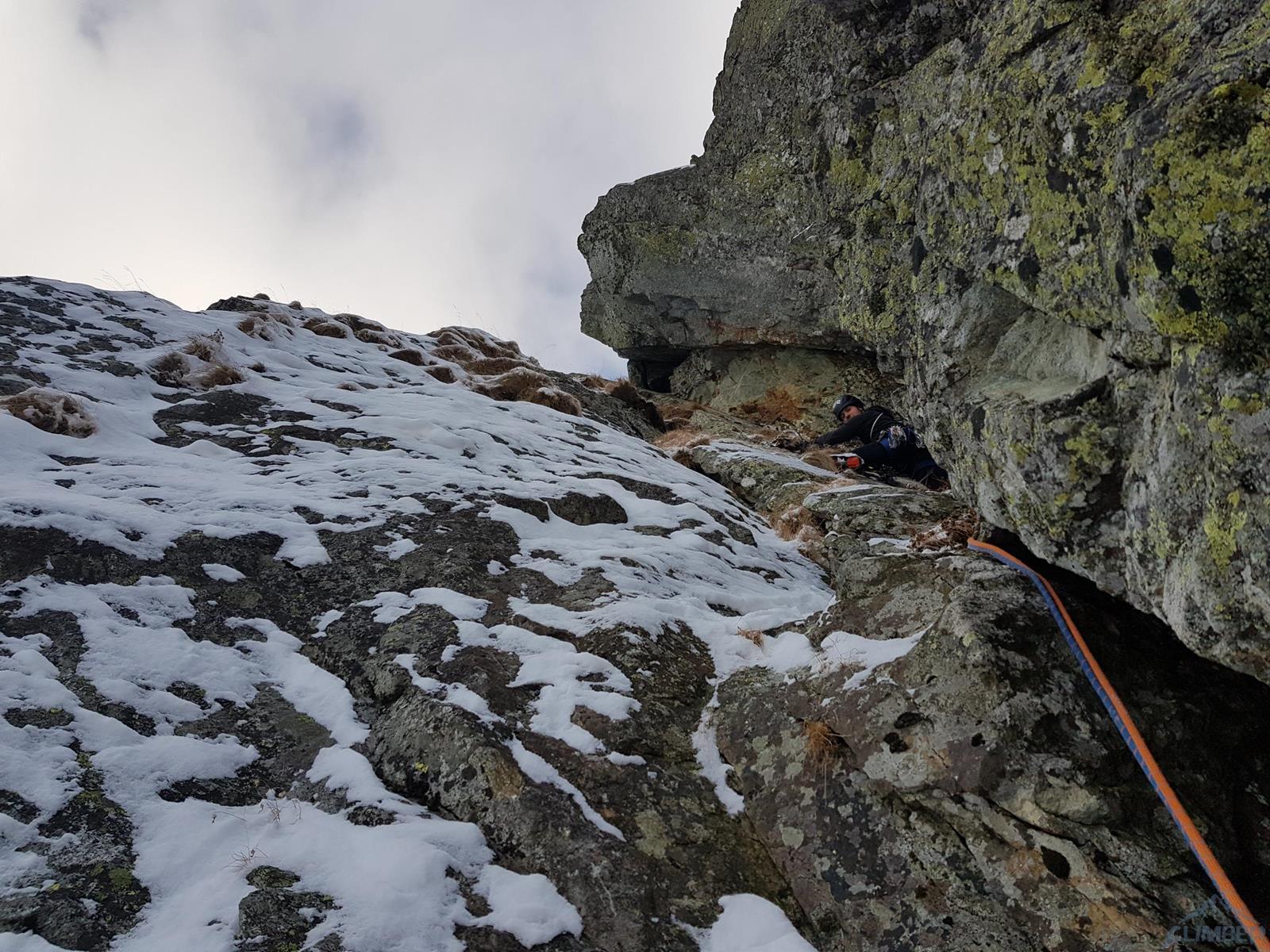 Początek drogi zlokalizować jest bardzo łatwo – wypatrujemy wielkiej skośnej załupy przecinającej ściany dwóch turni, na których znajduje się kilka obitych letnich dróg (m.in. Júnová i Augustová). Startujemy grzędą i kierujemy się w stronę załupy – przewinięcie do niej to jedyny trudniejszy fragment (sprężne M4 na własnej) na tym prawie 50-metrowym wyciągu. Stanowisko znajduje się obok bardzo obszernej jamy skalnej. Na drugim wyciągu (ok. 30 m) po kilku łatwiejszych metrach dochodzimy do gładkiej połogiej płyty – linię wspinania wyznaczają spity (M5) i choć trudności dałoby się ominąć lewą stroną, warto zafundować sobie kawałek fajnego i bezpiecznego drytoolingu. Pod koniec czeka nas jeszcze ciasny kominek, nad którym znajdziemy dwa stanowiskowe spity.