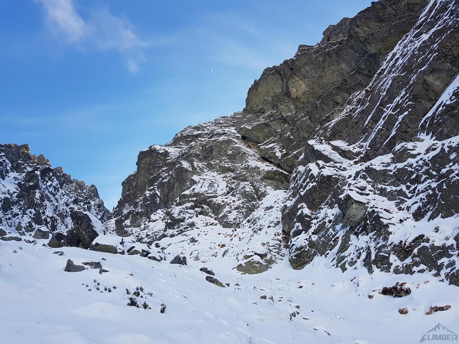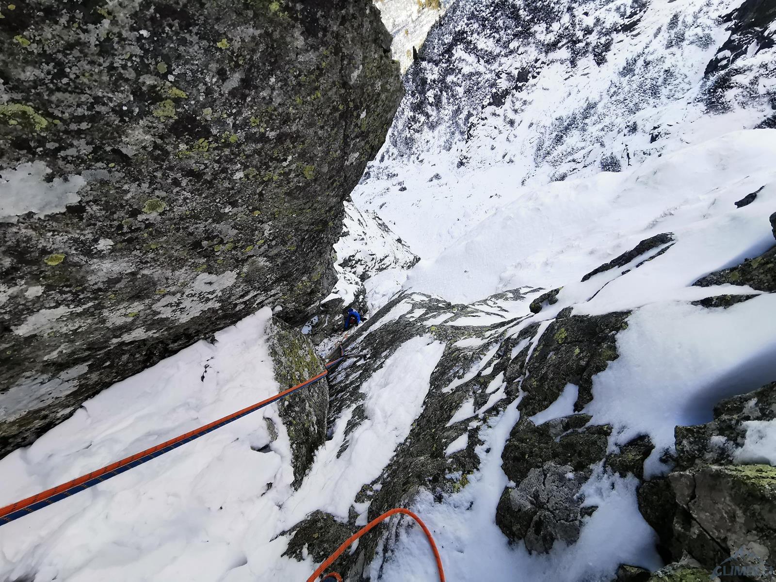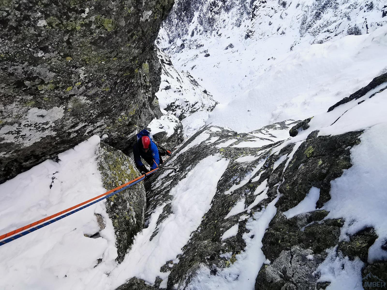Początek drogi zlokalizować jest bardzo łatwo – wypatrujemy wielkiej skośnej załupy przecinającej ściany dwóch turni, na których znajduje się kilka obitych letnich dróg (m.in. Júnová i Augustová). Startujemy grzędą i kierujemy się w stronę załupy – przewinięcie do niej to jedyny trudniejszy fragment (sprężne M4 na własnej) na tym prawie 50-metrowym wyciągu. Stanowisko znajduje się obok bardzo obszernej jamy skalnej. Na drugim wyciągu (ok. 30 m) po kilku łatwiejszych metrach dochodzimy do gładkiej połogiej płyty – linię wspinania wyznaczają spity (M5) i choć trudności dałoby się ominąć lewą stroną, warto zafundować sobie kawałek fajnego i bezpiecznego drytoolingu. Pod koniec czeka nas jeszcze ciasny kominek, nad którym znajdziemy dwa stanowiskowe spity.