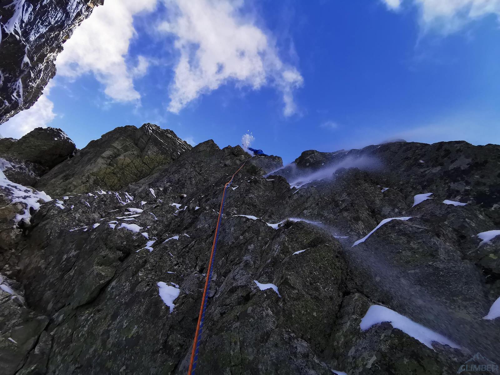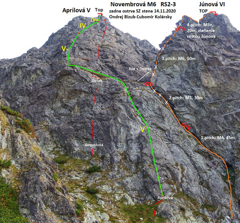 Kolejny wyciąg (M6, ok. 50 m) jest ciekawy i zróżnicowany. Ze żlebu wchodzimy na stromą ściankę i wspinamy się po dobrych chwytach do dwóch widocznych spitów, następnie skręcamy w lewo i kierujemy się do przewieszonego zacięcia – trudniejszy fragment. Do stanowiska docieramy przystępniejszym terenem. Na ostatnim wyciągu (20 m) czeka nas bardzo ładne zacięcie za M5+ (1 spit i dobra własna asekuracja), po jego przejściu robimy własny stan – by dostać się do łańcucha musimy pokonać jeszcze ok. 20 metrów granią, w dół i w górę. Zjeżdżamy linią drogi Júnová, warto rozeznać lokalizację stanowisk bo mogą być zasypane - tak jest również w naszym przypadku, mamy jednak łatwiej bo zjazdy robiłem w przeszłości po przejściu drogi Májová.
