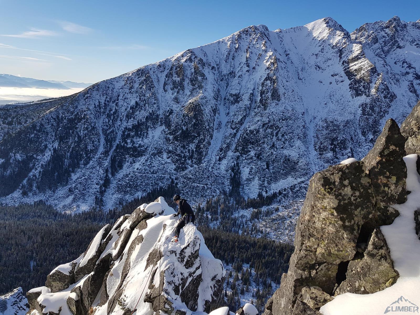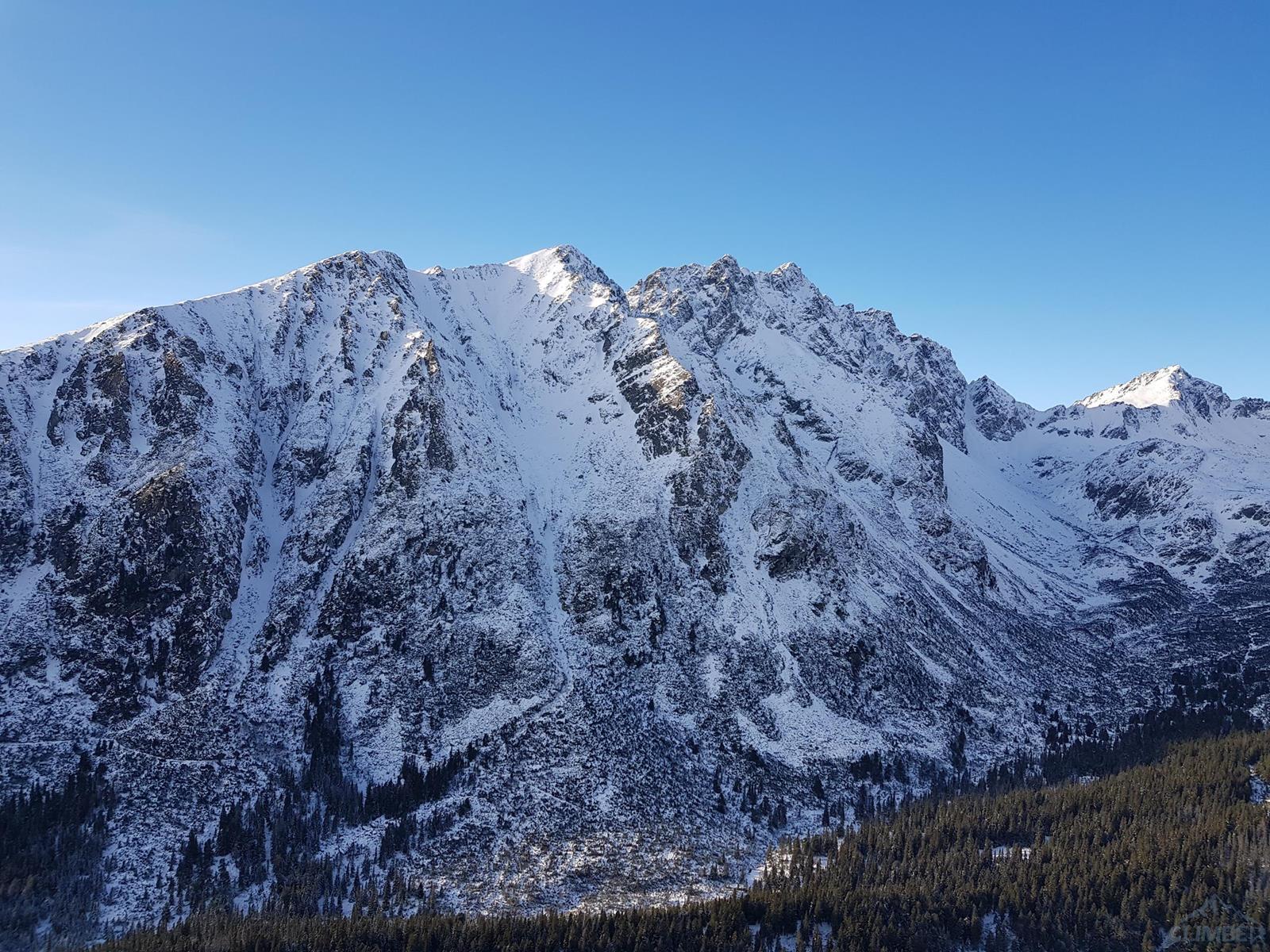 Na rozpoczęcie sezonu zimowego w Tatrach wybieramy krótką, niedawno (2020) wytyczoną linię na Osterwie – Novembrovą (M6). Warunki śniegowe są kiepskie – po pierwszych opadach nie było jeszcze odwilży, luźny śnieg zalega w depresjach i na połogich płytach. Nasza droga zlokalizowana jest w górnej części północno-zachodniej ściany, po przekopaniu się z Cmentarza pod Galerię podchodzimy więc jeszcze dość sporo żlebem. Do pokonania mamy cztery wyciągi, najtrudniejsze fragmenty posiadają stałą asekurację, stanowiska są gotowe – coś w sam raz na komfortowy rozwspin i/lub brak warunków na dużych ścianach. Dodatkowo ze szczytu turni, na której kończymy wspinanie roztaczają się piękne widoki, m.in. na Grań Baszt czy Wysoką.