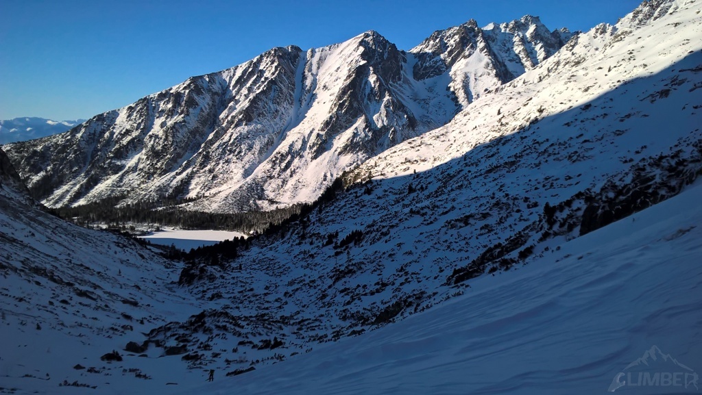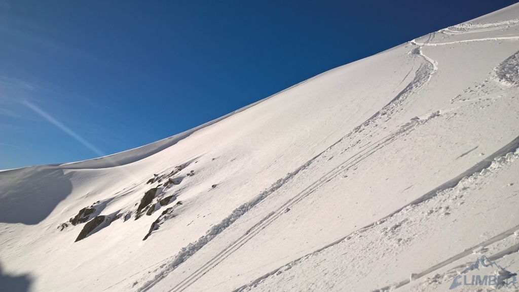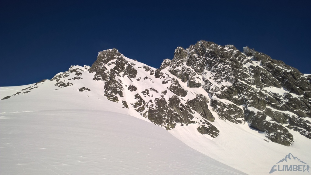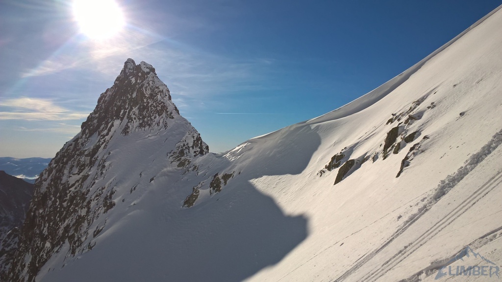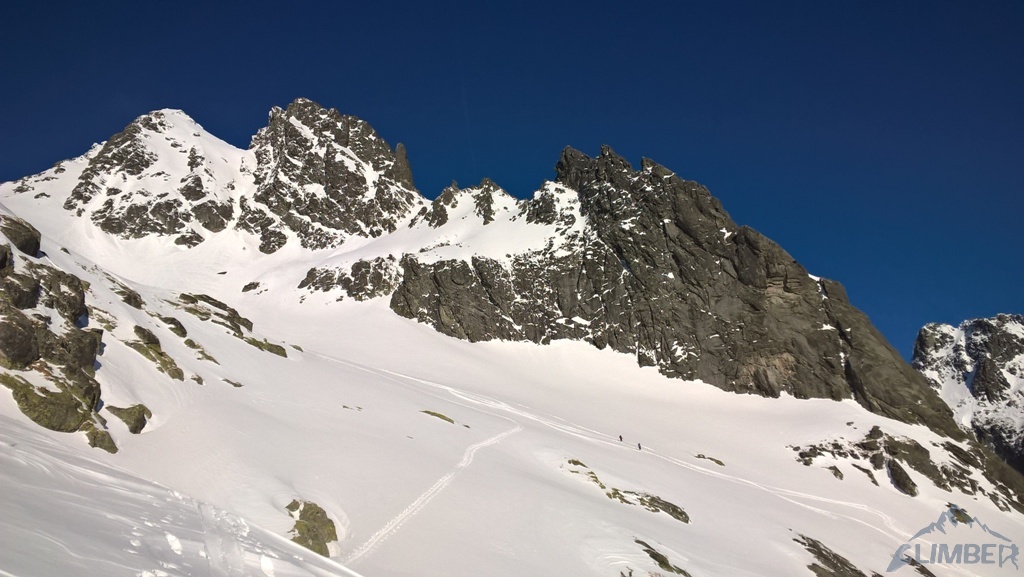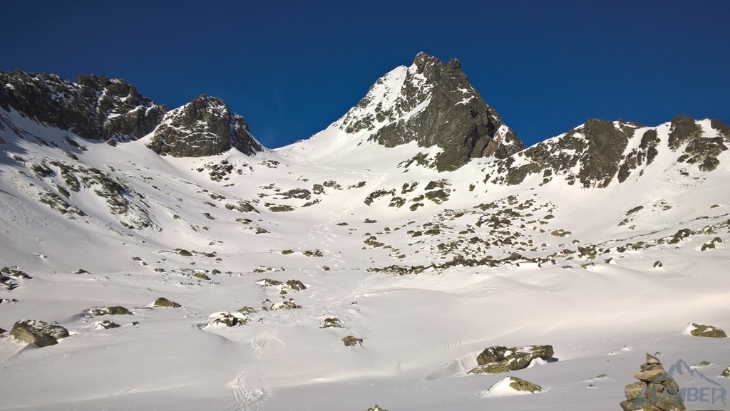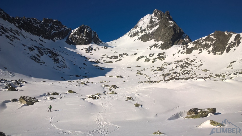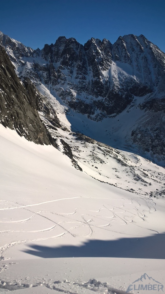 Finalnie zachodzimy do Złomiskiej Zatoki, gdzie moja partnerka zostaje na wypoczynek, a ja udaje się na Siarkańską Przełęcz, skąd kilka osób już tego dnia zjechało. Za Przełęczą rzucam jeszcze okiem na Wysoką ale wejście w żleb w tych warunkach nie wygląda za bezpiecznie więc wracam i delektuję się zjazdem, najpierw do Złomisk, później między kosówkami nad sam Popradzki Staw.