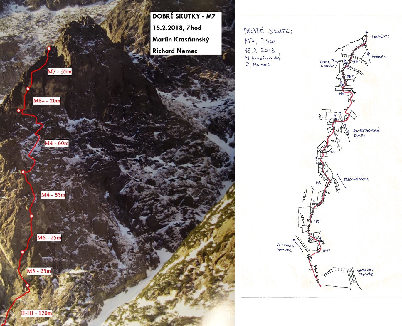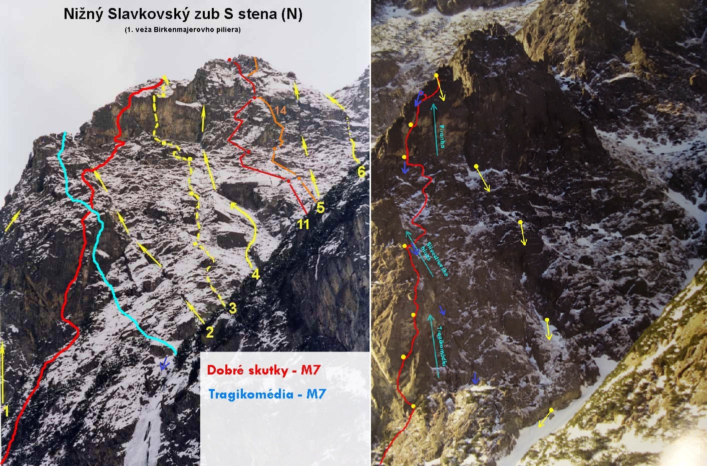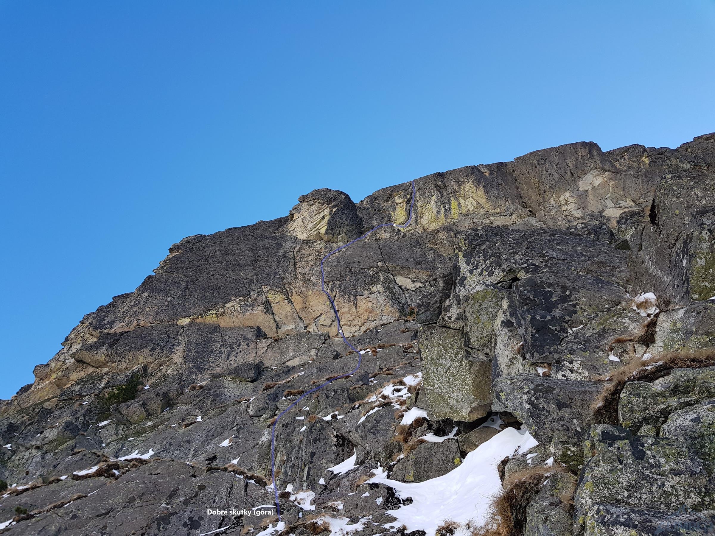 Od dłuższego czasu w Tatrach na przemian sypie i wieje, większe ściany muszą więc poczekać. Nie oznacza to jednak, że nie da się fajnie powspinać – jednym z lepszych miejsc na takie okoliczności są tzw. Królewskie Baszty położone w obrębie Filara Birkenmajera na Sławkowskim Szczycie (legenda TUTAJ). Mnóstwo krótkich ale interesujących linii znajduje się zwłaszcza na położonej zaraz nad lodospadem Veverki Niżniej Królewskiej Baszczie. Po przejściu kilku klasyków (m.in. łączone z Veverką Pontonovy kut M5+, Piranha M6+ czy Tragikomedia M7) czas na jedną z najlepszych dróg na ścianie - dłuższe i bardziej wymagające Dobré skutky (M7).