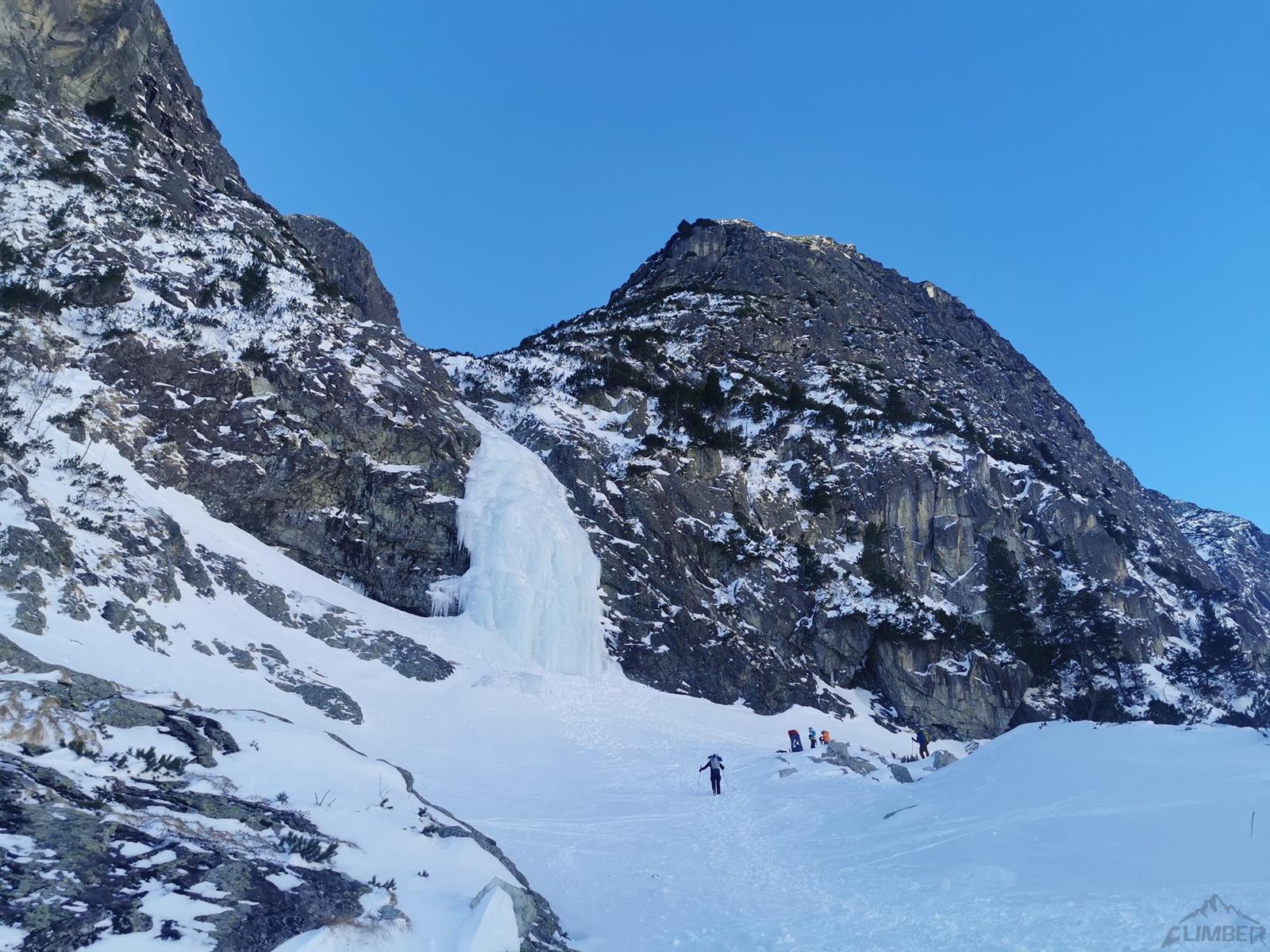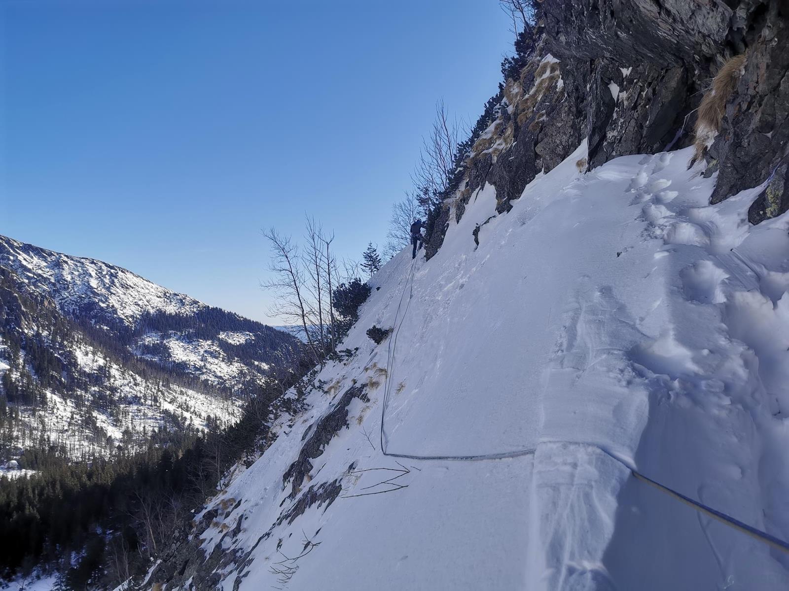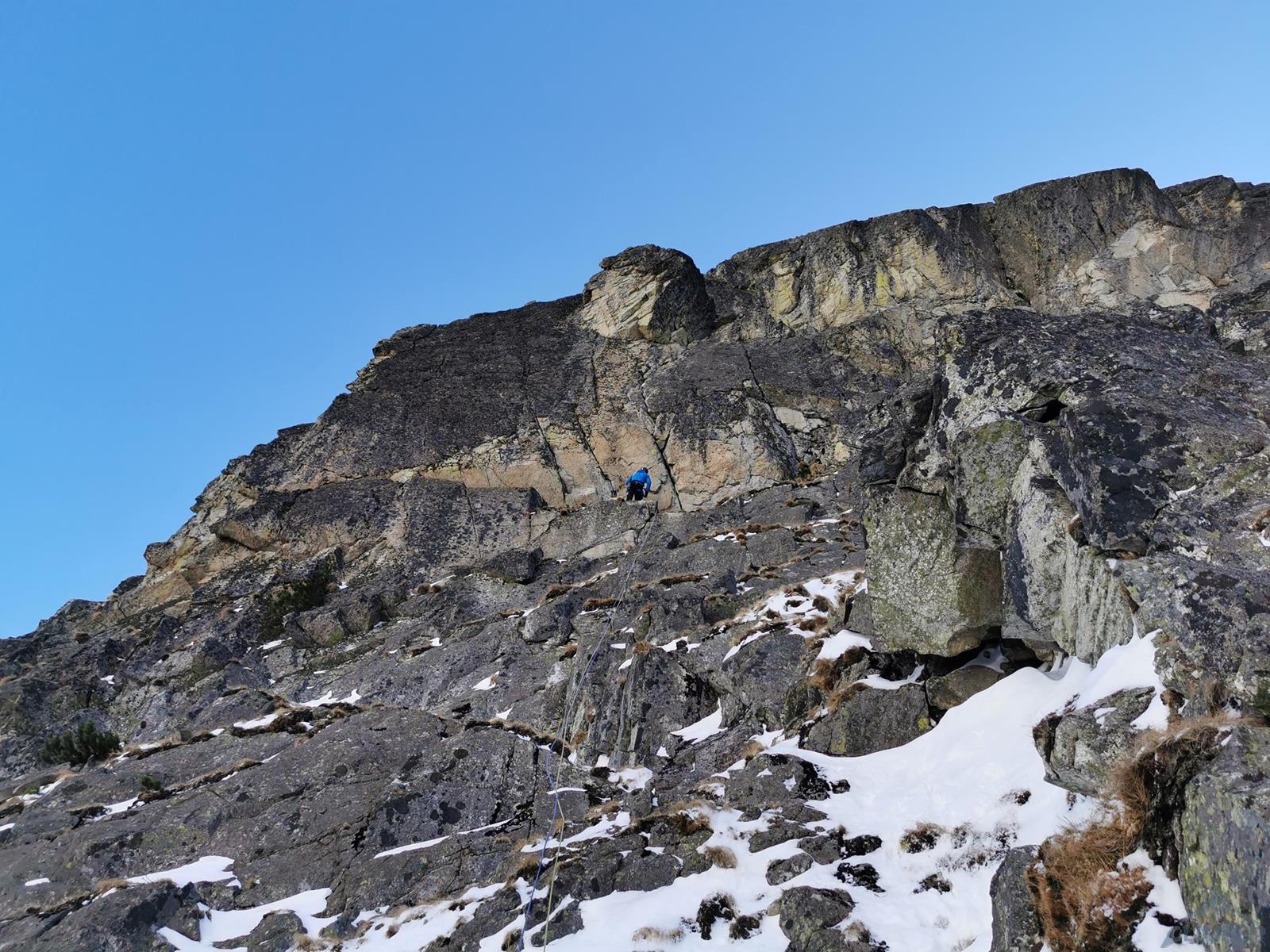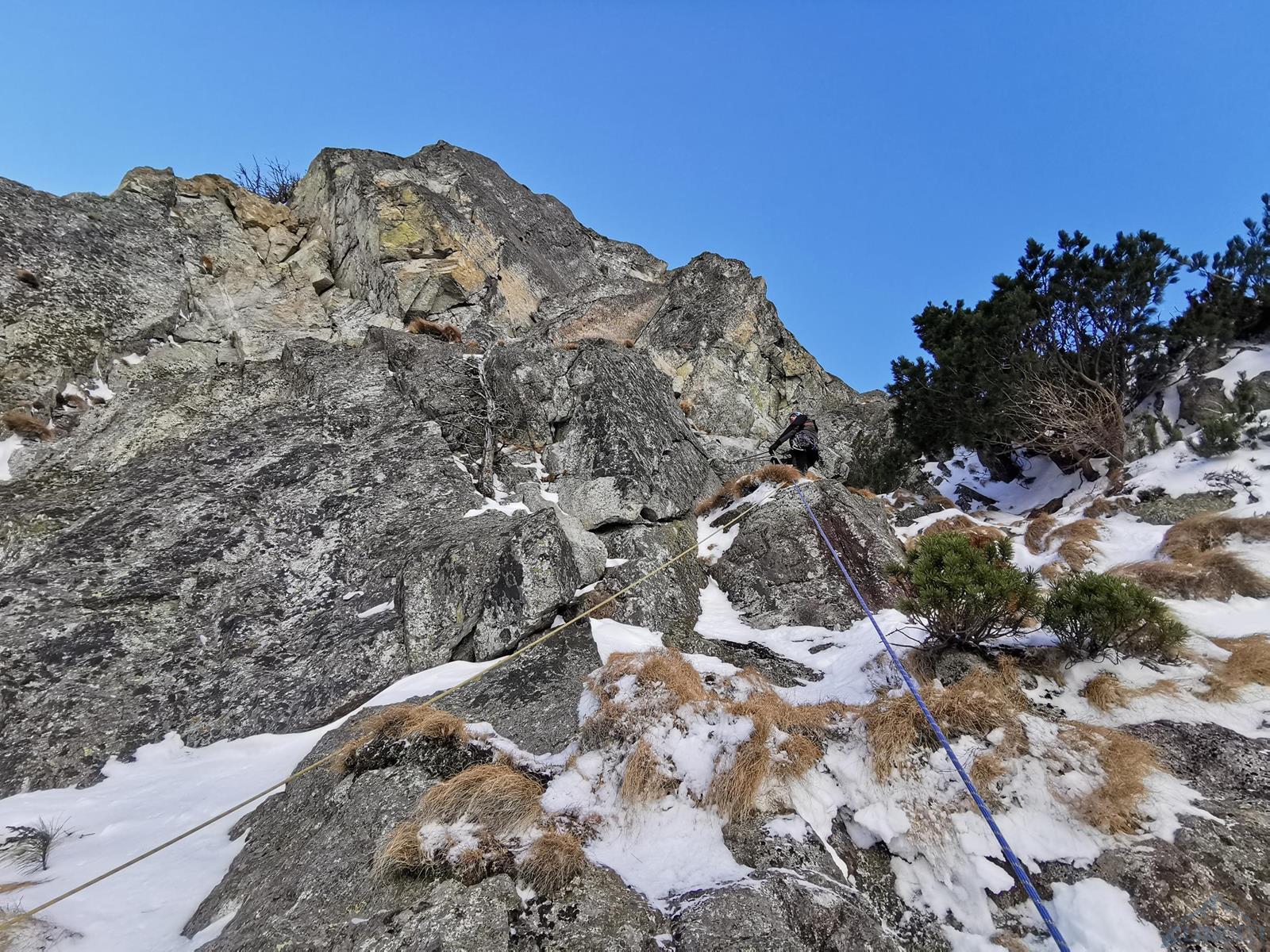 Po krótkiej popołudniowej wizycie na Zahradkach z Anią dzień wcześniej, rano spotykam się z Michałem i Szymonem i wspólnie ruszamy pod drogę. Świetnie wylany Lodospad Veverki jest tego dnia oblegany, nasza droga (jako jedna z nielicznych) startuje jednak nie nad nim, lecz ok. 50 metrów na lewo od jego podstawy, za skalnym progiem. Później dochodzę do wniosku, że gdyby ktoś się uparł to początkowy ok. 100-metrowy odcinek drogi pomiędzy kosówkami dałoby się zamienić na wspinanie w lodzie – po wyjściu z niego konieczny byłby łatwy trawers w lewo do stanowiska pod pierwszymi trudnościami. My tymczasem idziemy oryginalnie, zgodnie ze schematem autorów drogi. Po trawersie w lewo odbijamy do góry w najbardziej dogodnymi miejscu i przedzieramy się trawkowo-skalnym terenem (miejsca II-III) przez kosówki, a po dotarciu pod skały podchodzimy jeszcze kilka metrów do gotowego stanowiska ze spitów (podobne są na całej drodze). Warunki powyżej mimo niedawnych opadów okazują się kapitalne – skała jest zupełnie sucha, rysy czyste, a trawy wywiane. Kolejny strzał w dziesiątkę w tym sezonie!