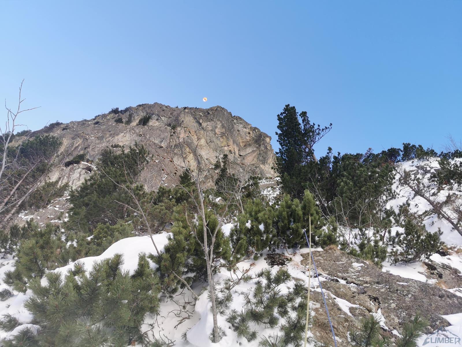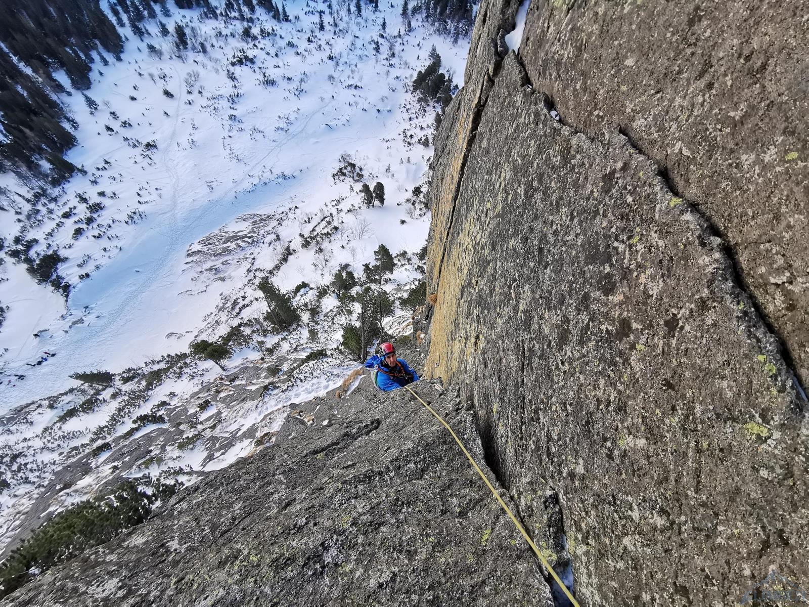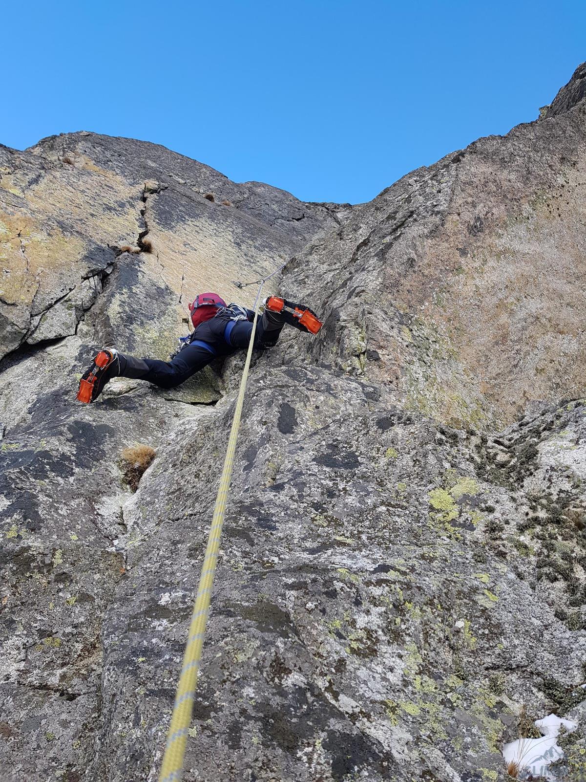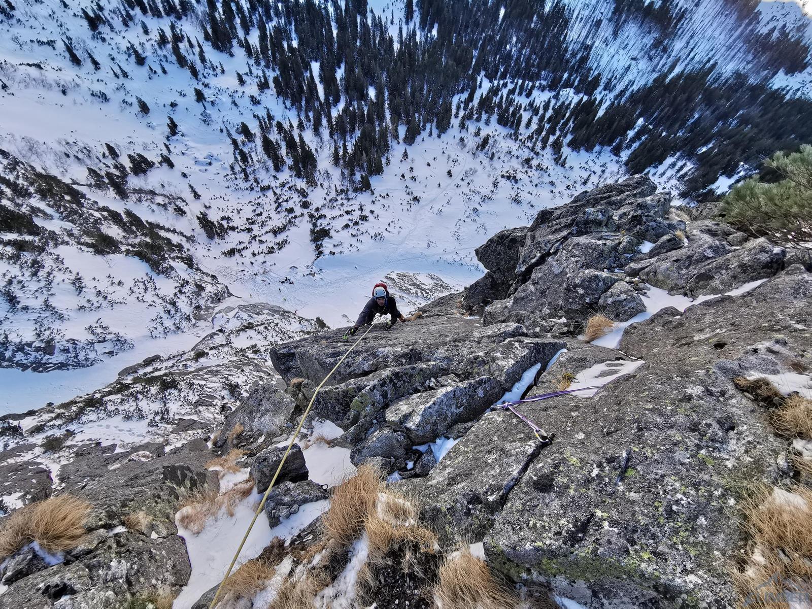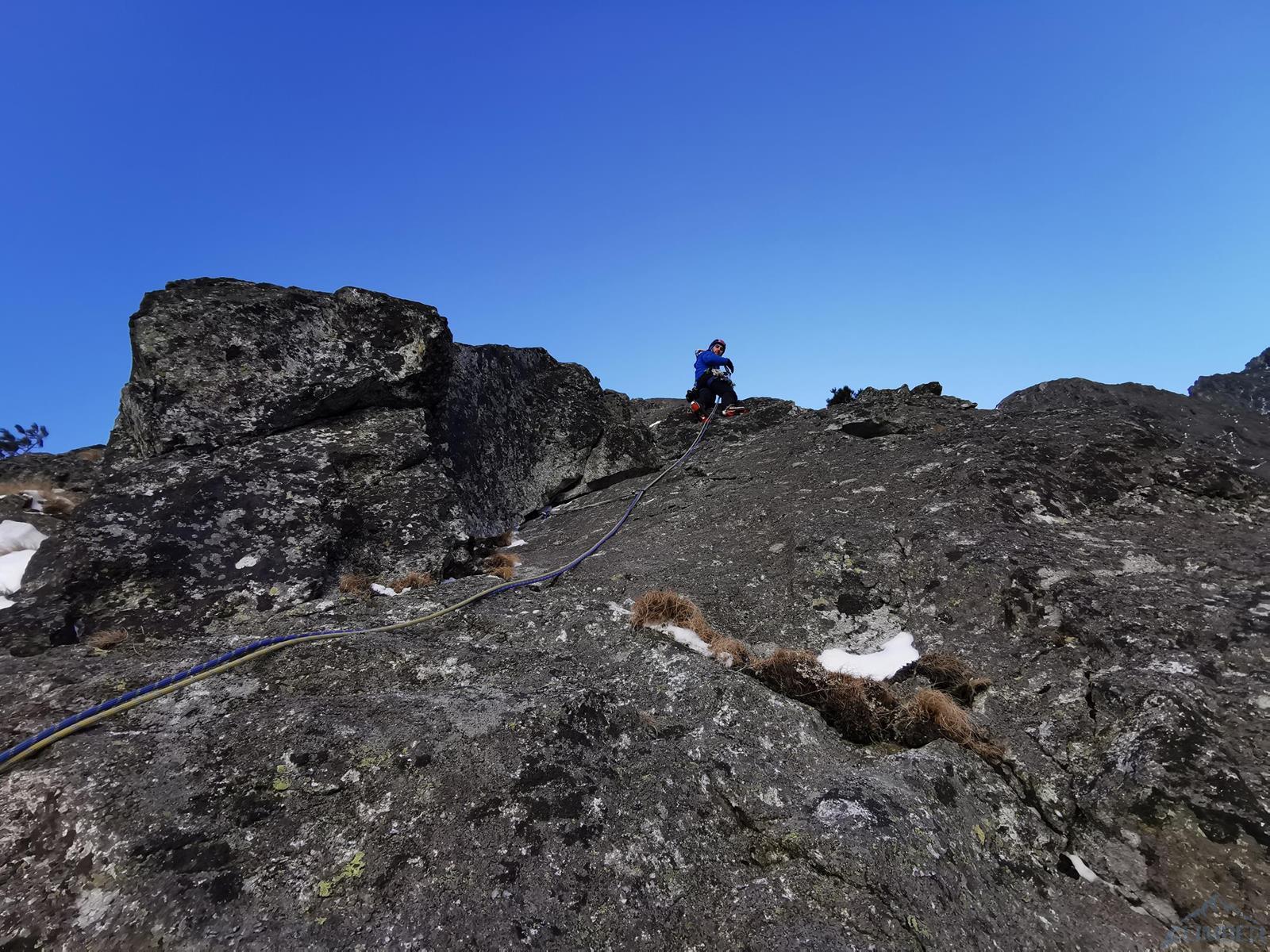 Moja druga próba jest już dużo szybsza i sprawniejsza od pierwszej – założone częściowo przeloty robią swoje, wiem już też do którego chwytu sięgać. Po wyjściu ze ścianki teren się kładzie, pozostaje więc tylko spokojne zmierzać do stanowiska zlokalizowanego na lewym skraju grani (pętle z mailonem). Ściągam kolegów i zadowoleni, że starczyło czasu i chęci by przejść całość drogi klasycznie zaczynamy zjazdy – pierwszy pod przedostatni wyciąg, kolejne już linią Silvestrovské blues i jeden ze stanowiska nad Veverką (progiem skalnym po prawej patrząc z góry). Druga opcja na zjazdy to przejście kilka metrów granią do stanowiska nad Piranhą i po jednym zjeździe stamtąd kontynuowanie w dół z łańcuchów umieszczonych na drodze Chlapcom z Pumori.