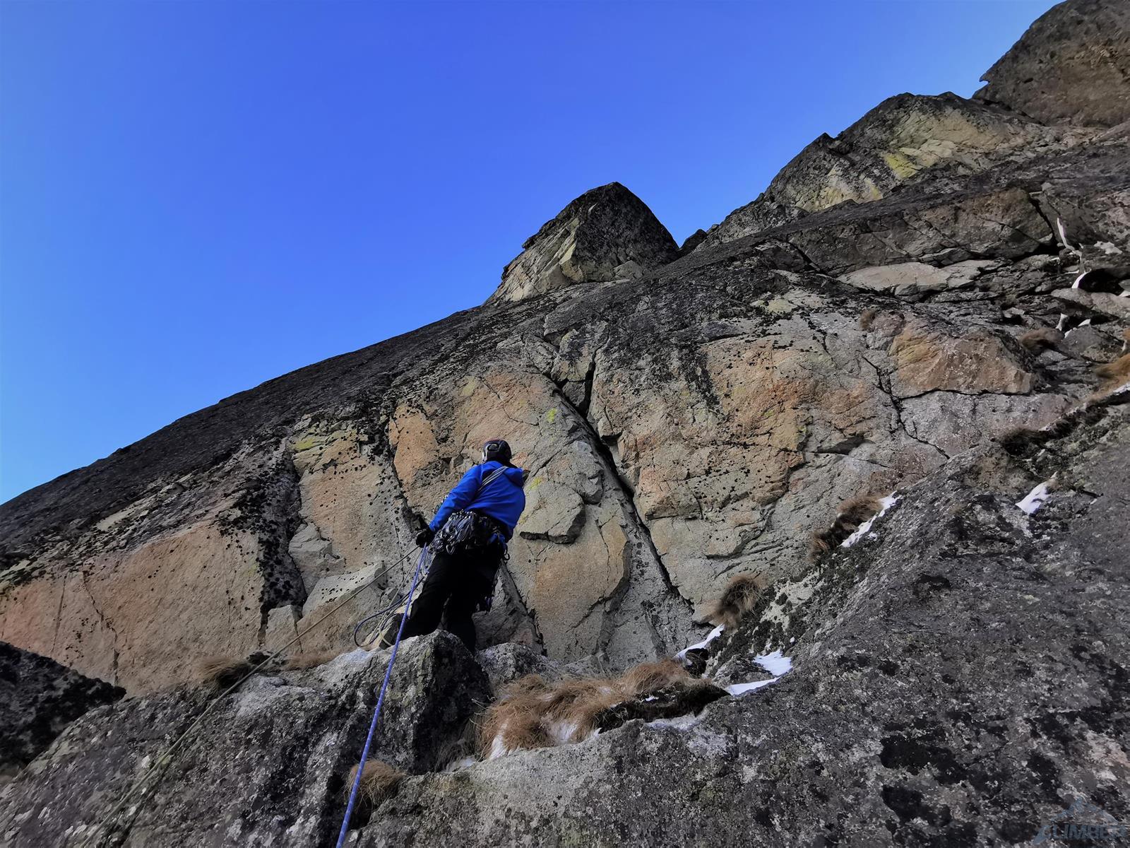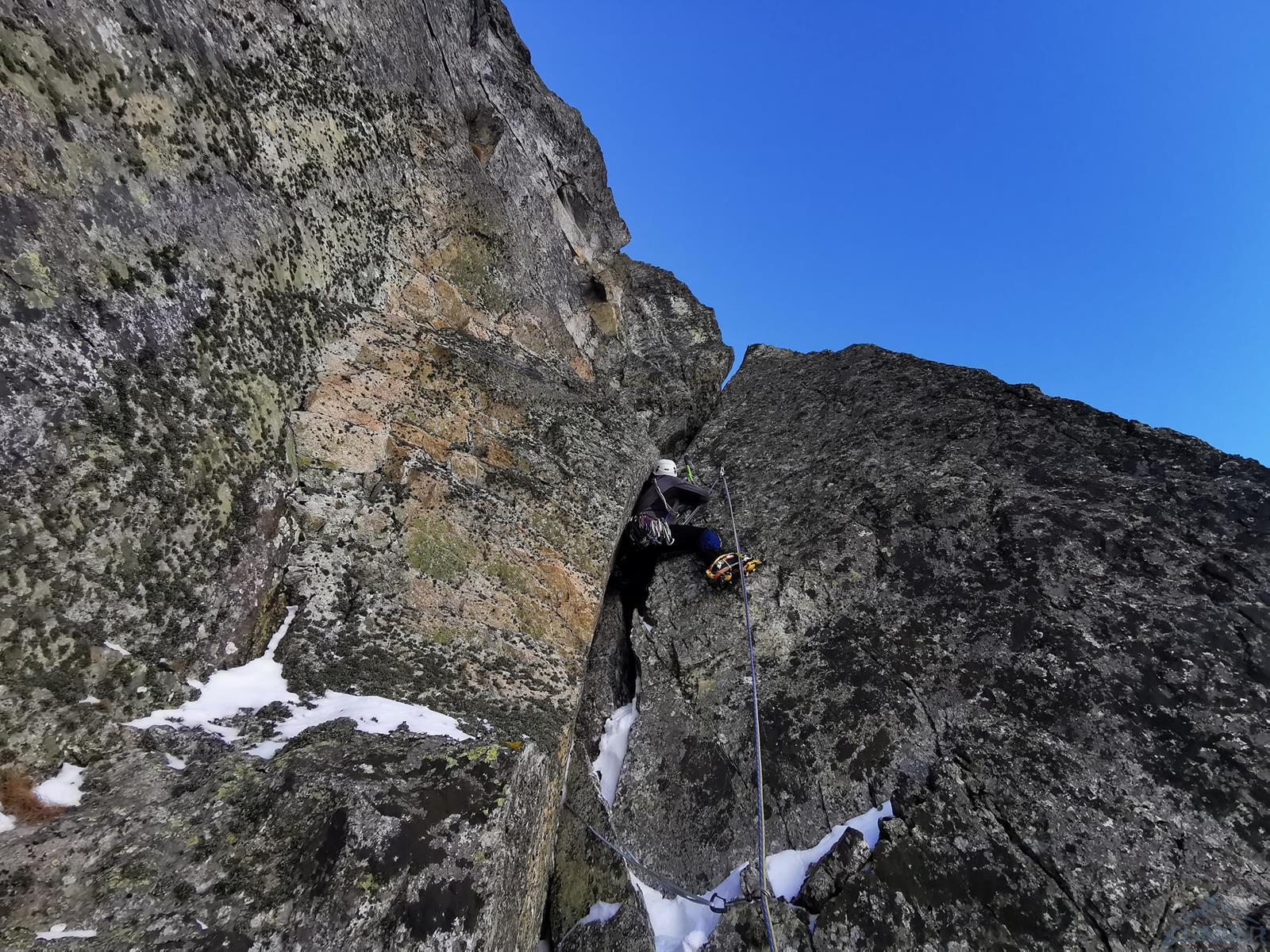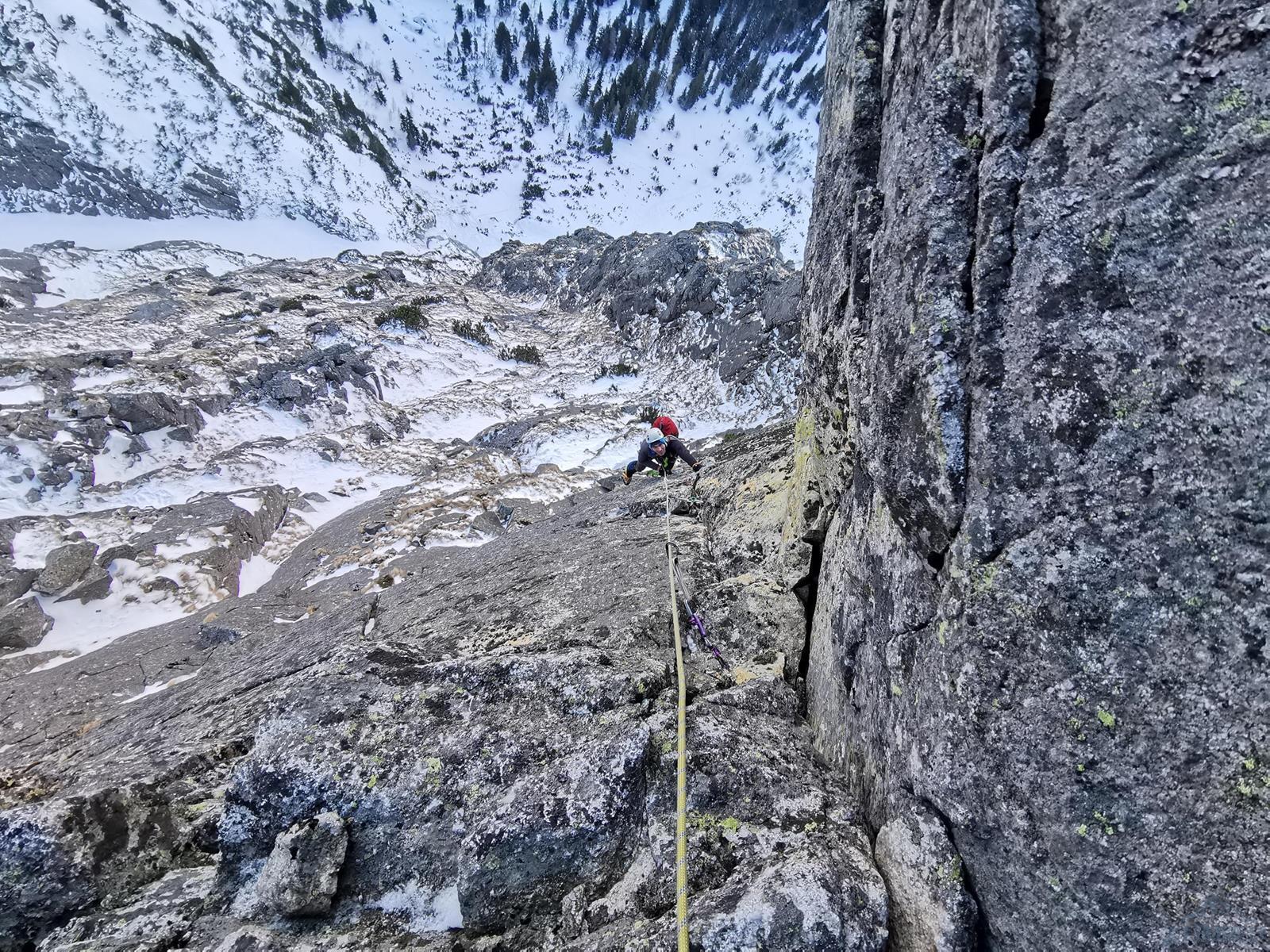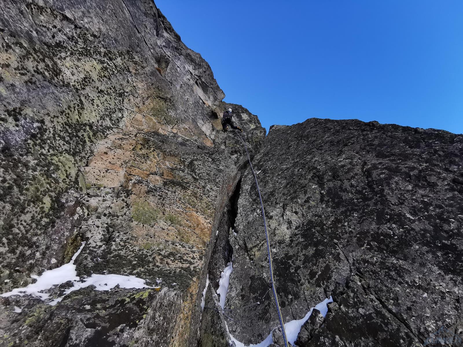 Szósty wyciąg (M6+, 25 m) zaczyna się od siłowego startu (raczej M7, sugerowane przez kilka osób) – dziaby i friendy siadają świetnie, trzeba się jednak mocno zginać. Kilka metrów wyżej robi się łatwiej, kontynuujemy wzdłuż rysy i kierujemy się do zacięcia z kilkoma kruchymi chwytami (czujnie), nad którym znajduje się wygodne stanowisko. Michał rozprawia się z trudnościami on sajtem, dzięki czemu nie tracimy sił i czasu, które będą nam potrzebne na ostatnim odcinku. Po krótkiej przerwie przewiązujemy się i ruszam na prowadzenie.