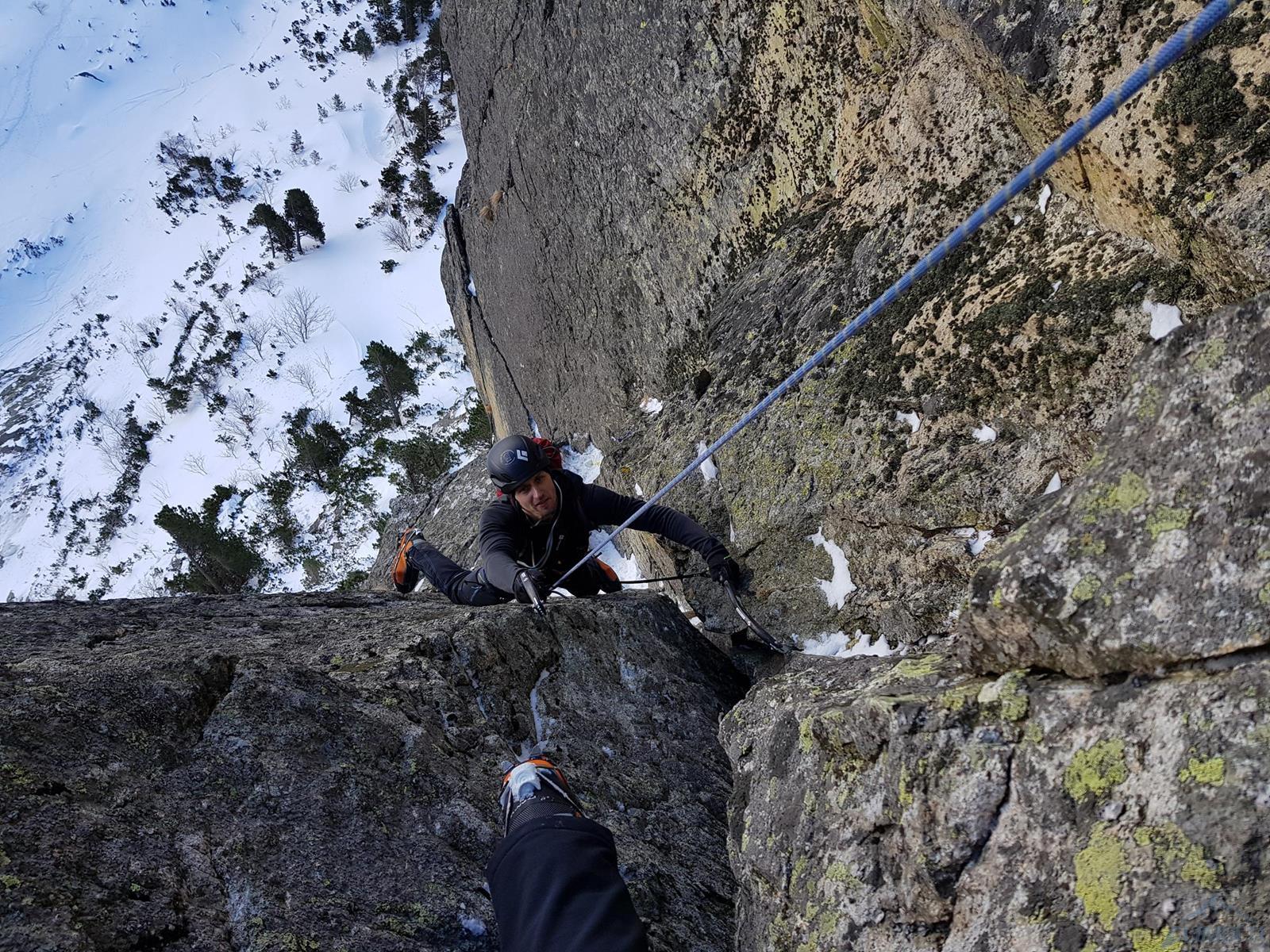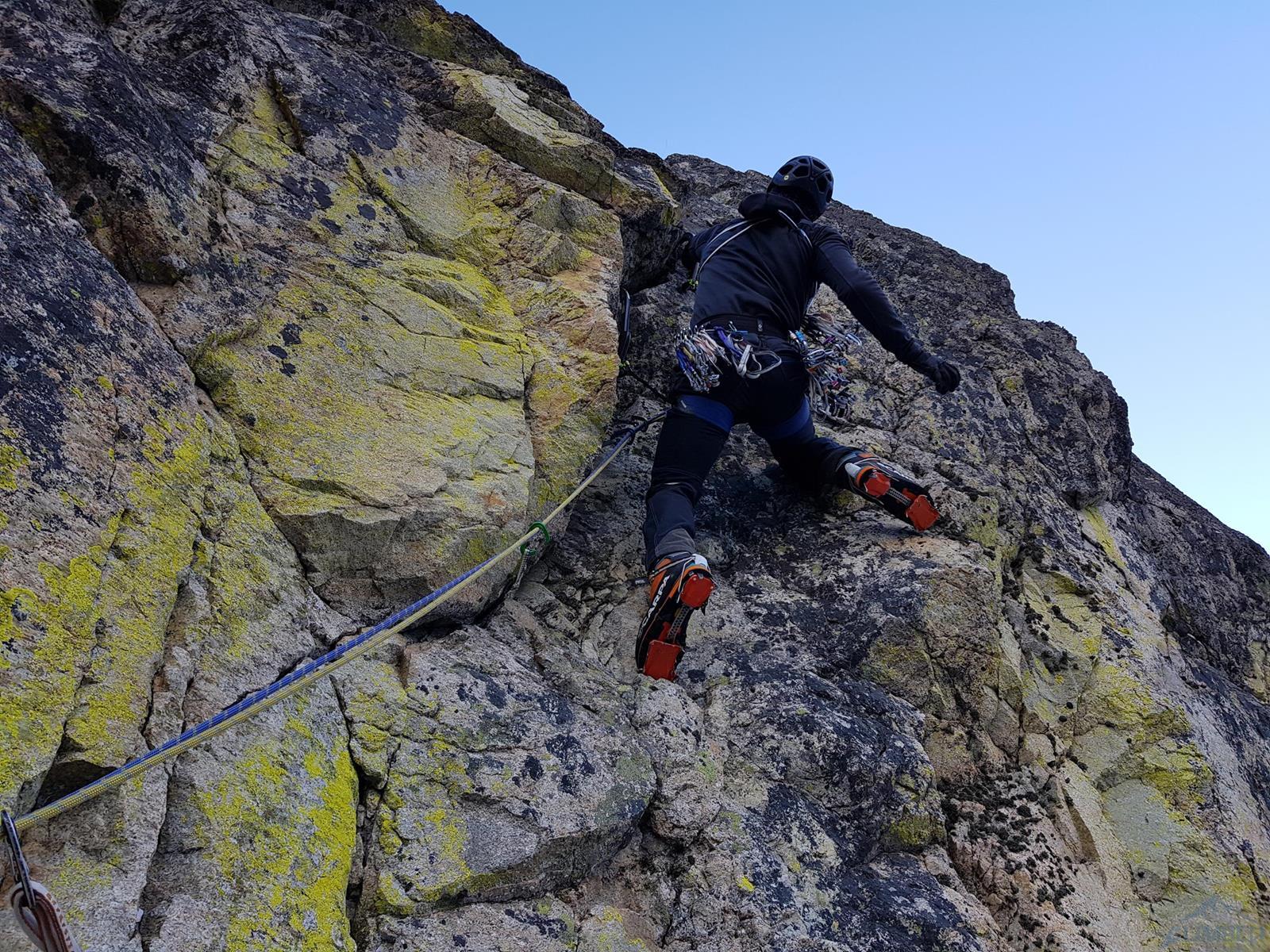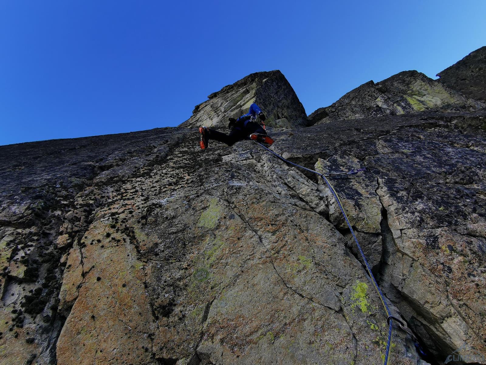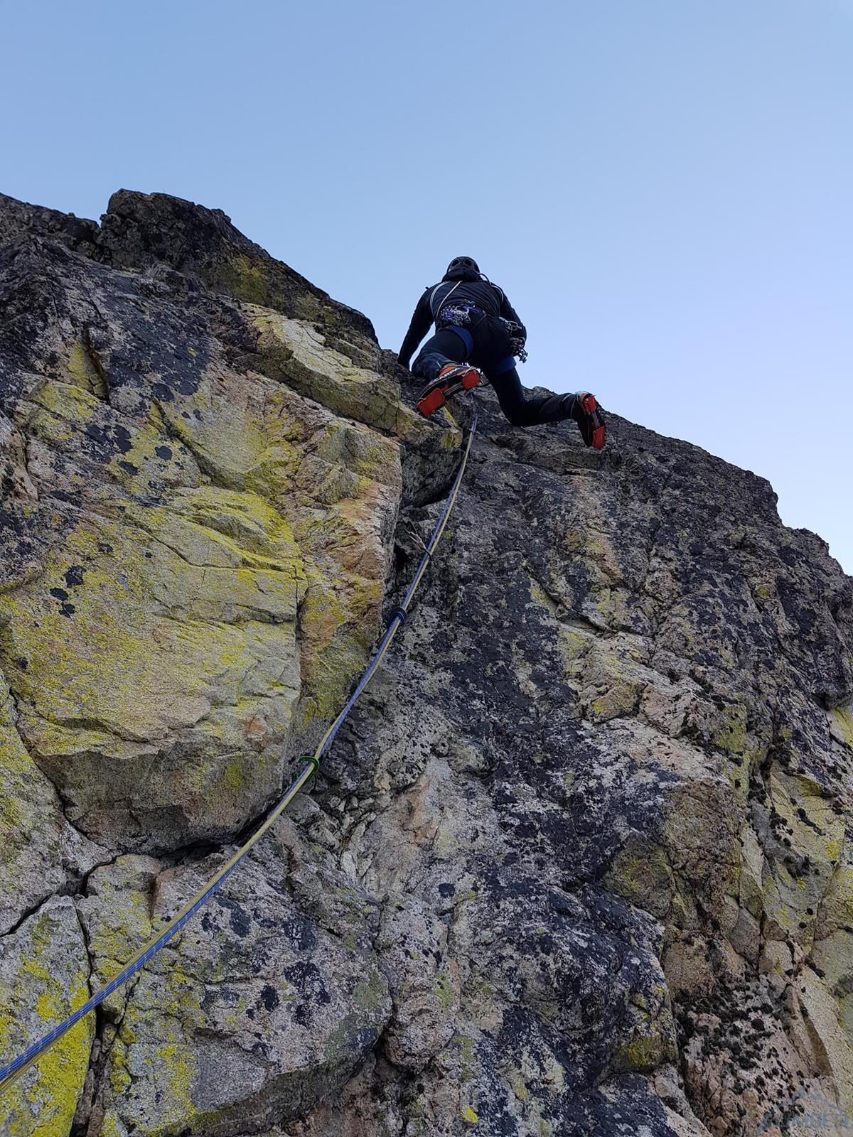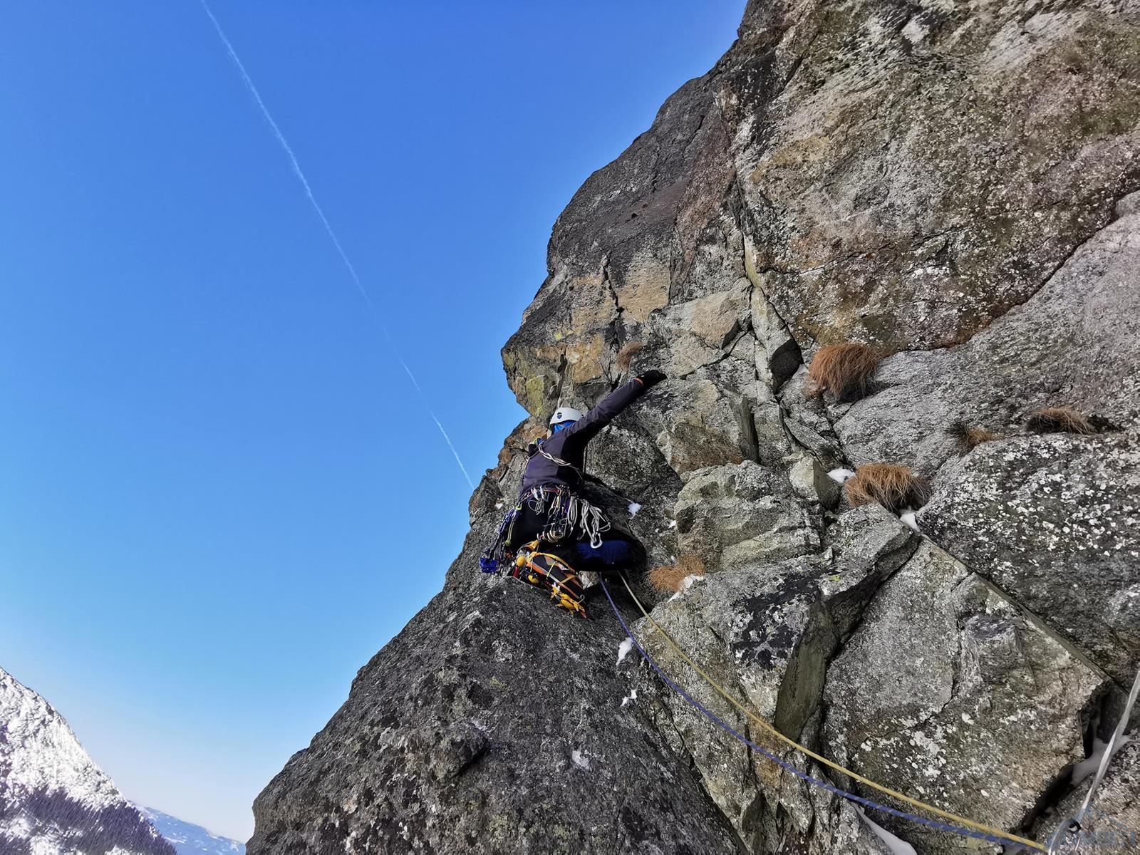 Szósty wyciąg (M6+, 25 m) zaczyna się od siłowego startu (raczej M7, sugerowane przez kilka osób) – dziaby i friendy siadają świetnie, trzeba się jednak mocno zginać. Kilka metrów wyżej robi się łatwiej, kontynuujemy wzdłuż rysy i kierujemy się do zacięcia z kilkoma kruchymi chwytami (czujnie), nad którym znajduje się wygodne stanowisko. Michał rozprawia się z trudnościami on sajtem, dzięki czemu nie tracimy sił i czasu, które będą nam potrzebne na ostatnim odcinku. Po krótkiej przerwie przewiązujemy się i ruszam na prowadzenie.