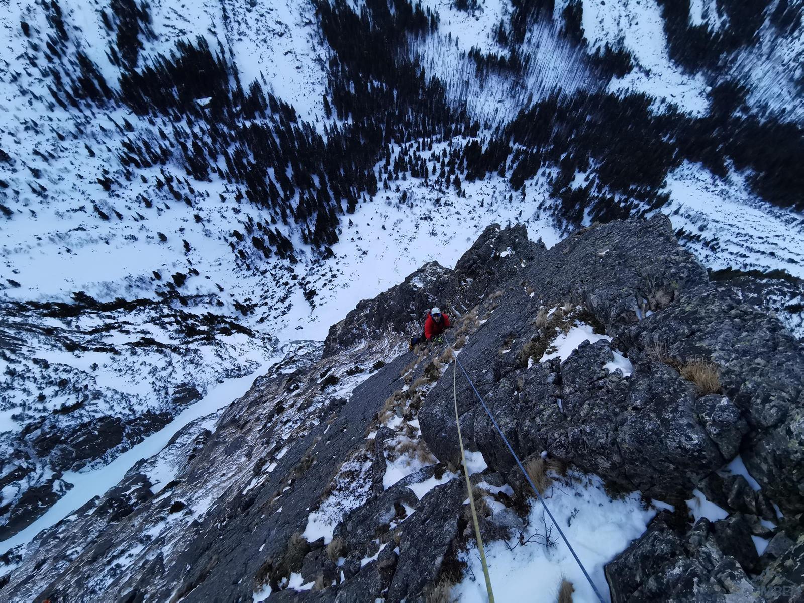 Trudności ostatniego wyciągu (M7, 25 m) znajdują się na początku – do przejścia mamy ok 10-metrową przewieszoną ściankę z zanikającą miejscami rysą, wg nas dość parszywa formacja, choć same ruchy po opatentowaniu może i łatwiejsze niż wskazuje wycena. Na starcie tracę niestety sporo sił na zakładanie asekuracji (nie zabraliśmy haków, nie są konieczne choć akurat tutaj jeden by się przydał) i gdy wychodzę z trudności "odcina" mi ręce i zaliczam solidnego lota na friendzie znajdującym się kilka metrów niżej. Zimą jak wiadomo na takich wyciągach loty się zdarzają, humor psuje mi jedynie fakt, że dziaba została w rysie przez co karabinek od lonży rozerwał się. Ściągamy linę i próbuje Michał – gdy dochodzi jednak do mojej dziaby i już wydaje się, że drogę mamy z głowy, niespodziewanie objeżdżają mu nogi i przed lotem ratuje go zawiśnięcie na lonży… Zdziwiony i wkurzony kolega wraca do nas, na pocieszenie dziękuję mu, że pozwoli mi się rozprawić z wyciągiem, który mnie zrzucił 😊.