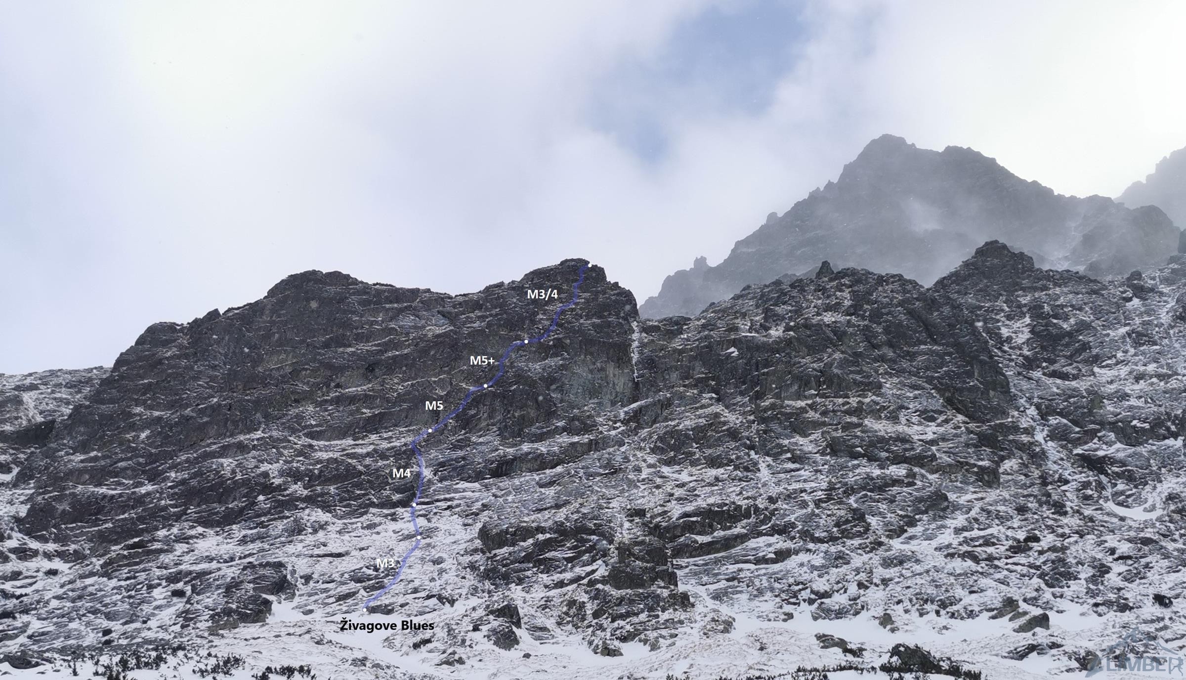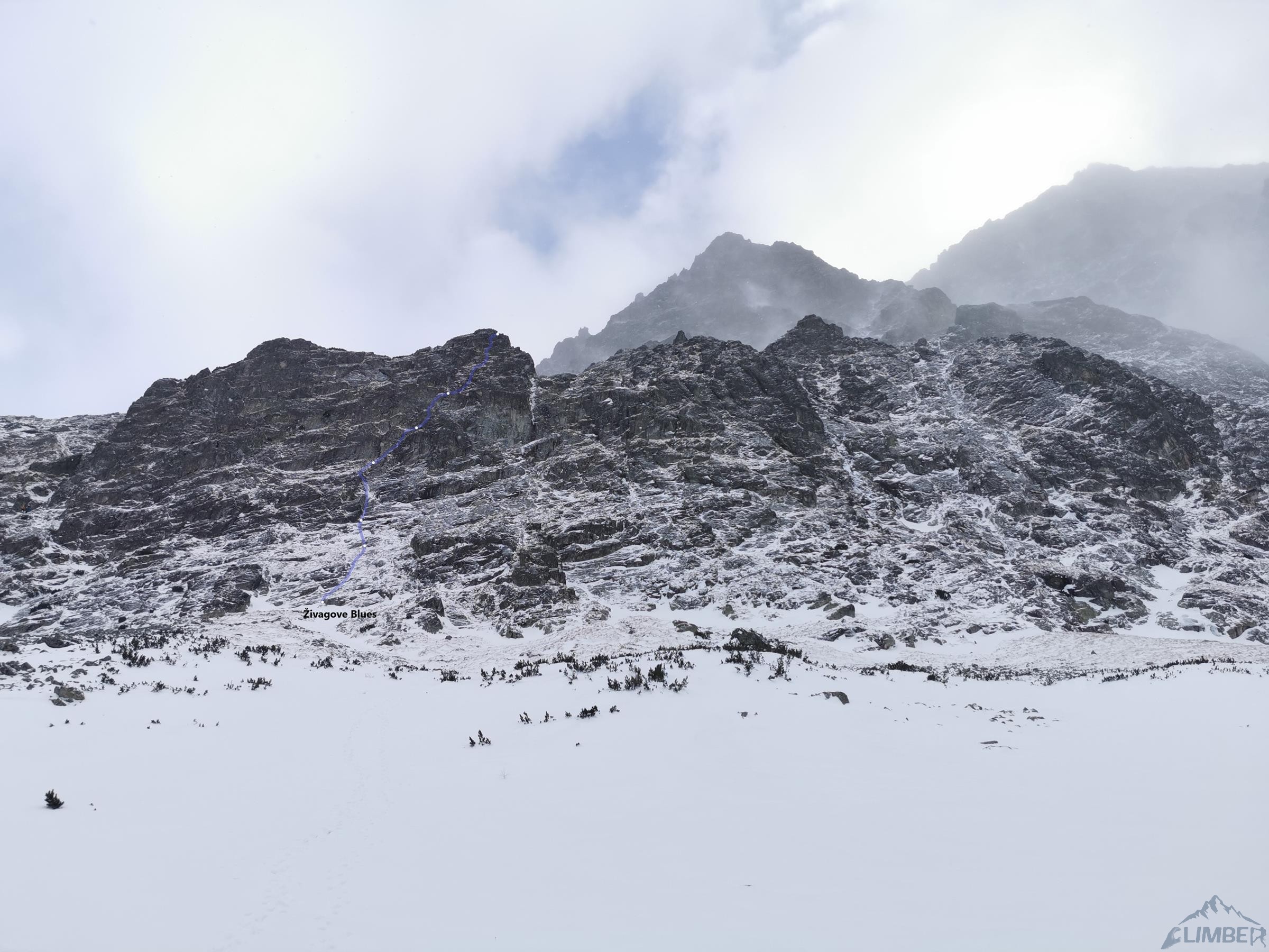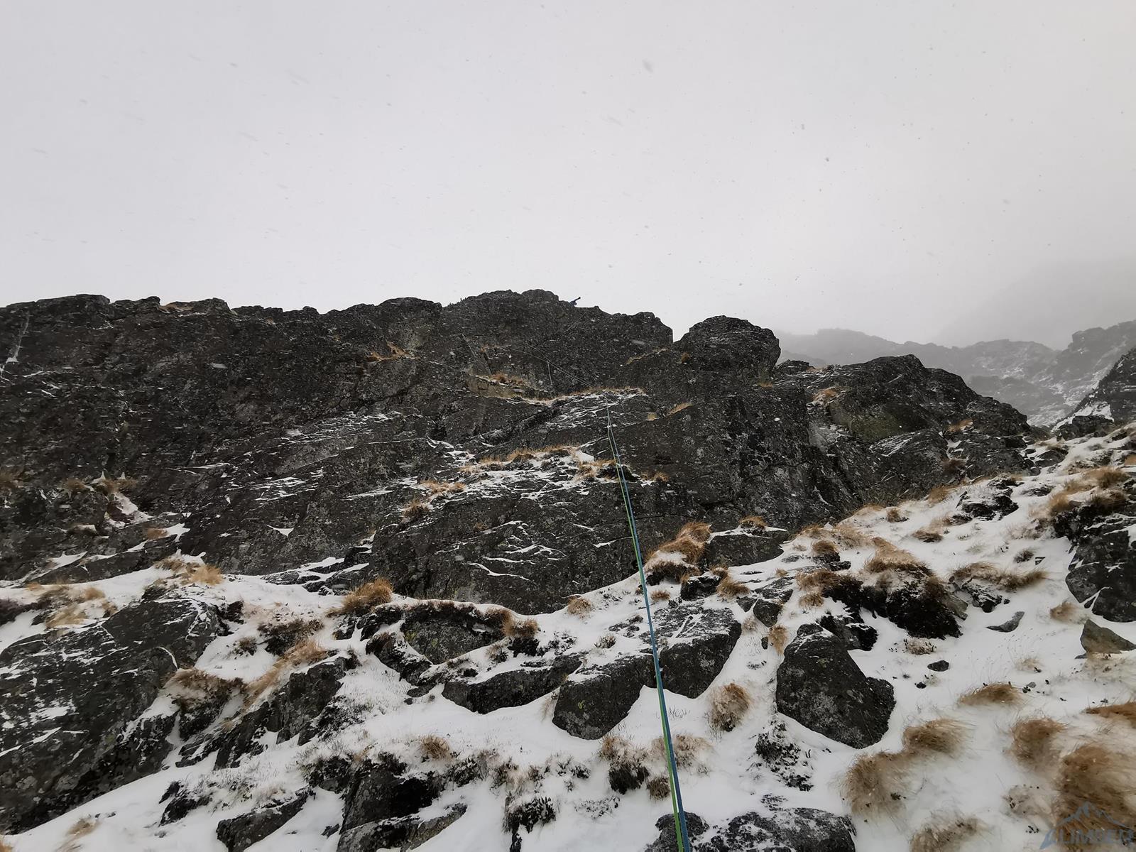 Drugiego dnia obozu pogoda znacznie się pogarsza – mrozi, wieje i sypie. Pocieszam się, że przynajmniej nie trzeba iść na nic długiego – kilkanaście godzin po powrocie z długiej alpiniady (Filara MKW) szybka i krótka droga będzie w sam raz 😉. Na szczęście w Kieżmarskiej propozycji na taką okazję nie brakuje – tym razem decydujemy się na Skrajnego Strażnika i jedną z dwóch dróg częściowo się pokrywających – Rambo lub Živagove blues. Pod ścianą stawiamy się w trójkowym zespołu już po 20 minutach od wyjścia ze schroniska i zgodnie stwierdzamy, że druga linia prezentuje się ciekawiej.