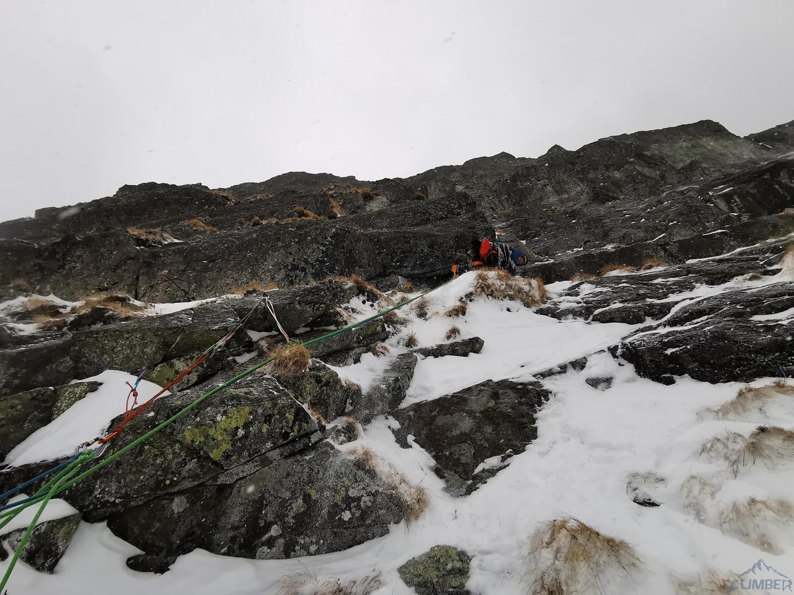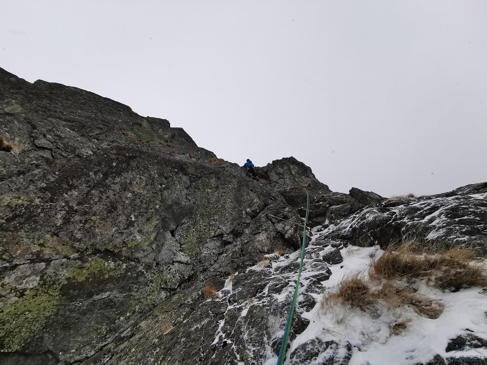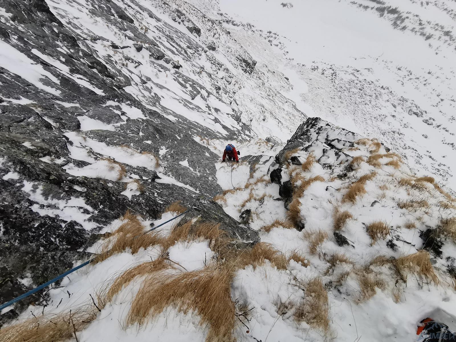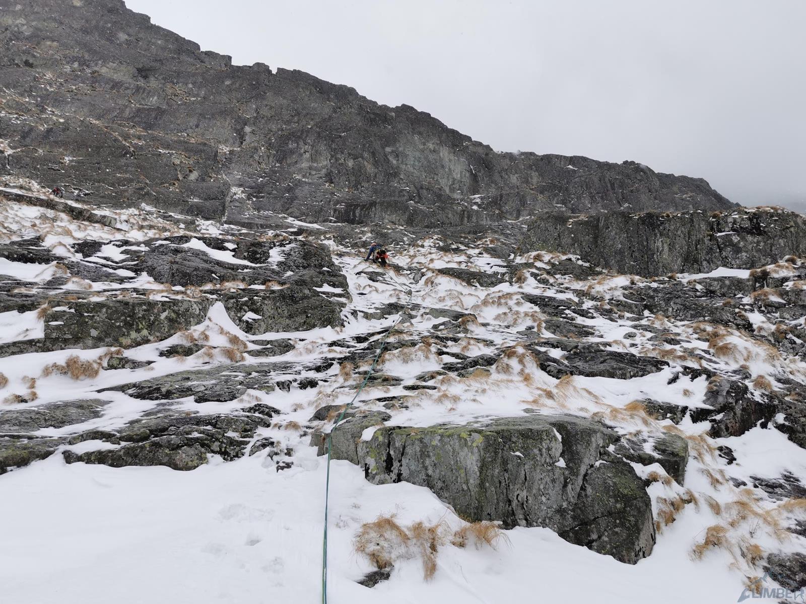 Pierwszą część drogi prowadzi Mateusz – zaczyna wprost do góry trawiasto-skalnym terenem (M3) i po wyjściu w łatwy teren kieruje się skośnie w lewo na półkę pod wyraźnym zacięciem (haki i pętle). Dwa pierwsze wyciągi można łatwo połączyć – trzeba wtedy podejść kawałek na lotnej. Kolejny odcinek jest już bardziej wspinaczkowy (M4) i bardzo fajny – wchodzimy do skalnego zacięcia i po jego przejściu przechodzimy w lewo, po czym przez kominek do góry na półkę z kolejnym stanem (hak). Kolejny wyciąg przypada w prowadzeniu mnie – zaczynamy trawiastą załupą (M4), która wyżej nabiera skalnego charakteru z krótkim trudniejszym odcinkiem na wyjściu (M5). Trawersujemy łatwo do stanowiska pod połogą płytą (hak).