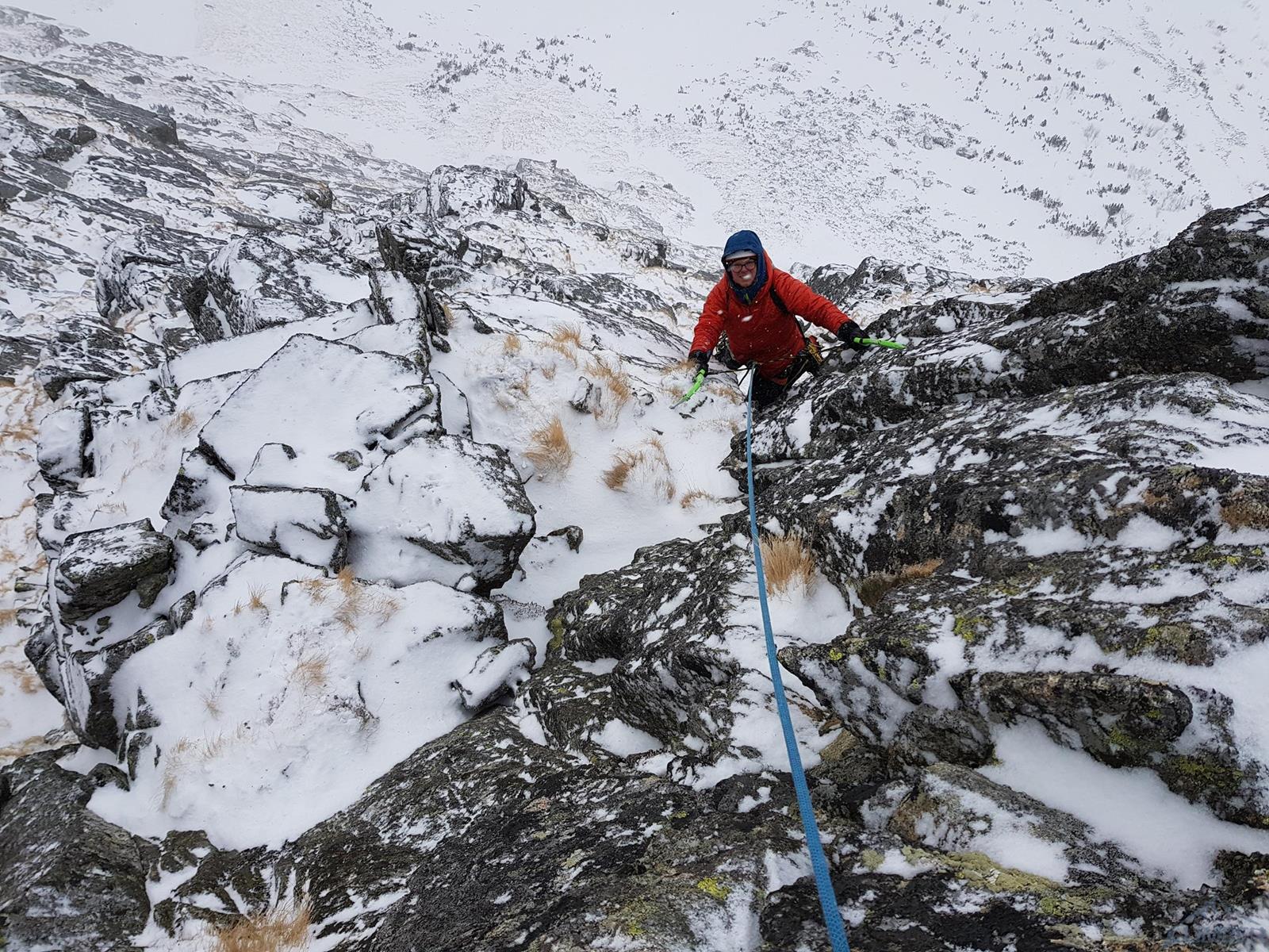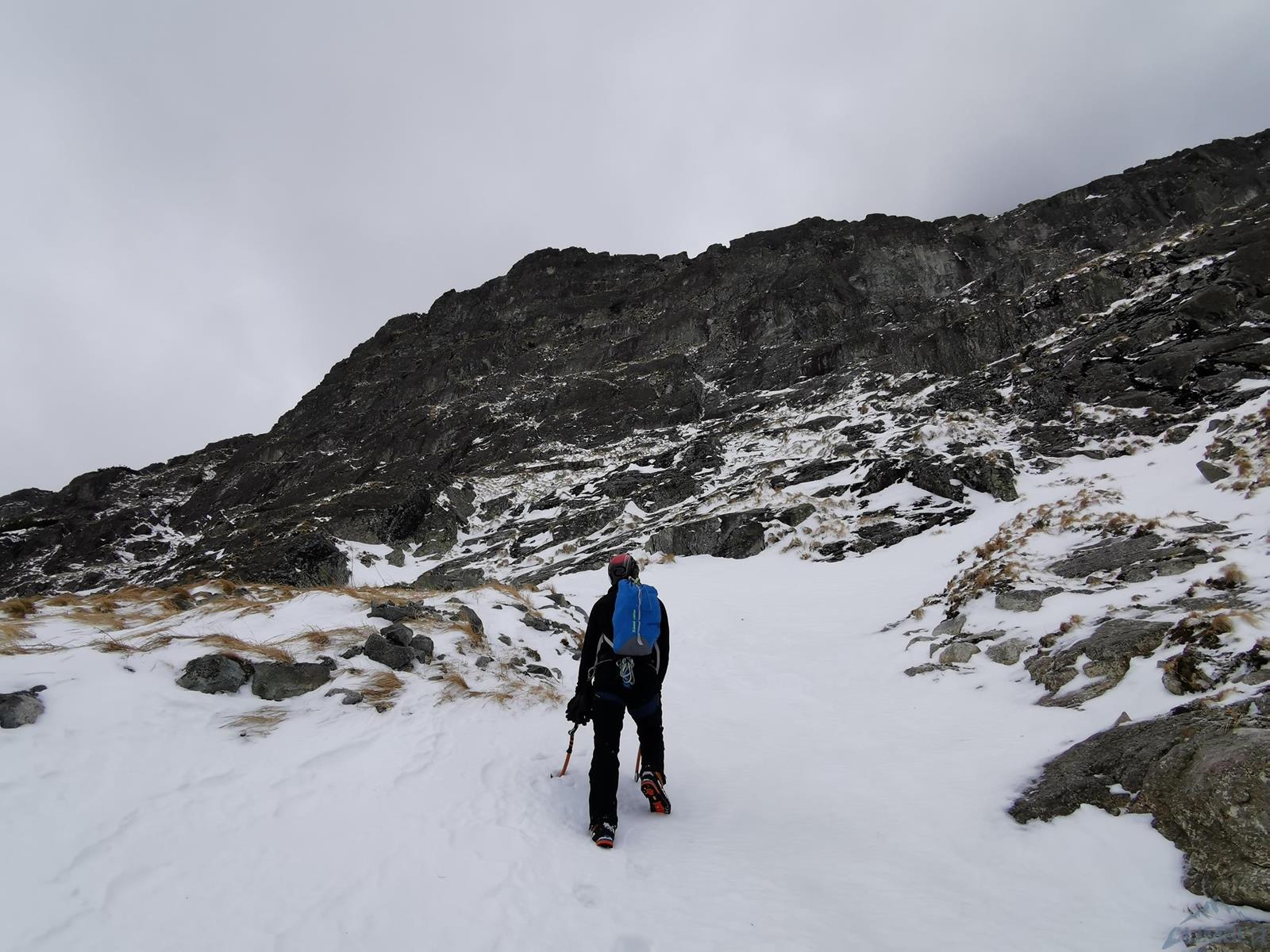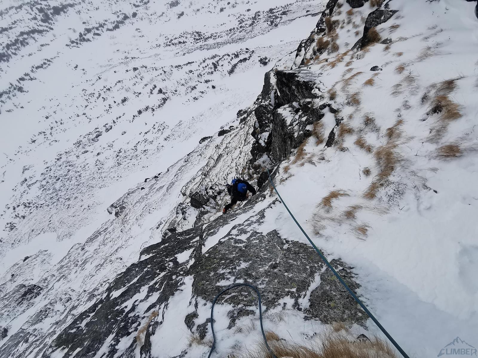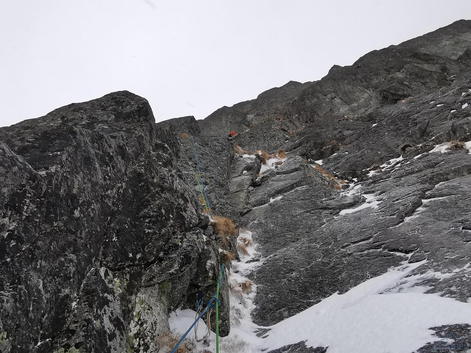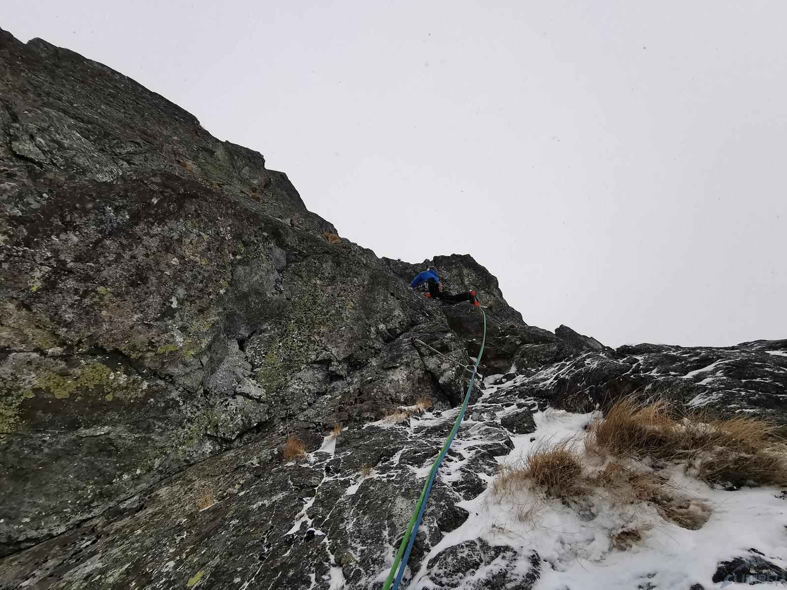 Pierwszą część drogi prowadzi Mateusz – zaczyna wprost do góry trawiasto-skalnym terenem (M3) i po wyjściu w łatwy teren kieruje się skośnie w lewo na półkę pod wyraźnym zacięciem (haki i pętle). Dwa pierwsze wyciągi można łatwo połączyć – trzeba wtedy podejść kawałek na lotnej. Kolejny odcinek jest już bardziej wspinaczkowy (M4) i bardzo fajny – wchodzimy do skalnego zacięcia i po jego przejściu przechodzimy w lewo, po czym przez kominek do góry na półkę z kolejnym stanem (hak). Kolejny wyciąg przypada w prowadzeniu mnie – zaczynamy trawiastą załupą (M4), która wyżej nabiera skalnego charakteru z krótkim trudniejszym odcinkiem na wyjściu (M5). Trawersujemy łatwo do stanowiska pod połogą płytą (hak).