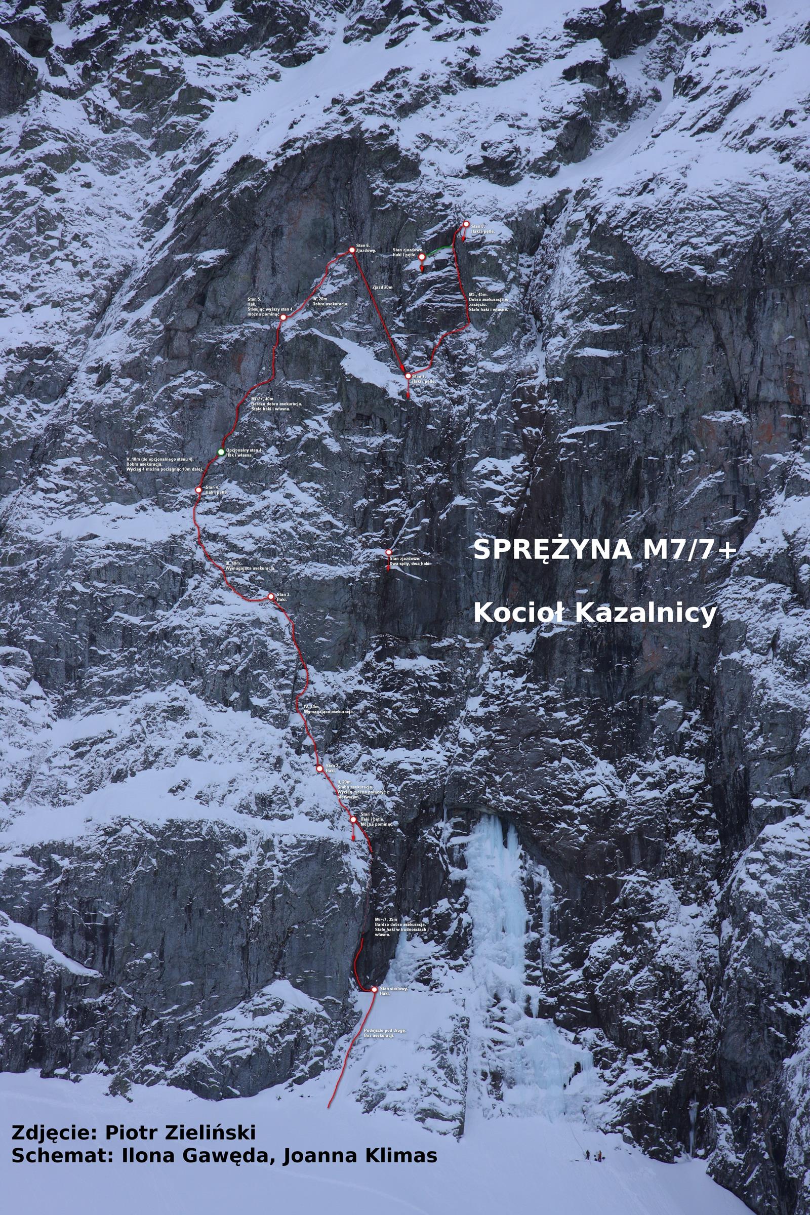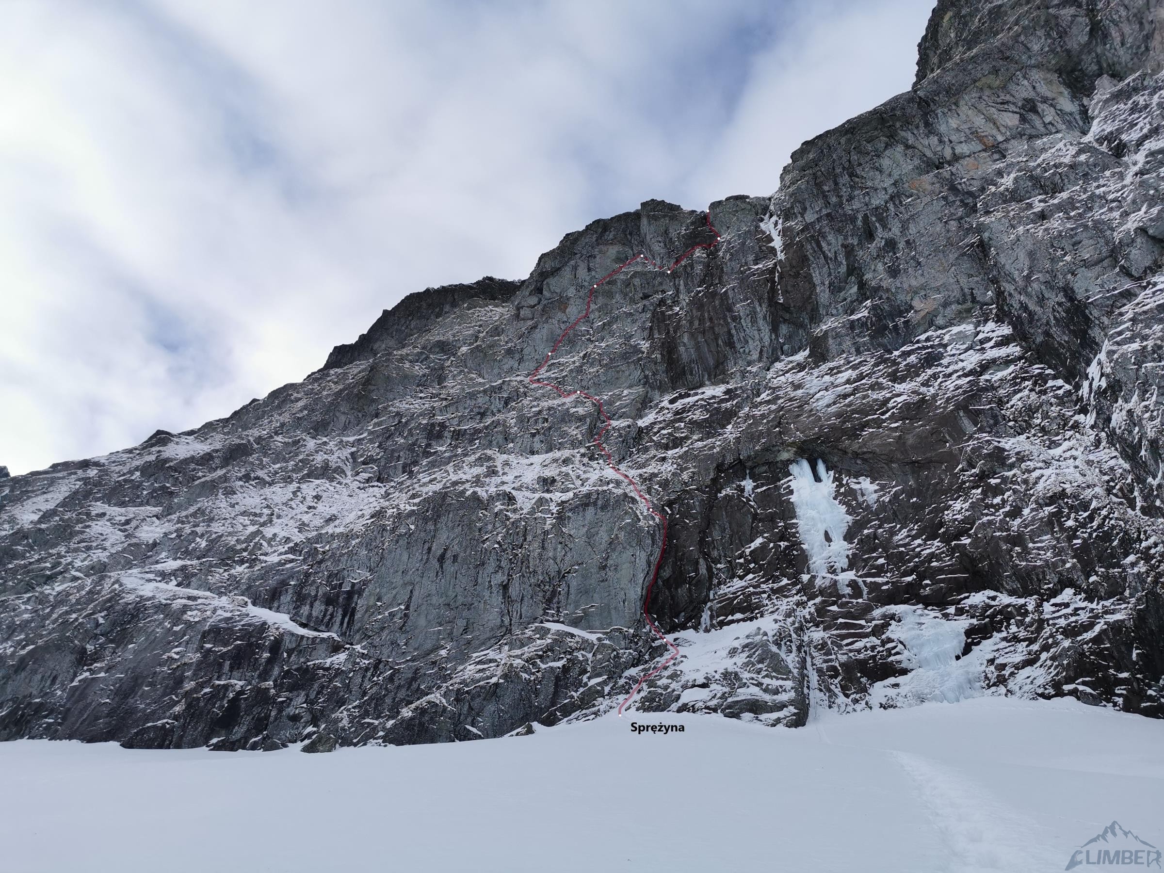 Po niespodziewanym wycofie ze Sprężyny (szczegóły TUTAJ) na drogę wracamy już po tygodniu – tym razem mimo iż warunki są dużo lepsze, na Kotle nie wspina się nikt. Spokojnie możemy więc zmierzyć się z jednym z największych zimowych klasyków wspinaczkowych Morskiego Oka. Z powodu sporego mrozu w drogę wchodzimy dość późno – pierwszy wyciąg jest jednym z dwóch najtrudniejszych i bardzo zależy nam by zrobić go w pierwszej próbie. Po dotarciu pod ścianę podchodzimy około 30 metrów do stanowiska startowego pod kominem i rozpoczynamy wspinanie – dolną połowę drogi prowadzić będzie Michał, mi przypadnie górna część.