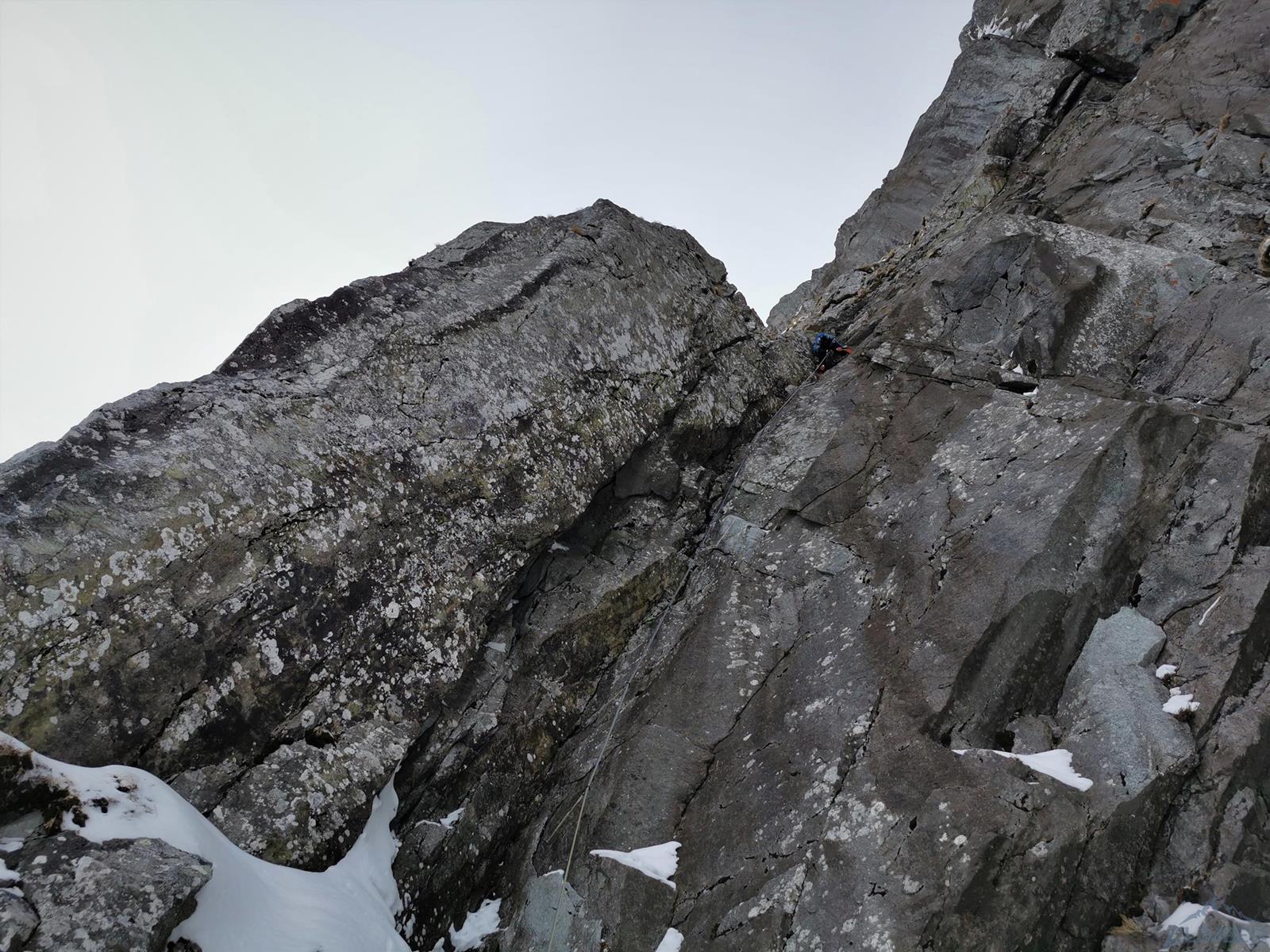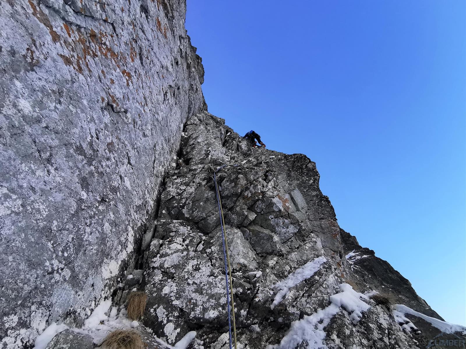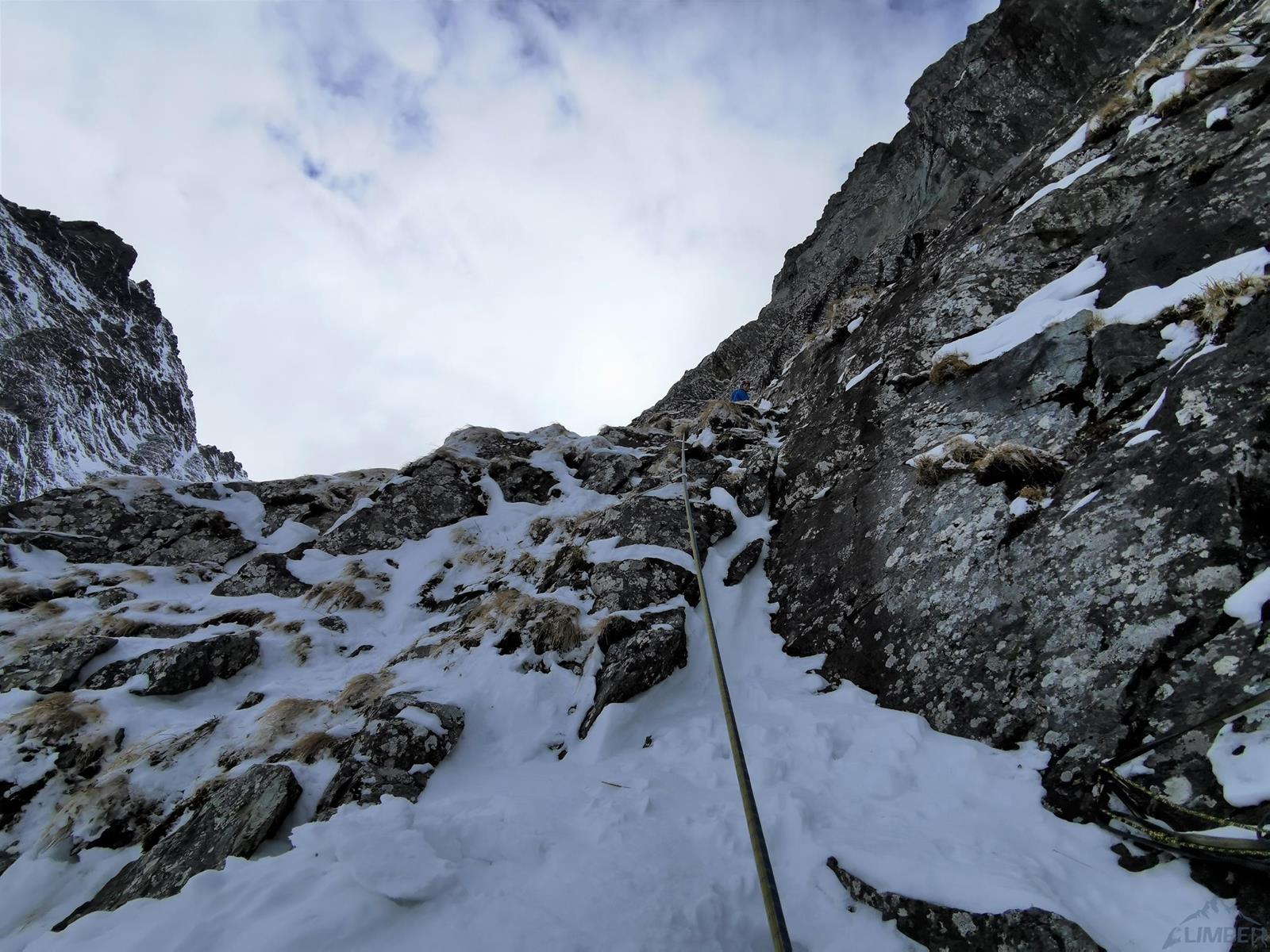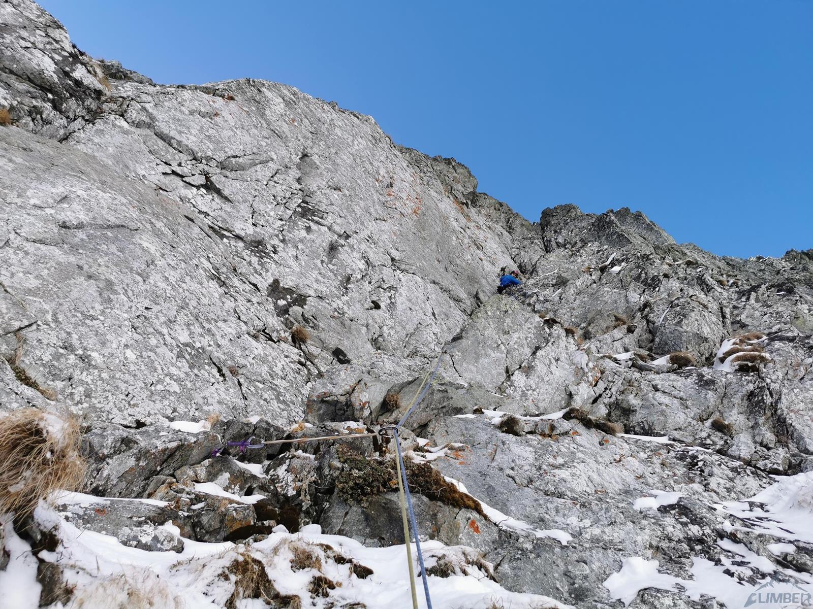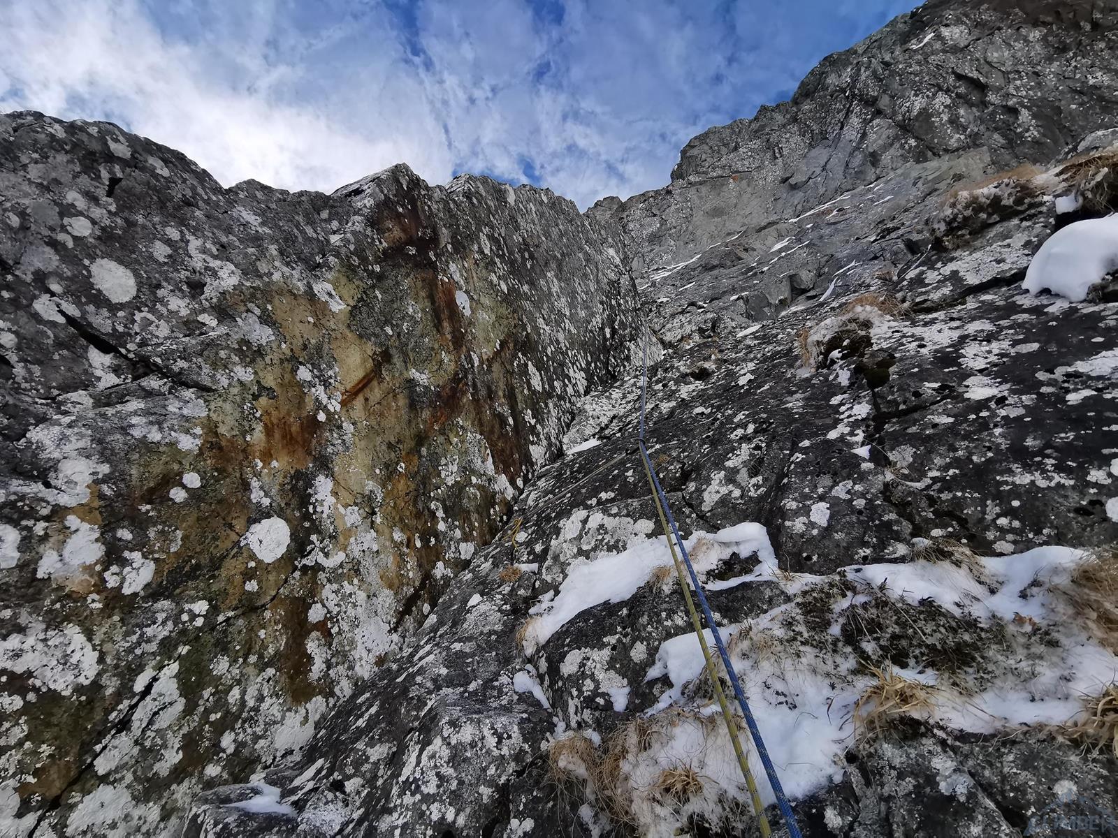 Pierwszy wyciąg (M6+) jest siłowy i ciągowy, a ze względu na brak rozgrzania może wydawać się trudniejszy niż w rzeczywistości – kolega podobnie jednak jak tydzień wcześniej radzi sobie z nim w pierwszej próbie. Wspinamy się komino-zacięciem, które w kilku miejscach posiada przewieszone fragmenty – dzięki komfortowej asekuracji (stare haki + dobra własna) możemy się jednak delektować bardzo fajnymi ruchami. Na koniec czeka nas wyjście z komina na półkę (uwaga na przesztywnienie liny), gdzie znajdziemy stanowisko – pomijamy je jednak i idziemy łatwymi trawami 20 metrów wyżej, czyli nasz pierwszy wyciąg to teoretycznie dwa na pełną długość liny. Drugi odcinek (M4+, 40 m) zaczyna się od czujnego podejścia pod zacięcie, w którym w nagrodę czeka bardzo przyjemne wspinanie – najpierw trawkami na prawo, potem już bezpośrednio zacięciem aż do wyjścia w łatwy teren i stanowiska pod skałami.