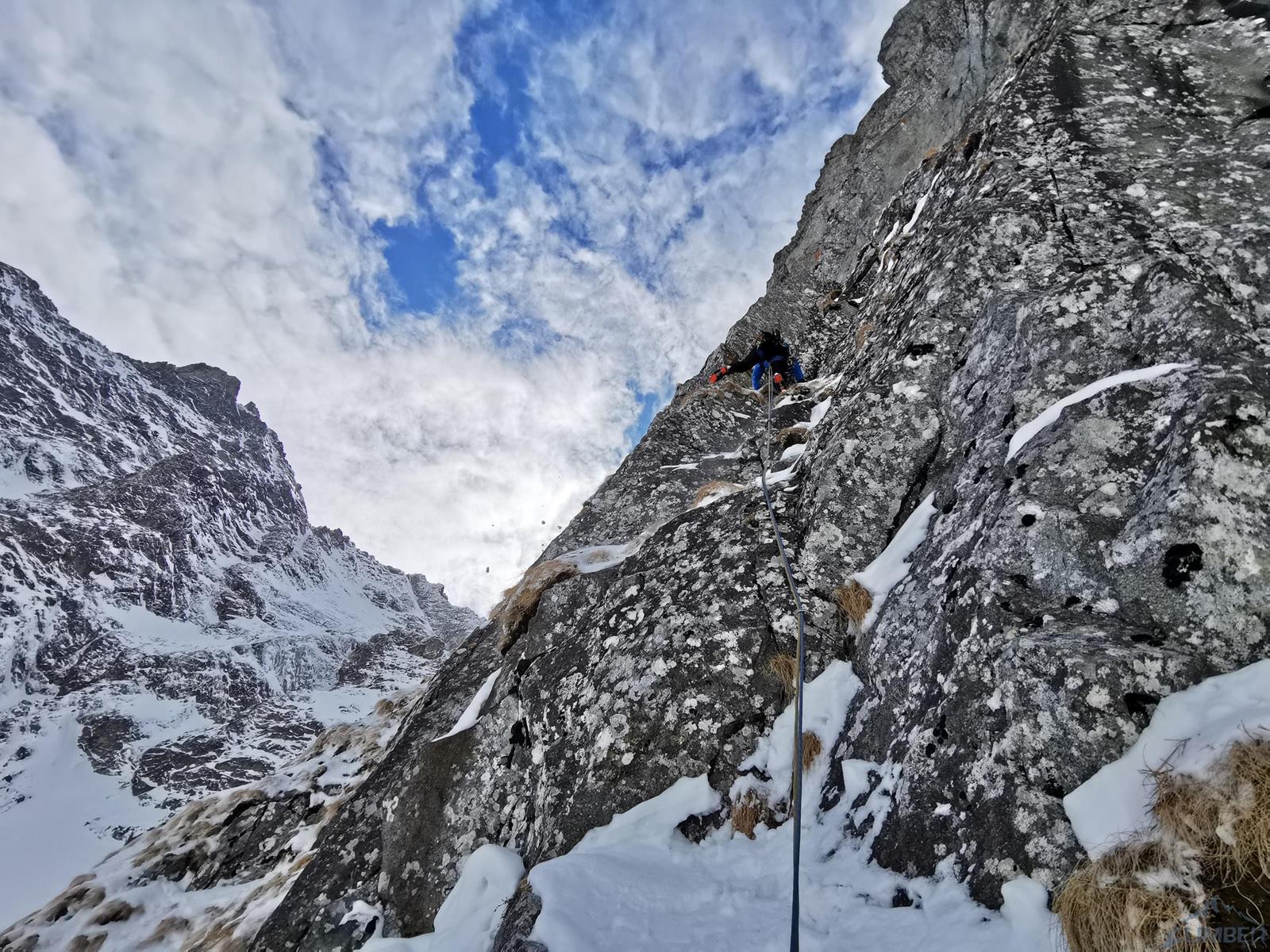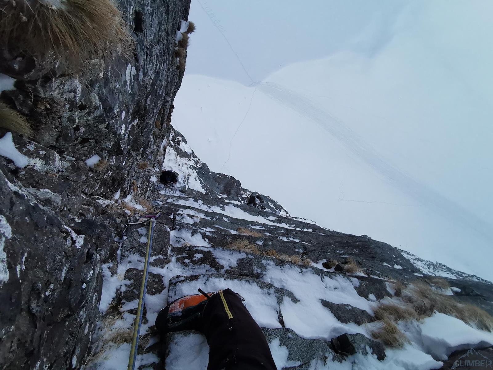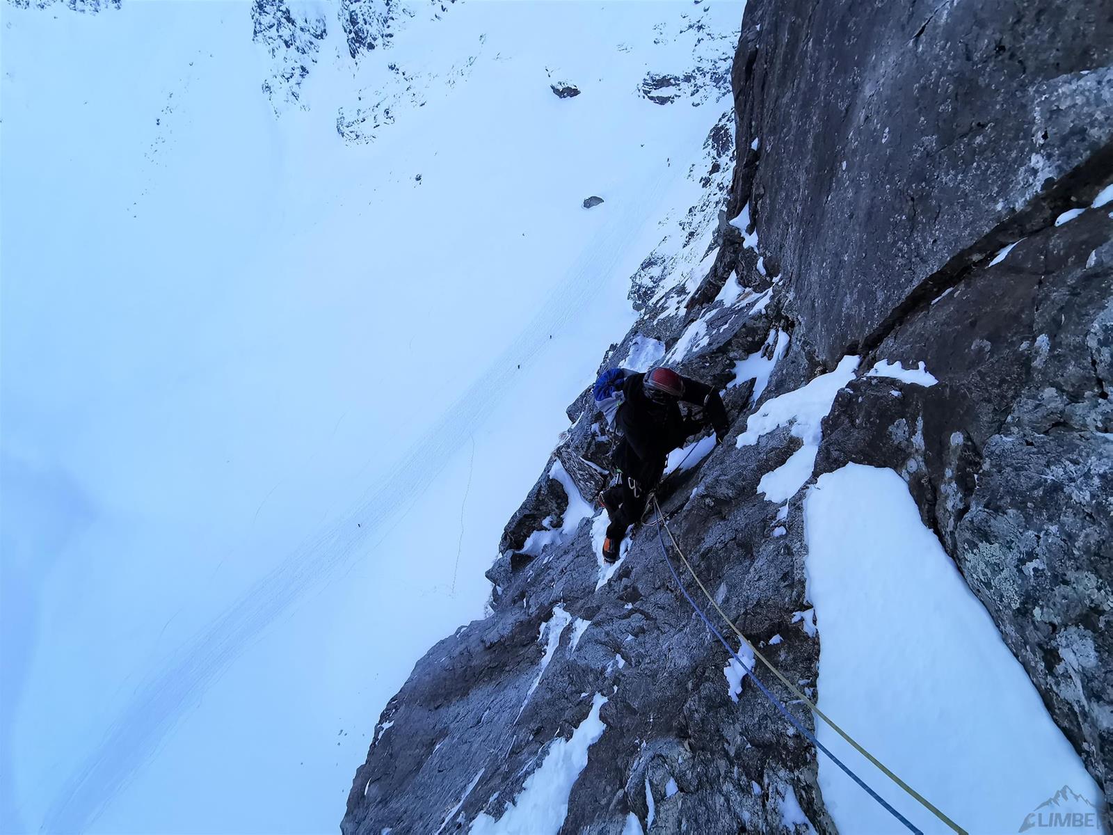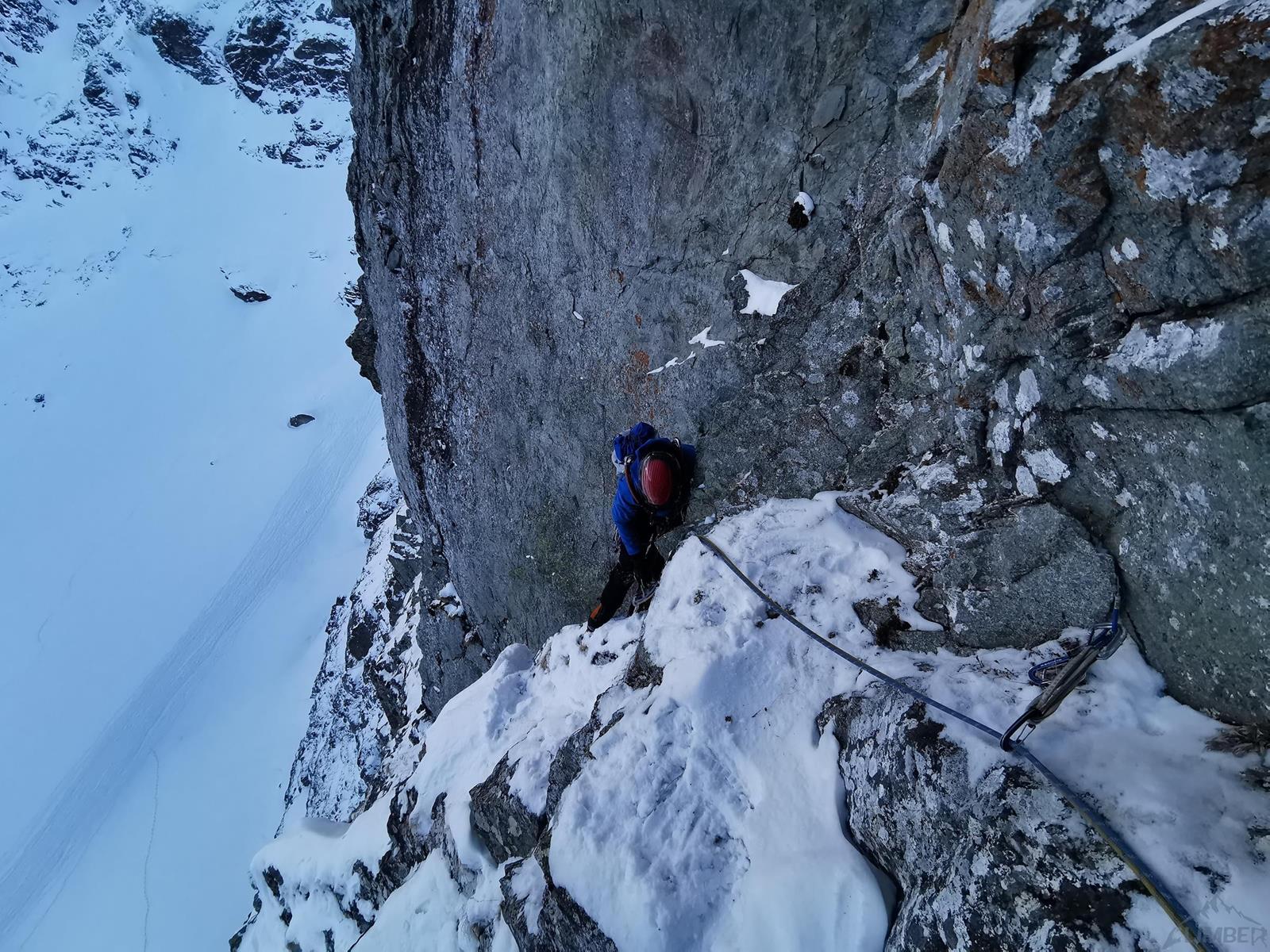 Ostatni odcinek (M5/5+, 30 m) okazuje się zresztą zaskakująco wymagający – zapewne również ze względu na zmęczenie oraz konieczność odśnieżania stopni i chwytów. Na prowadzeniu spędzam sporo czasu, dodatkowo bardzo stresując się by nie popełnić błędu – ewentualna powtórka oznaczałaby wspinanie już po zmroku, na co kompletnie nie mamy ochoty 😉. Po wyjściu na dużą półkę można skręcić do stanowiska zjazdowego po lewej stronie, upieram się jednak by pokonać jeszcze wyjściowy kominek po prawej – zgodnie z oryginalną linią.