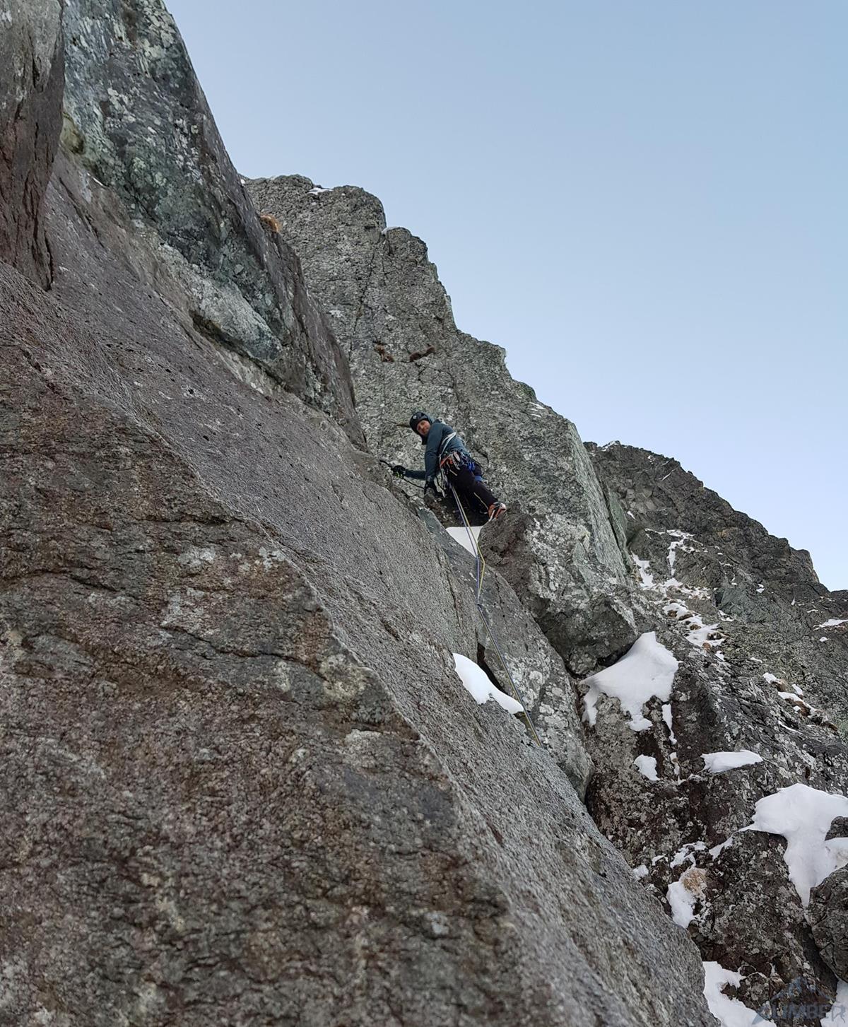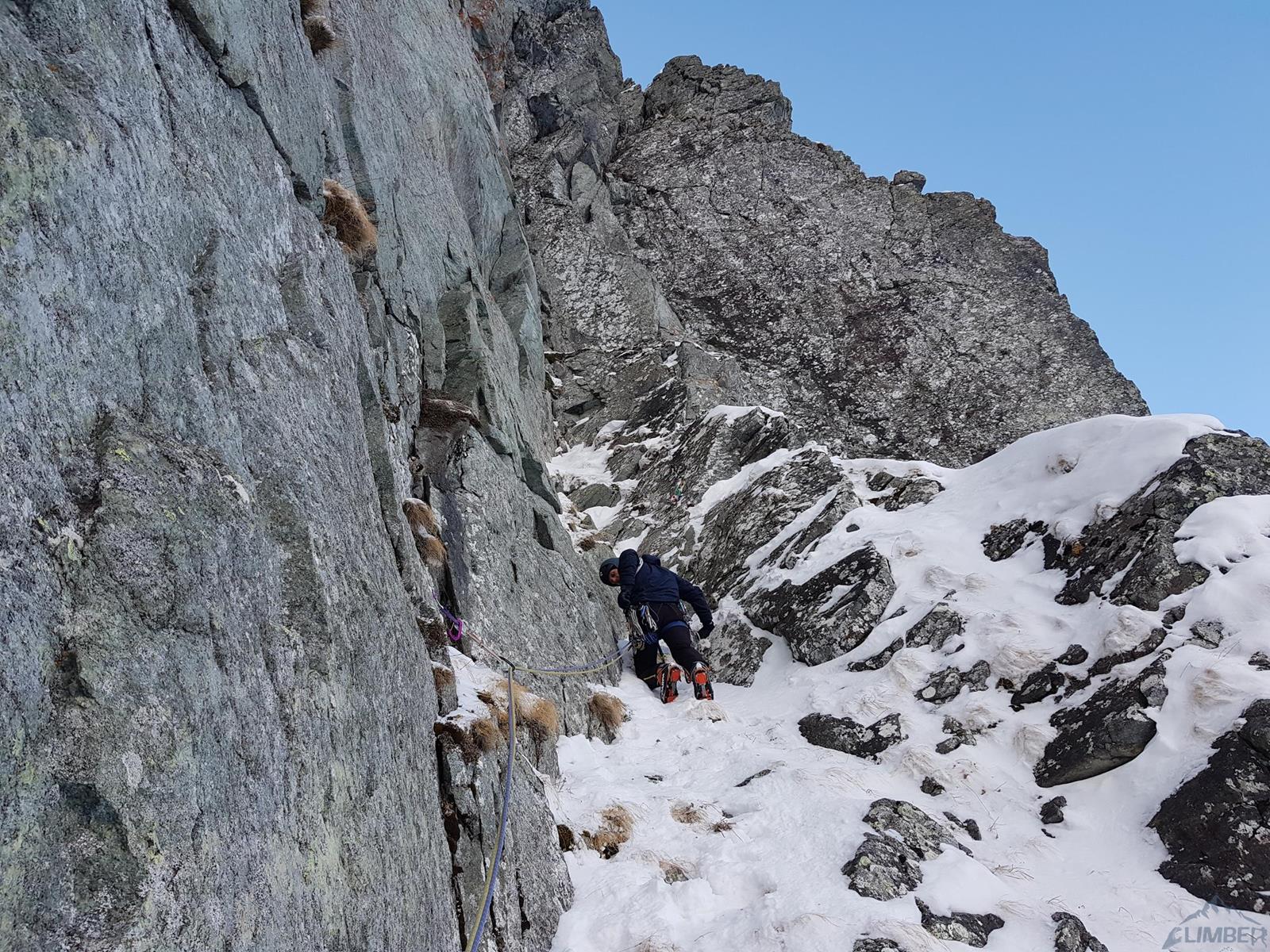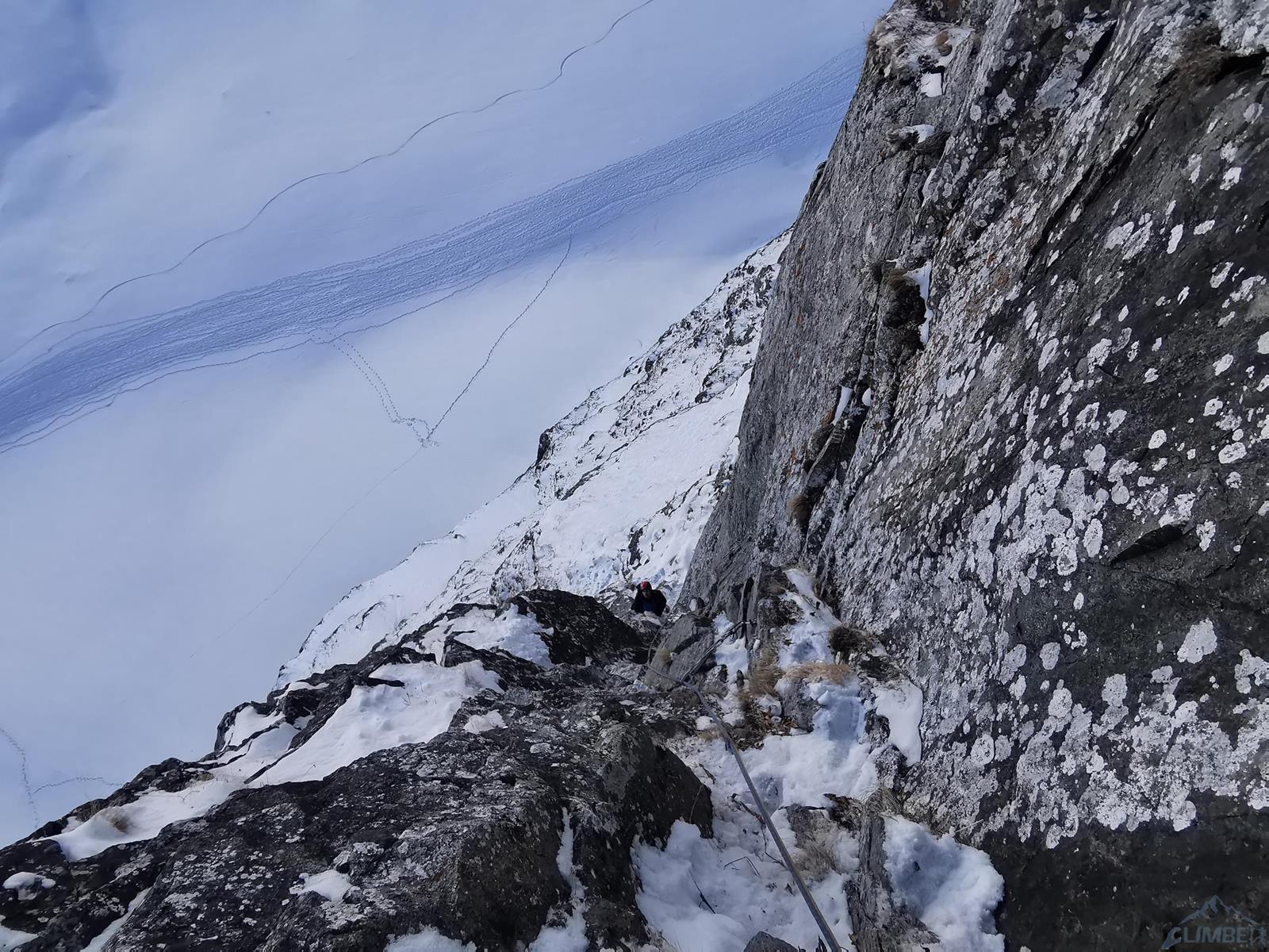 Ostatni odcinek (M5/5+, 30 m) okazuje się zresztą zaskakująco wymagający – zapewne również ze względu na zmęczenie oraz konieczność odśnieżania stopni i chwytów. Na prowadzeniu spędzam sporo czasu, dodatkowo bardzo stresując się by nie popełnić błędu – ewentualna powtórka oznaczałaby wspinanie już po zmroku, na co kompletnie nie mamy ochoty 😉. Po wyjściu na dużą półkę można skręcić do stanowiska zjazdowego po lewej stronie, upieram się jednak by pokonać jeszcze wyjściowy kominek po prawej – zgodnie z oryginalną linią.