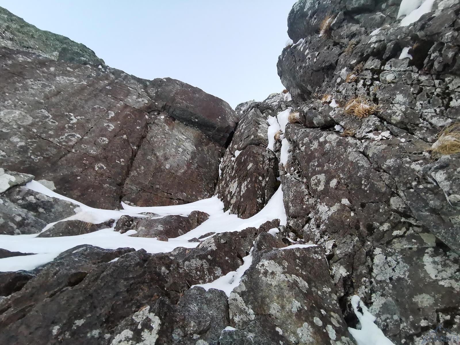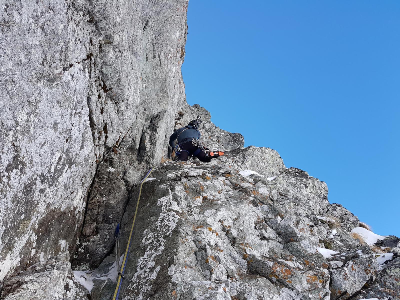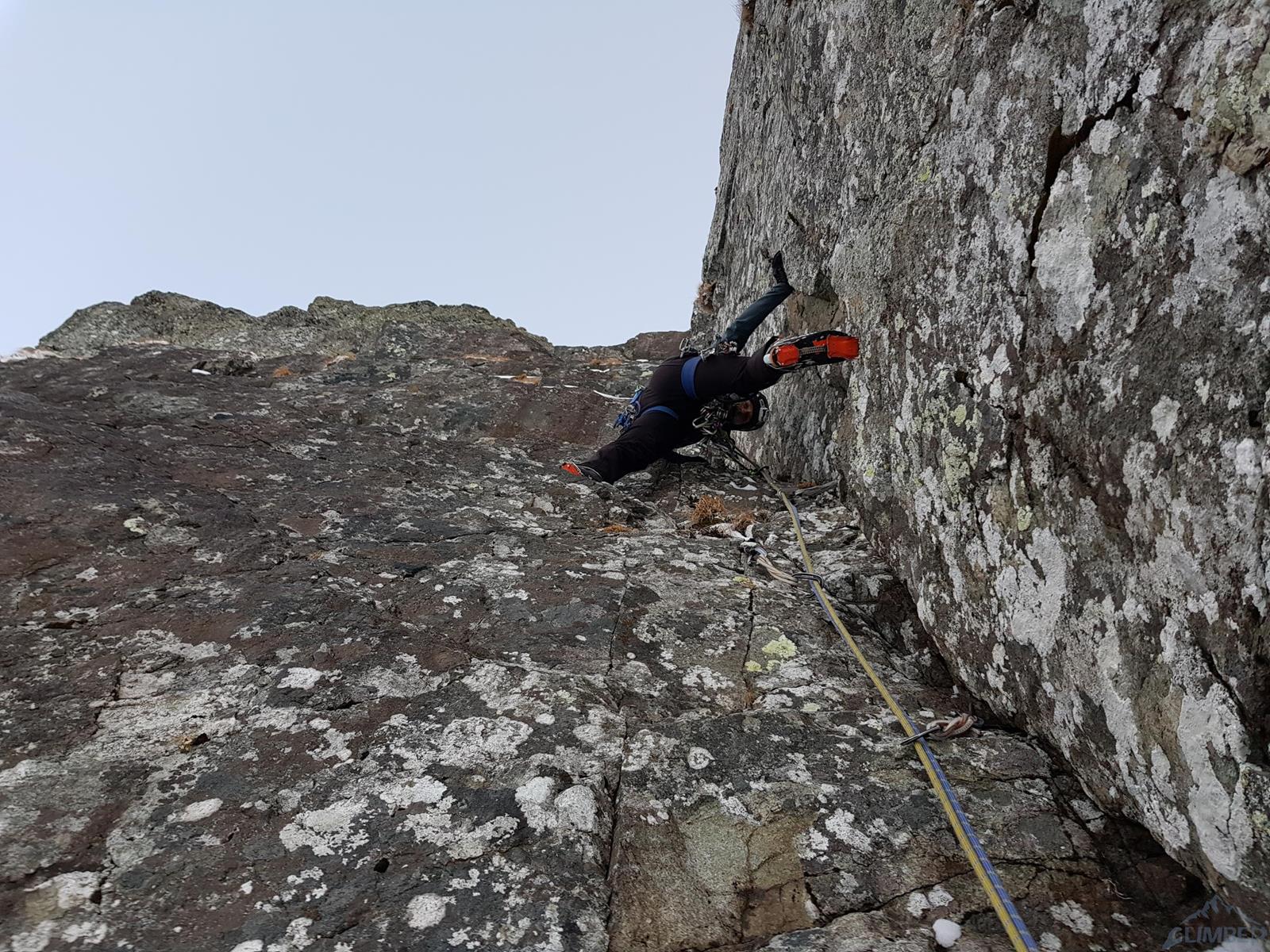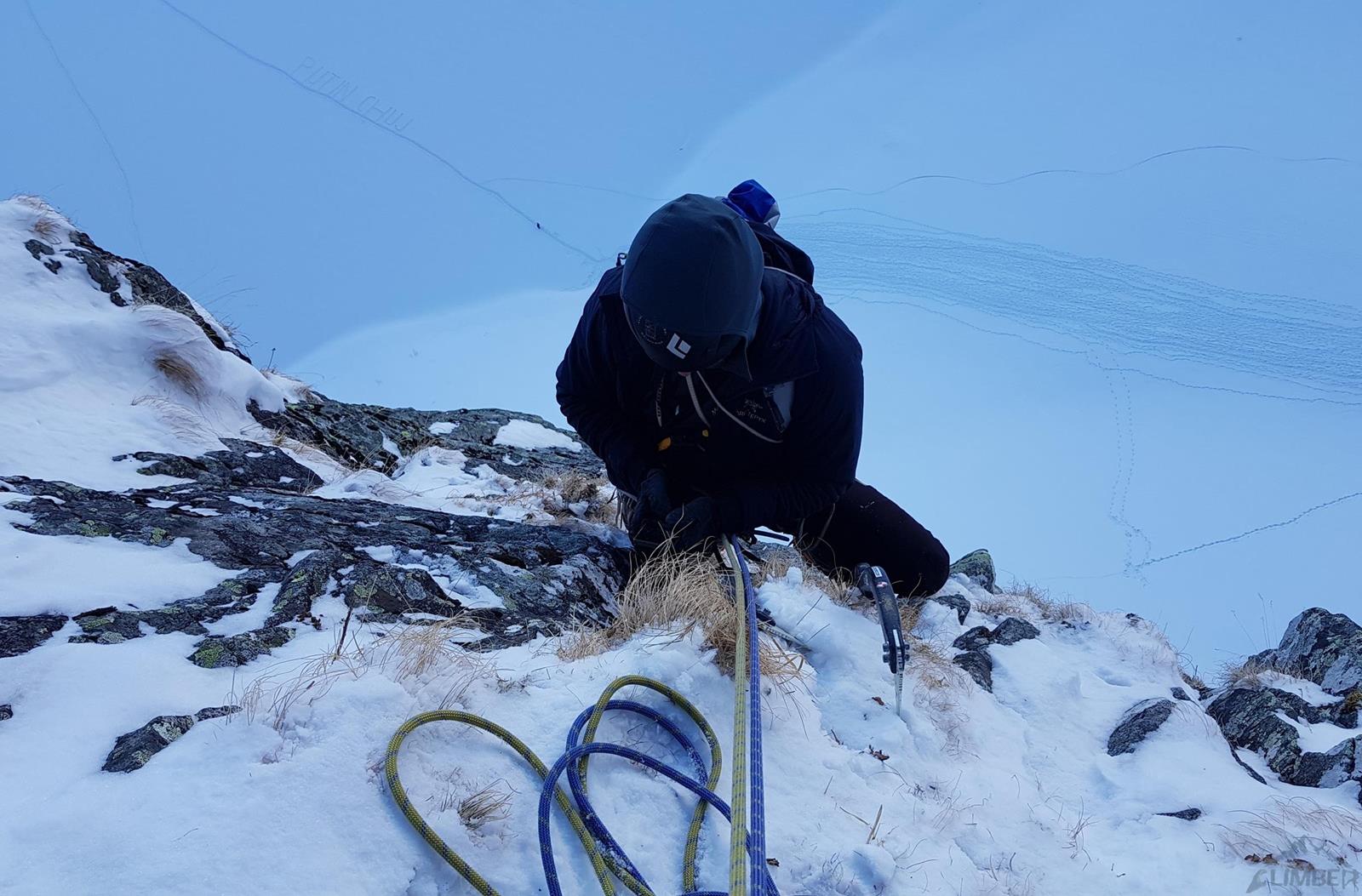 Ostatni odcinek (M5/5+, 30 m) okazuje się zresztą zaskakująco wymagający – zapewne również ze względu na zmęczenie oraz konieczność odśnieżania stopni i chwytów. Na prowadzeniu spędzam sporo czasu, dodatkowo bardzo stresując się by nie popełnić błędu – ewentualna powtórka oznaczałaby wspinanie już po zmroku, na co kompletnie nie mamy ochoty 😉. Po wyjściu na dużą półkę można skręcić do stanowiska zjazdowego po lewej stronie, upieram się jednak by pokonać jeszcze wyjściowy kominek po prawej – zgodnie z oryginalną linią.