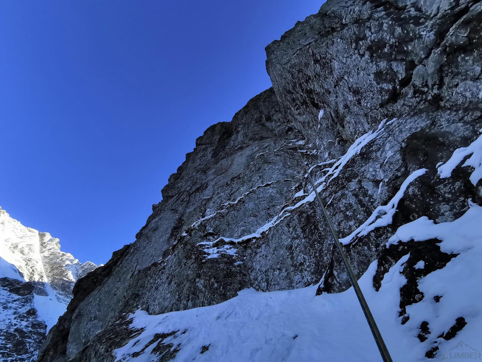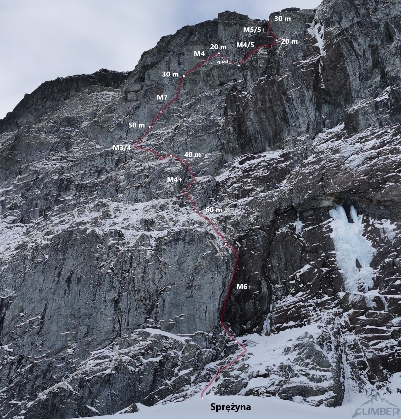 Wycena: M7   Wycena uzupełniająca: lato VI/VI+   Asekuracja: R2   Długość [m]: 250   Wyciągi: 7   Czas [h]: 9   Wystawa: NE   Ocena: 8/10   Komentarz: