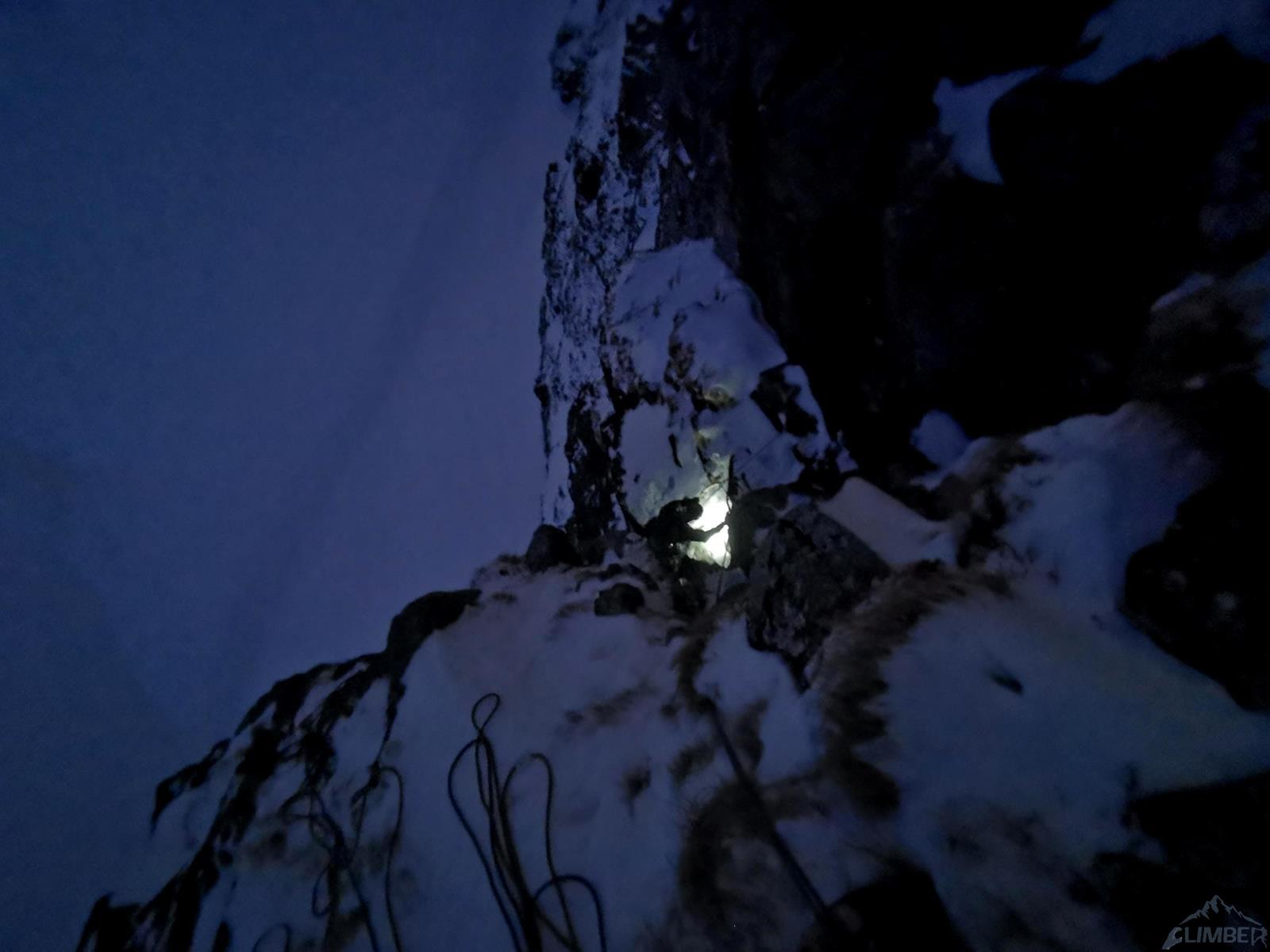 Kolega dociera do mnie już przy świetle czołówki i od razu zabieramy się do powrotu pod ścianę – najpierw zjeżdżamy na półkę poniżej, skąd już czterokrotnie prosto w dół. Dwa górne stanowiska radzę sprawdzać i back’upować – dwa haki i kostkę wyciągnęliśmy ręką, niższe są lepsze aczkolwiek część punktów nadawałaby się już do muzeum. Po powrocie na ziemię szybko biegniemy do schroniska by załapać się jeszcze na zasłużone piwo i kolację, po których czeka jeszcze najgorsza część przygody czyli powrót na parking. Tym razem jednak nie narzekamy – nie wypada po spełnieniu jednego z zimowych wspinaczkowych marzeń!