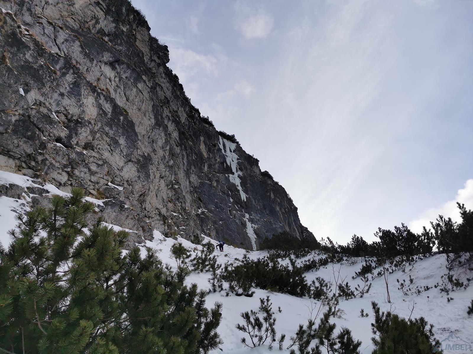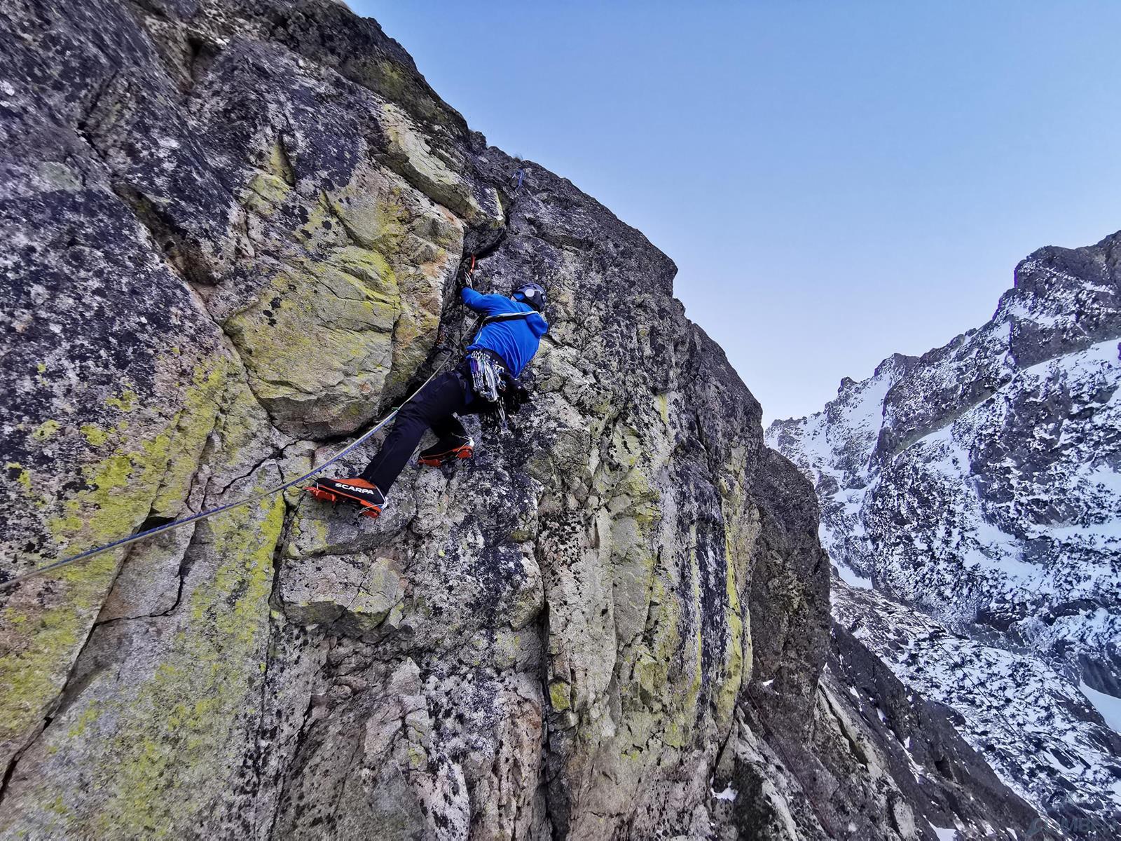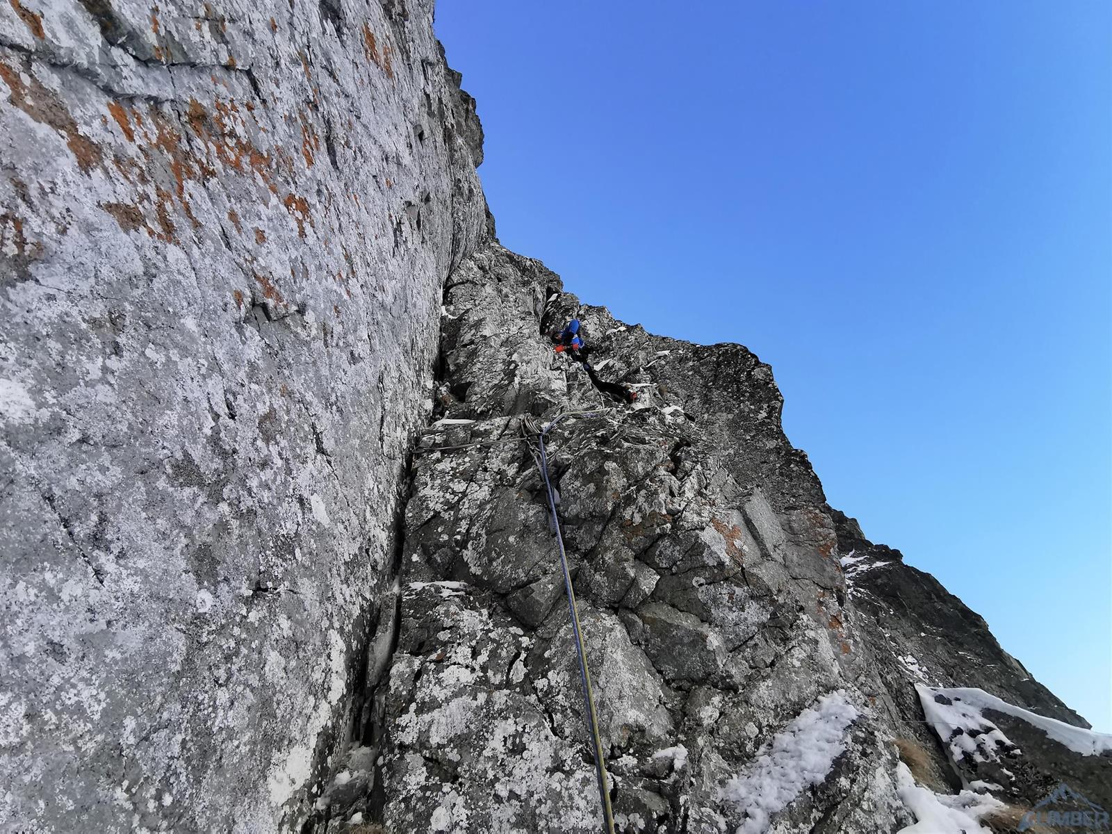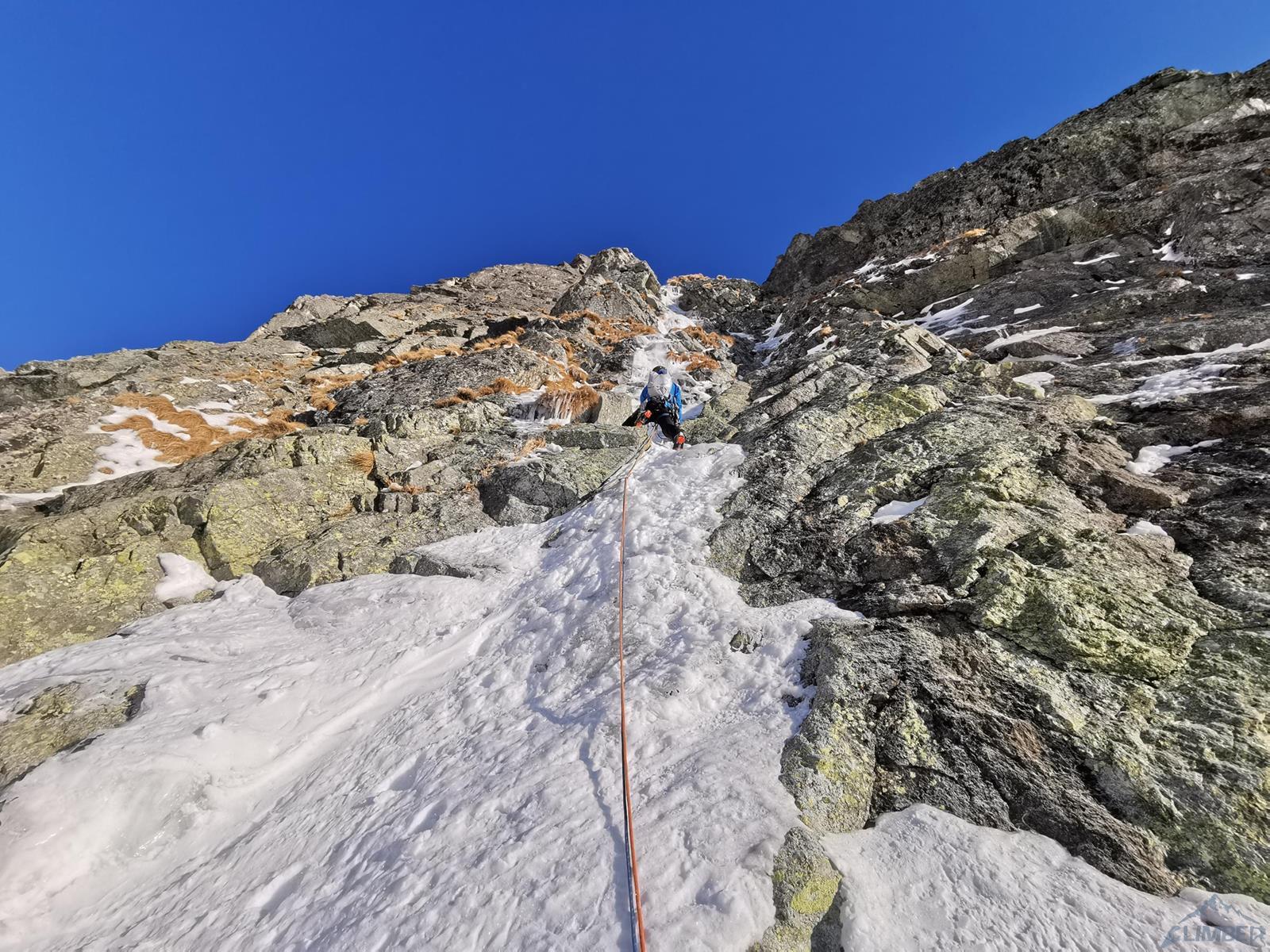 Tydzień później wybieramy się w sprawdzonym trójkowym składzie do Moka by spróbować Sprężny na Kotle Kazalnicy - pierwsza niespodzianka na miejscu to jednak spory mróz i ogrom świeżego śniegu, druga - zespół przed nami. Po kilku godzinach oczekiwania wycofujemy się i na pocieszenie biegniemy pod Bulę, gdzie odśnieżamy całkiem fajną jak na tą ścianę drogę Bladym świtem (M5+). Na Sprężynę (M7) wracamy już tydzień później - tym razem już bez Szymona i w lepszych warunkach, naszą "drogę sezonu" robimy w stylu RP po spodziewanej walce w trudnościach i niespodziewanej na ostatnim wyciągu. Odpocząć psychicznie przychodzi w kolejny weekend - po otrzymaniu informacji o świetnych warunkach na Motyce (WI3 M4) na Wysokiej, zabieram tam Anię, za nami dodatkowo podąża kilku klubowiczów. Podobnych warunków spodziewam się na innej ładnej alpiniadzie - Komarnickich (WI3 M3) na Zadnim Gerlachu, kilka dni później wybieramy się więc również i na nią.