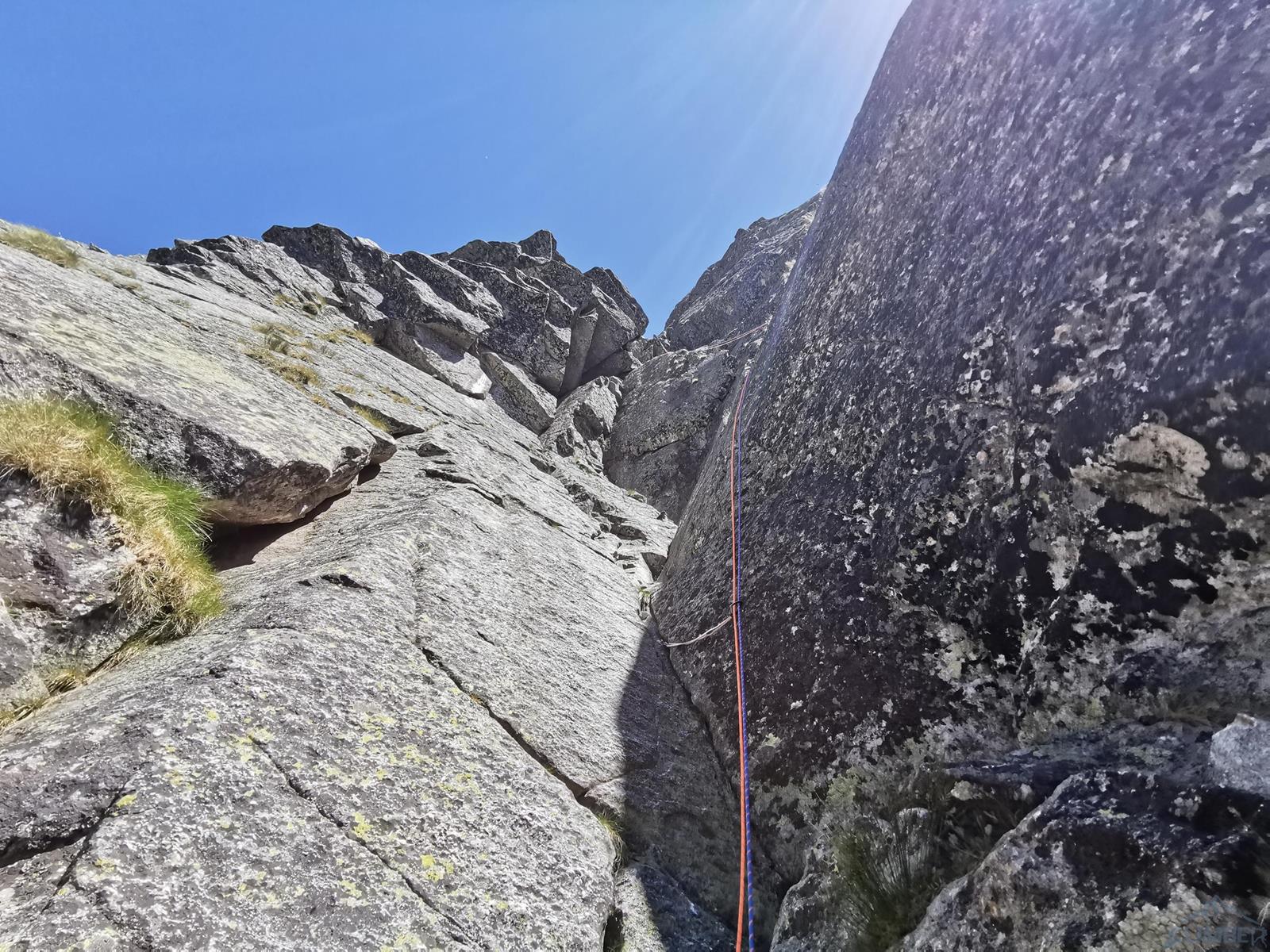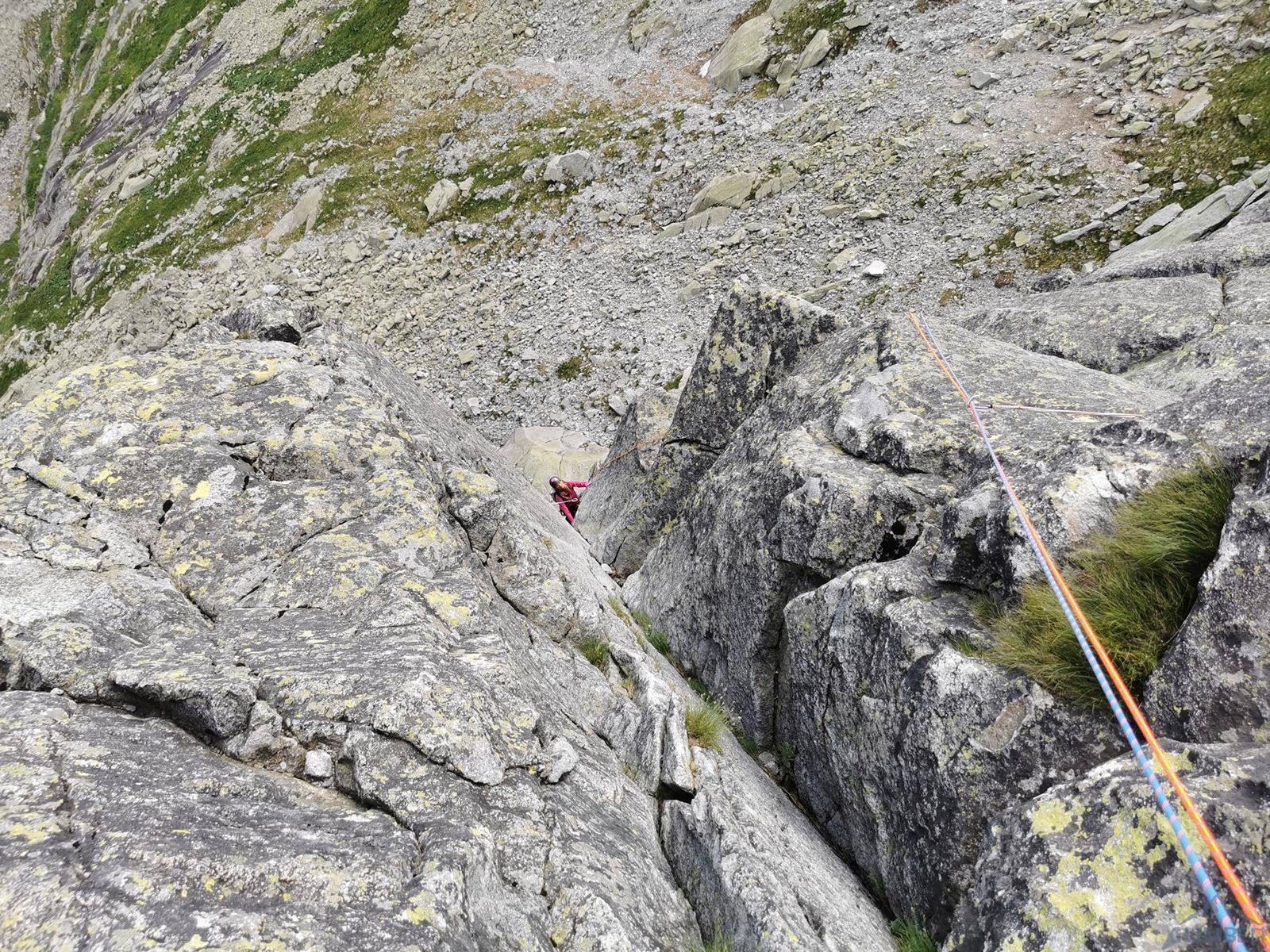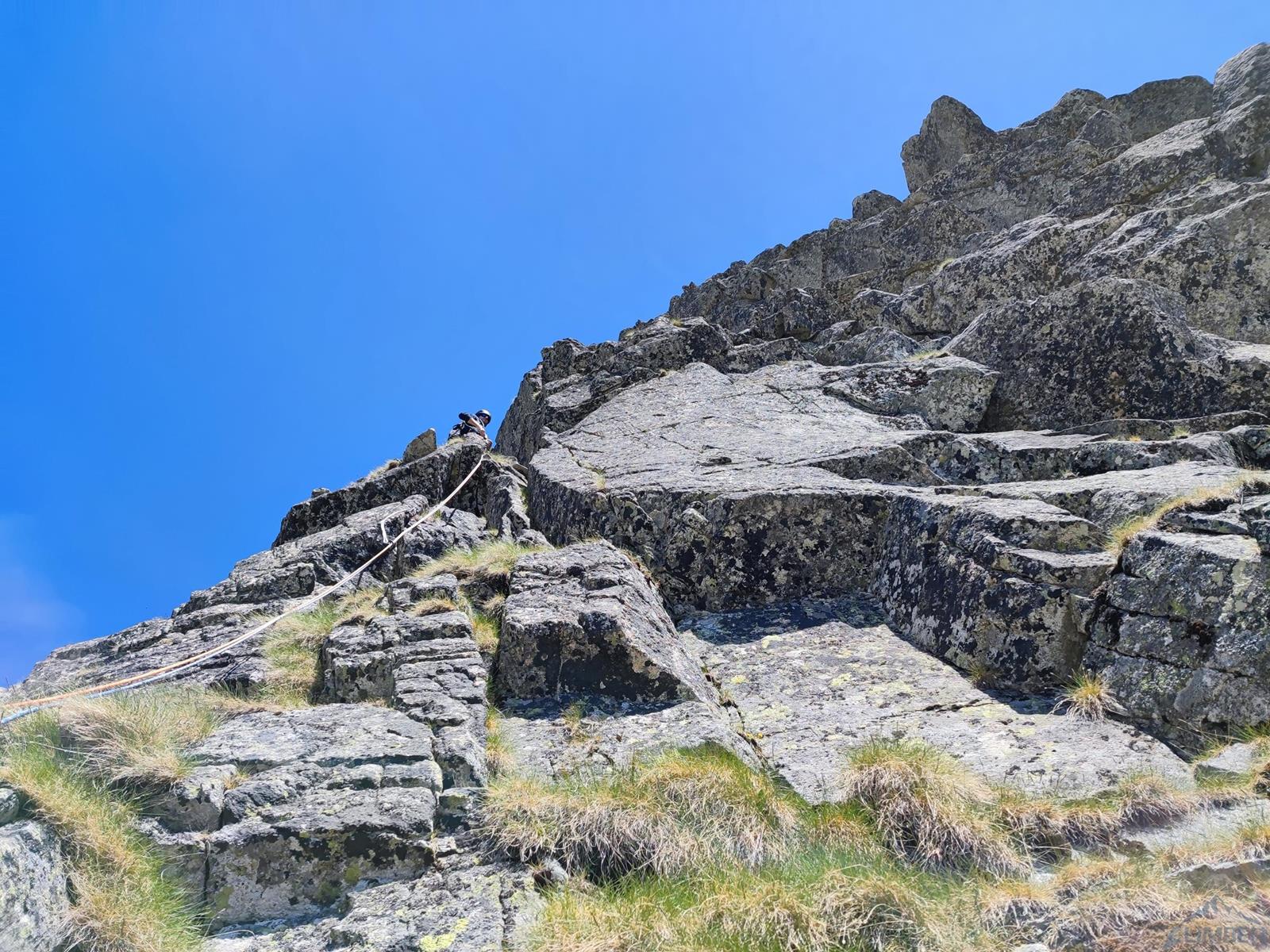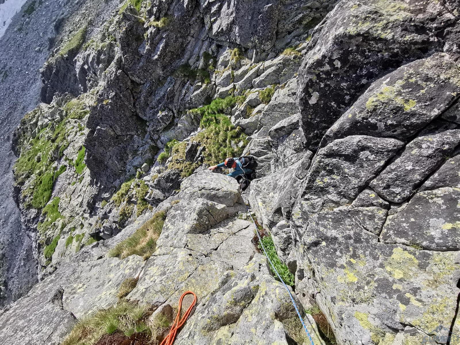 Niestety jak już wspominałem na wstępie, na następnym fragmencie czeka nas sporo „terenu rolniczego” – przebieramy buty na podejściówki i ruszamy dalej. Po około 80 metrach docieramy pod kopułę szczytową – tutaj możemy się zatrzymać lub od razu kontynuować groźnie wyglądającym kominkiem (II) po prawej, stanowisko znajdziemy zaraz po wyjściu z niego. Ostatni fragment to około 30 metrów wspinania po pięknych płytach grani wyprowadzającej na wierzchołek Wielkiej Szarpanej Turni – do wyboru mamy kilka wariantów (III/IV). Ze szczytu zjeżdżamy (blok z taśmami) około 20 metrów na trawiastą półkę, z której łatwo przechodzimy na ścieżkę biegnącą z przełączki do dużej poziomej rampy wyprowadzającej nas ze ściany. Zachęcam do powtórzeń, mając dobry opis drogę robi się bardzo szybko - warto więc pamiętać o niej przy okazji wspinania na innych, dużo bardziej popularnych liniach na ścianie południowej.