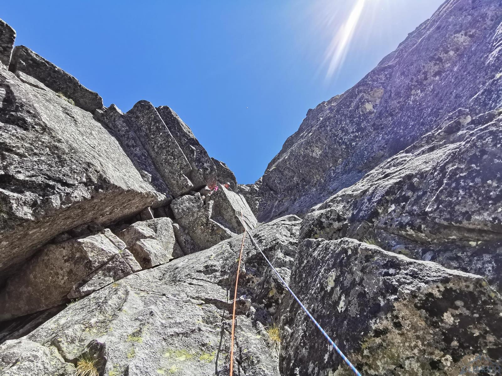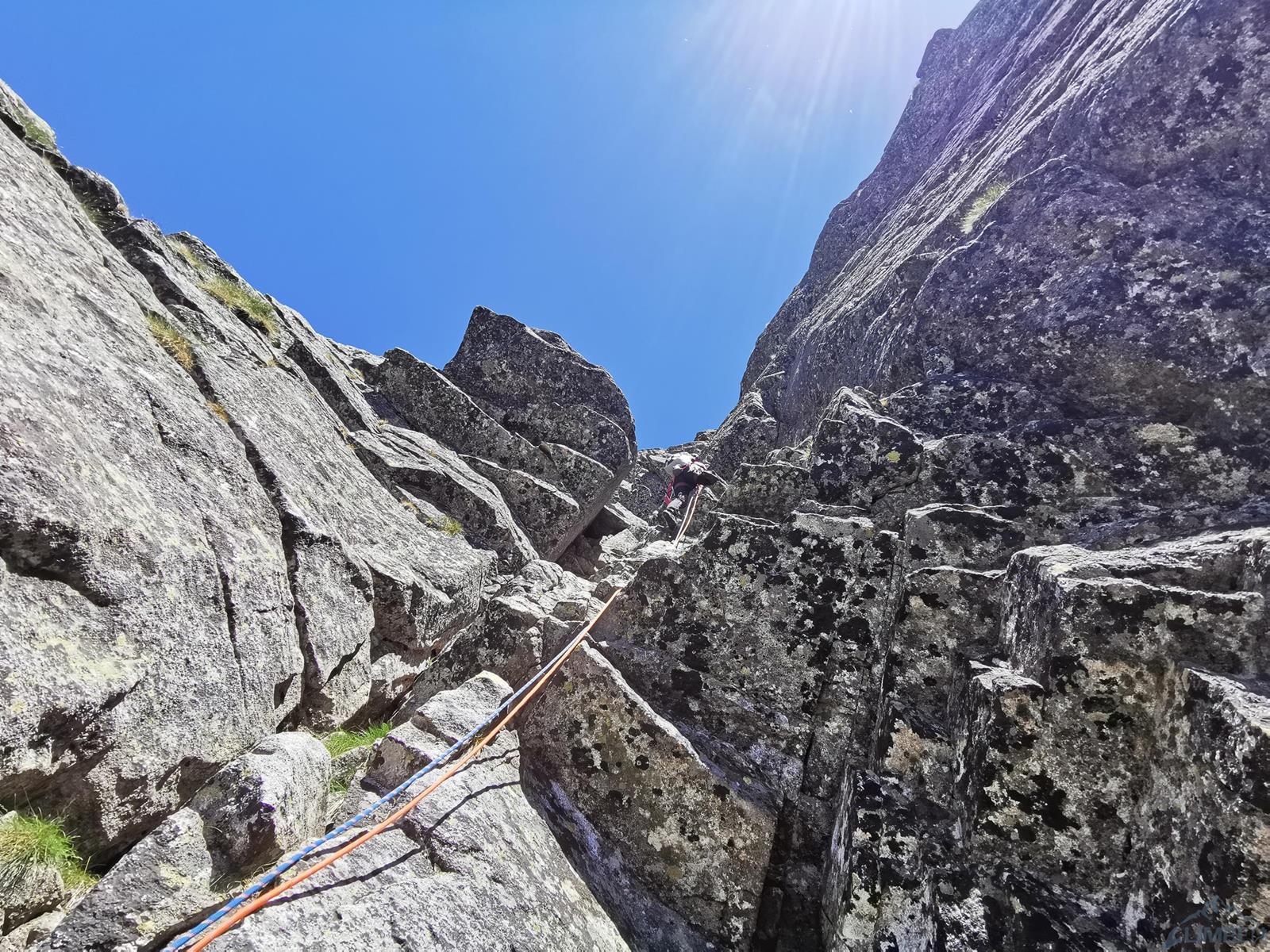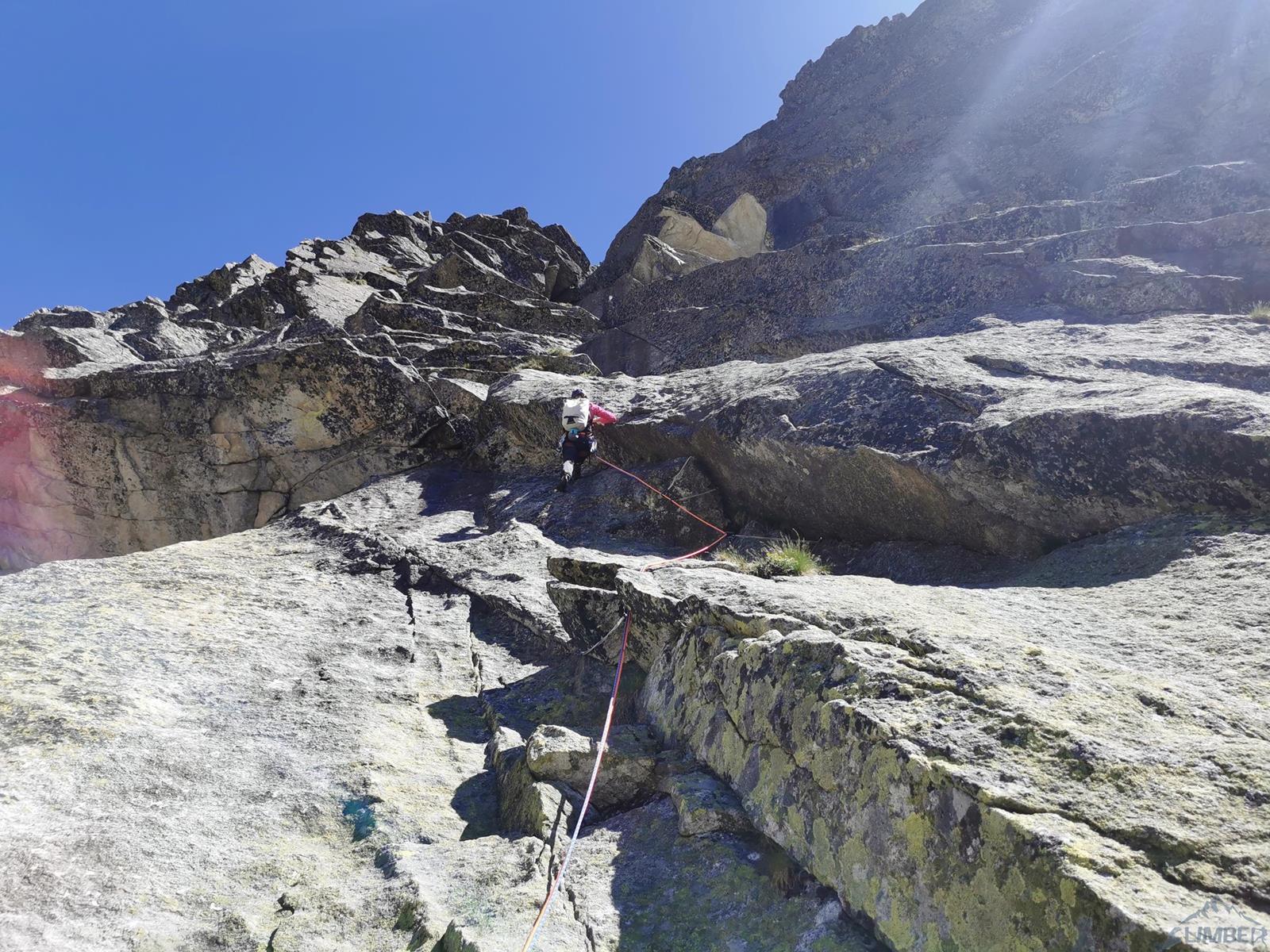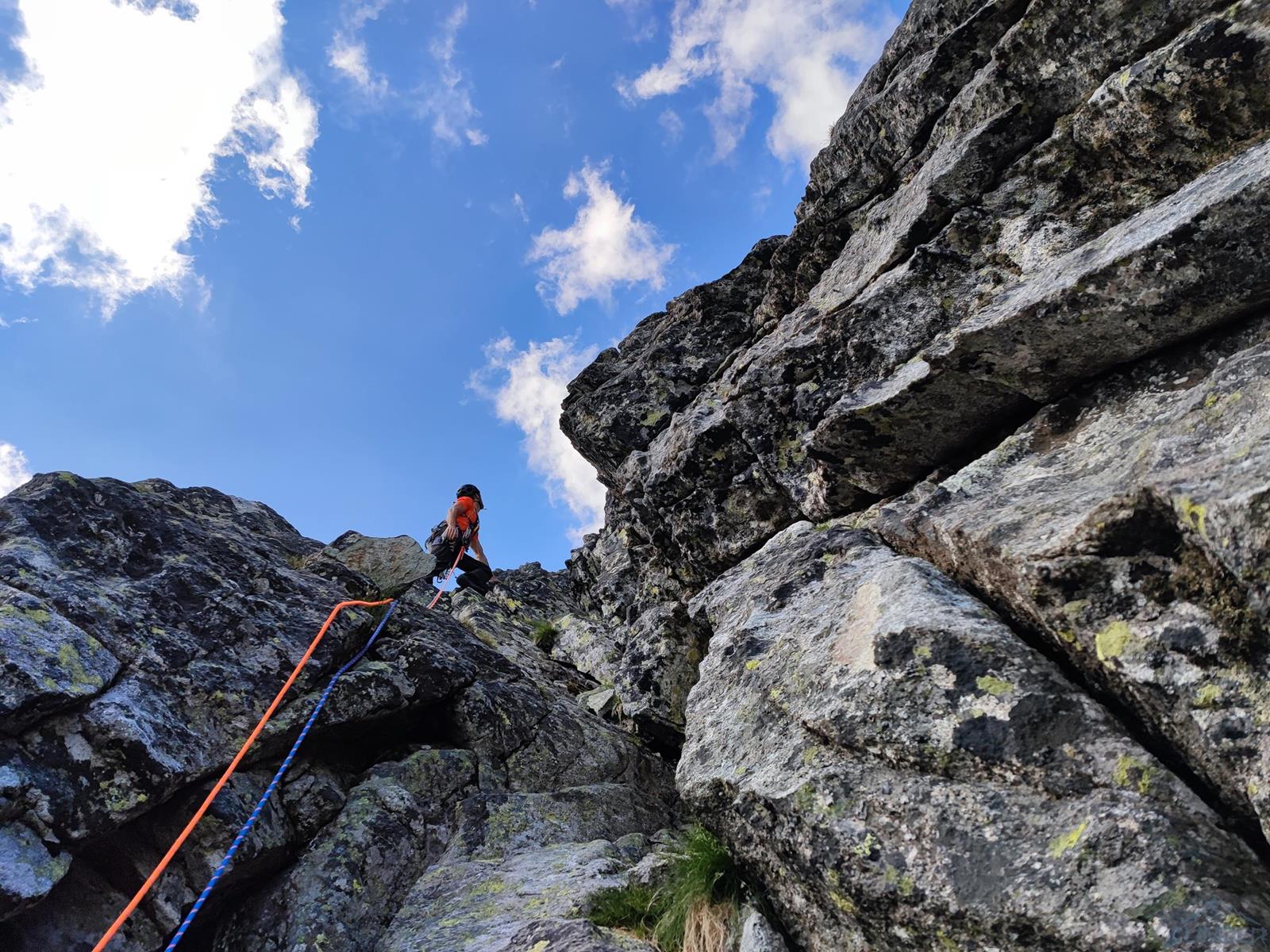Niestety jak już wspominałem na wstępie, na następnym fragmencie czeka nas sporo „terenu rolniczego” – przebieramy buty na podejściówki i ruszamy dalej. Po około 80 metrach docieramy pod kopułę szczytową – tutaj możemy się zatrzymać lub od razu kontynuować groźnie wyglądającym kominkiem (II) po prawej, stanowisko znajdziemy zaraz po wyjściu z niego. Ostatni fragment to około 30 metrów wspinania po pięknych płytach grani wyprowadzającej na wierzchołek Wielkiej Szarpanej Turni – do wyboru mamy kilka wariantów (III/IV). Ze szczytu zjeżdżamy (blok z taśmami) około 20 metrów na trawiastą półkę, z której łatwo przechodzimy na ścieżkę biegnącą z przełączki do dużej poziomej rampy wyprowadzającej nas ze ściany. Zachęcam do powtórzeń, mając dobry opis drogę robi się bardzo szybko - warto więc pamiętać o niej przy okazji wspinania na innych, dużo bardziej popularnych liniach na ścianie południowej.
