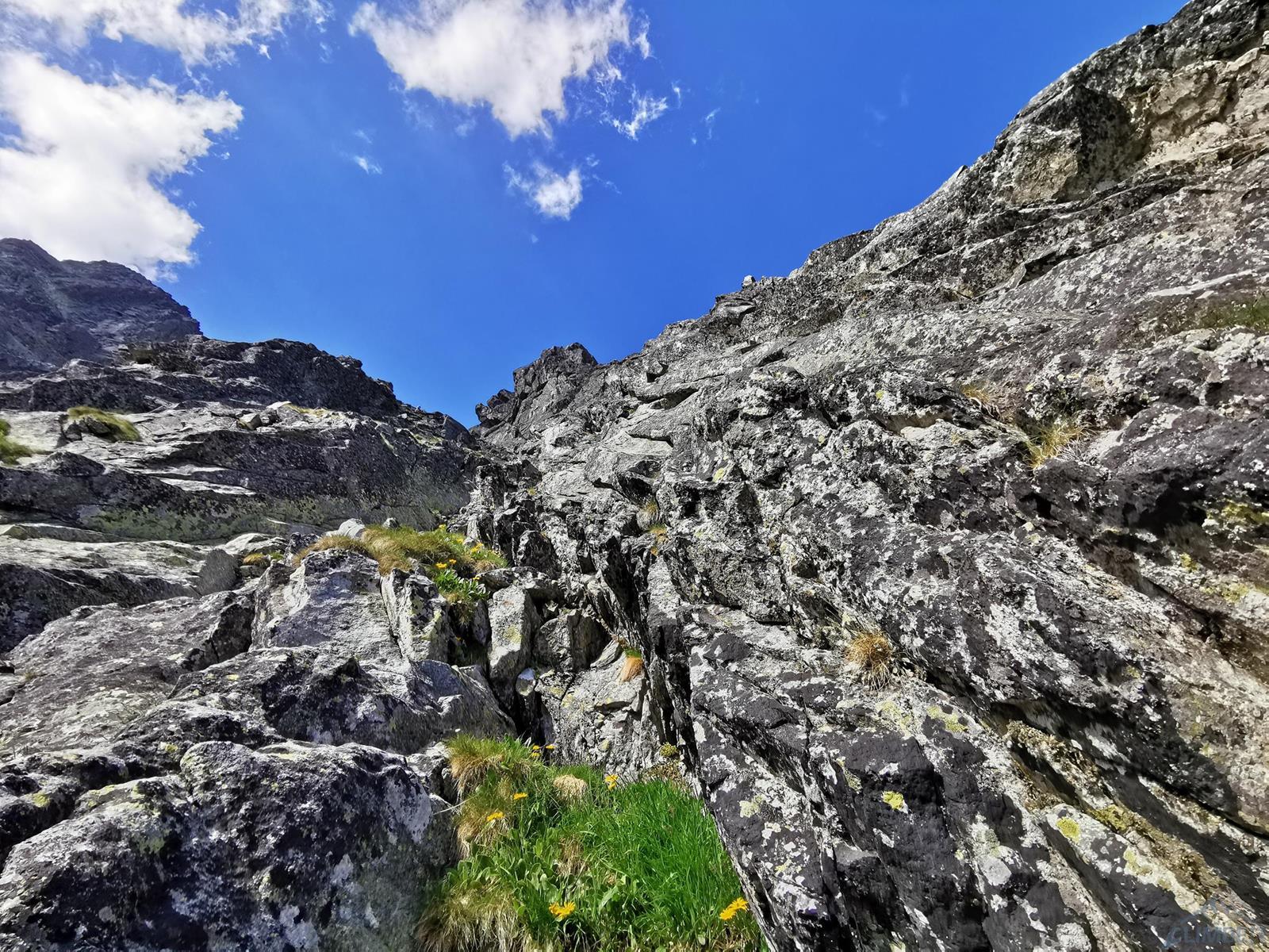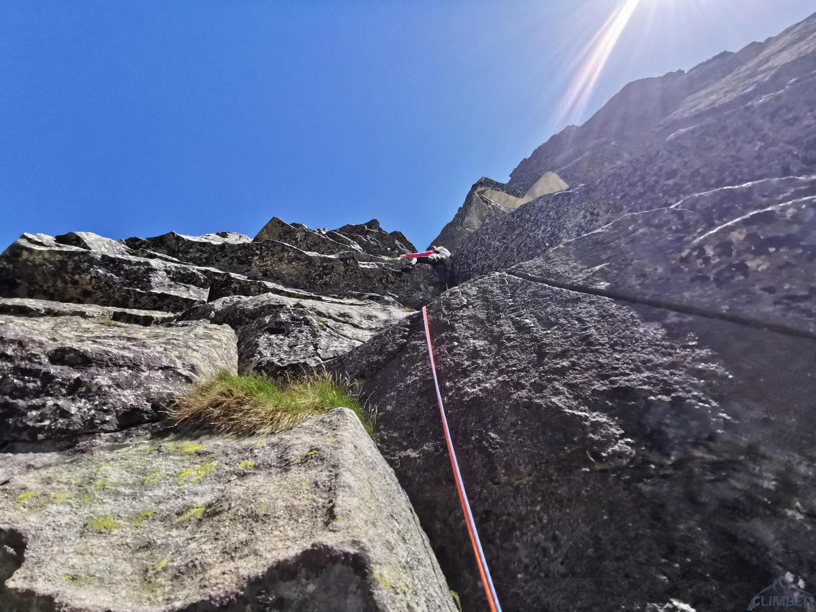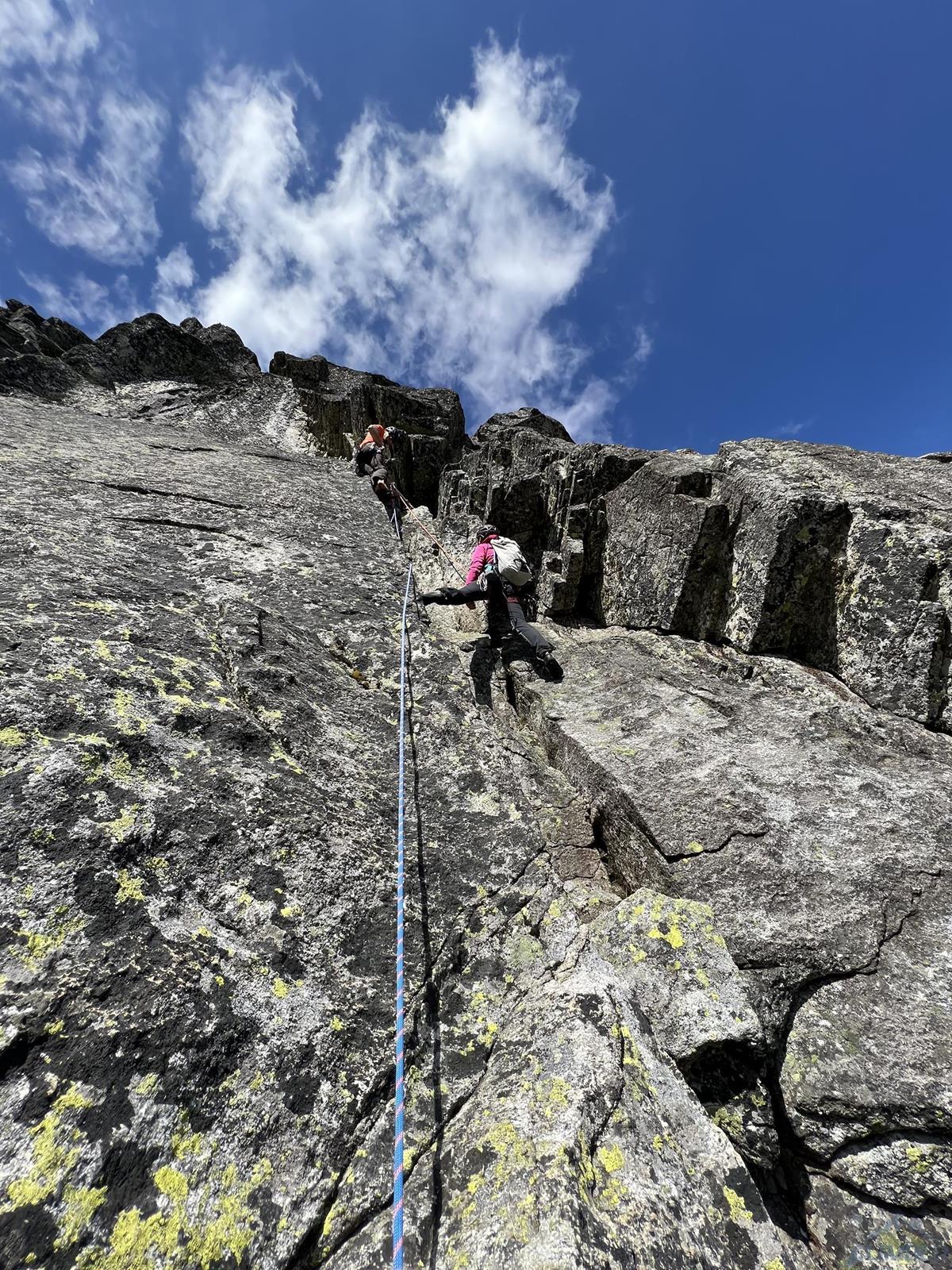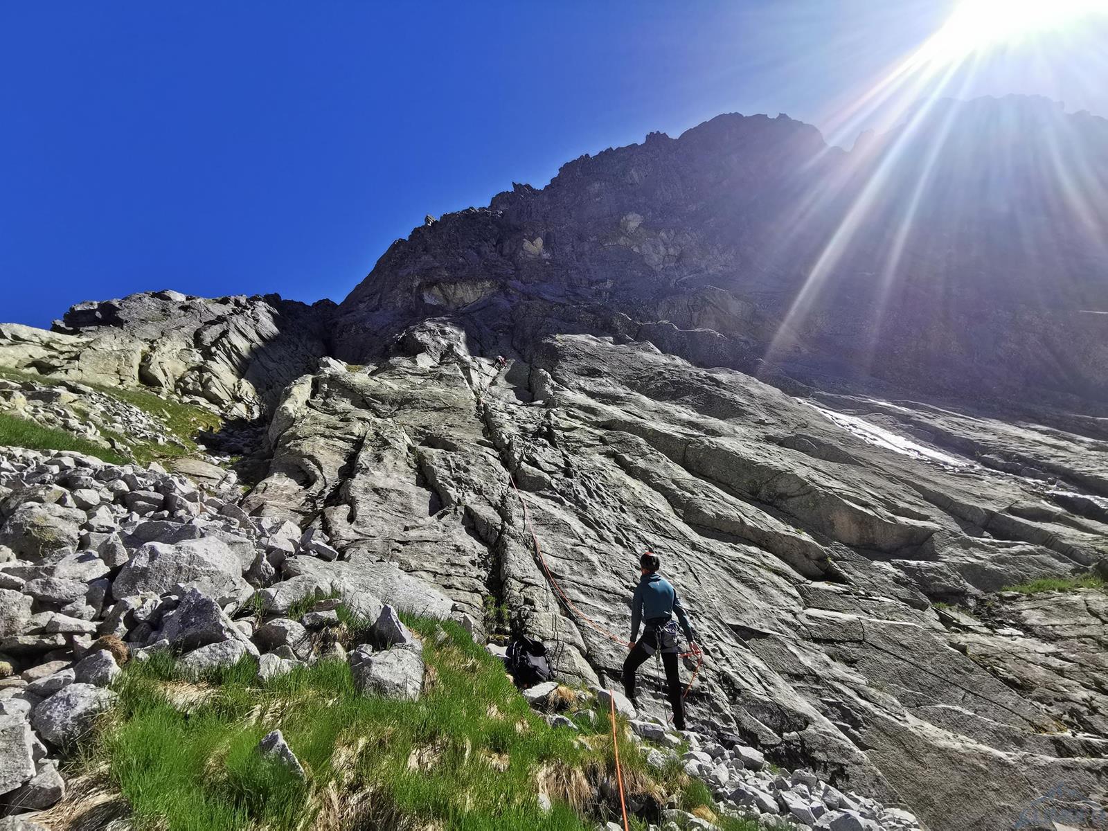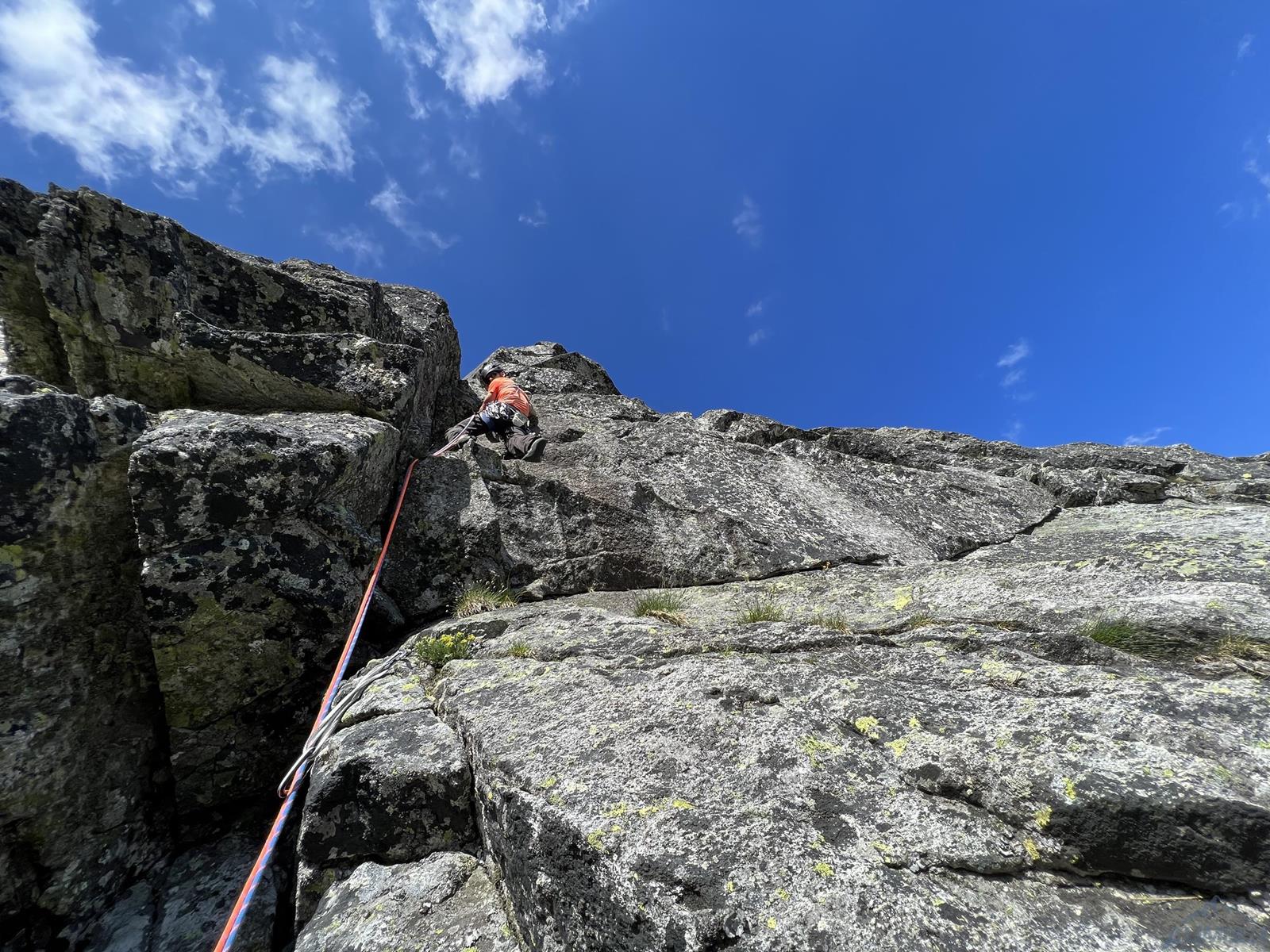 Niestety jak już wspominałem na wstępie, na następnym fragmencie czeka nas sporo „terenu rolniczego” – przebieramy buty na podejściówki i ruszamy dalej. Po około 80 metrach docieramy pod kopułę szczytową – tutaj możemy się zatrzymać lub od razu kontynuować groźnie wyglądającym kominkiem (II) po prawej, stanowisko znajdziemy zaraz po wyjściu z niego. Ostatni fragment to około 30 metrów wspinania po pięknych płytach grani wyprowadzającej na wierzchołek Wielkiej Szarpanej Turni – do wyboru mamy kilka wariantów (III/IV). Ze szczytu zjeżdżamy (blok z taśmami) około 20 metrów na trawiastą półkę, z której łatwo przechodzimy na ścieżkę biegnącą z przełączki do dużej poziomej rampy wyprowadzającej nas ze ściany. Zachęcam do powtórzeń, mając dobry opis drogę robi się bardzo szybko - warto więc pamiętać o niej przy okazji wspinania na innych, dużo bardziej popularnych liniach na ścianie południowej.